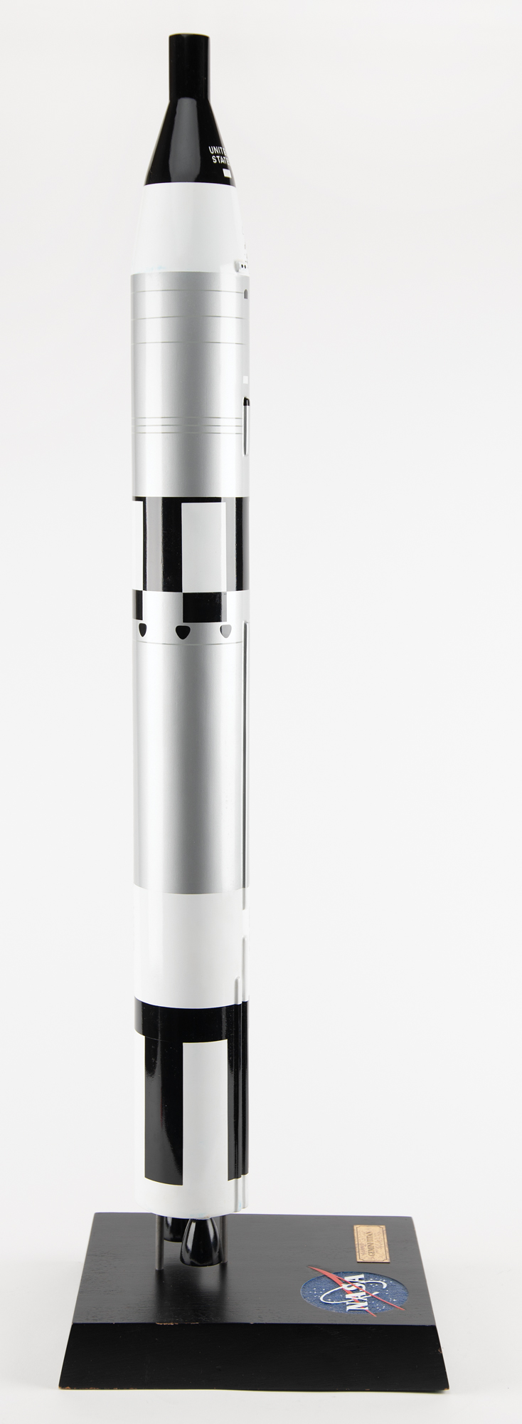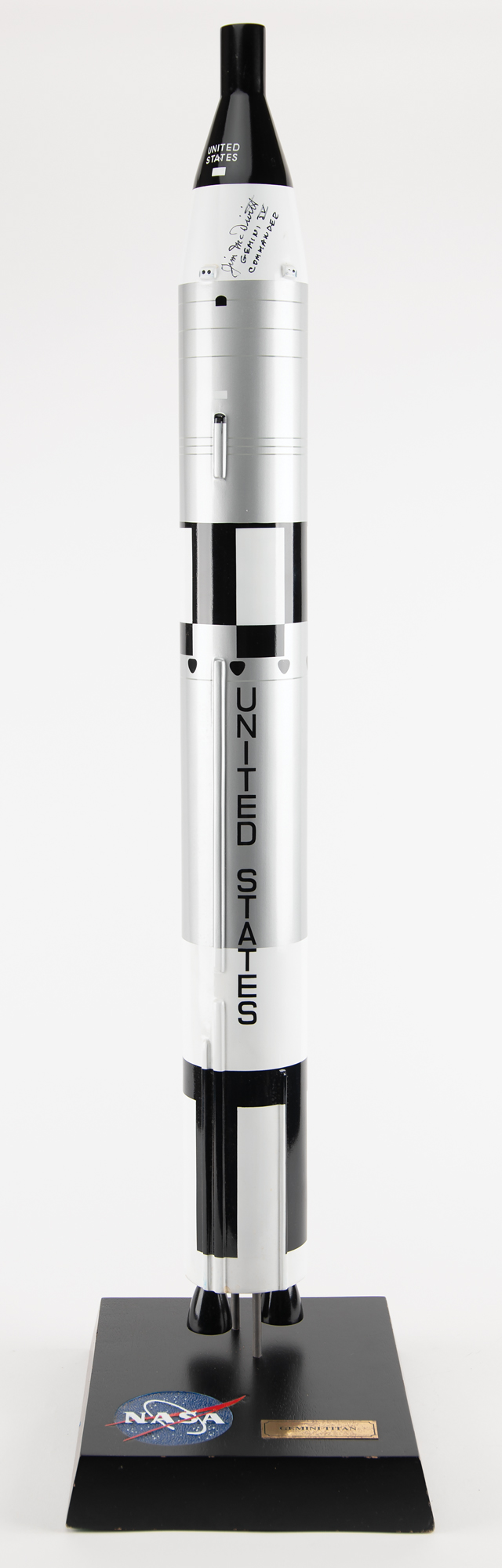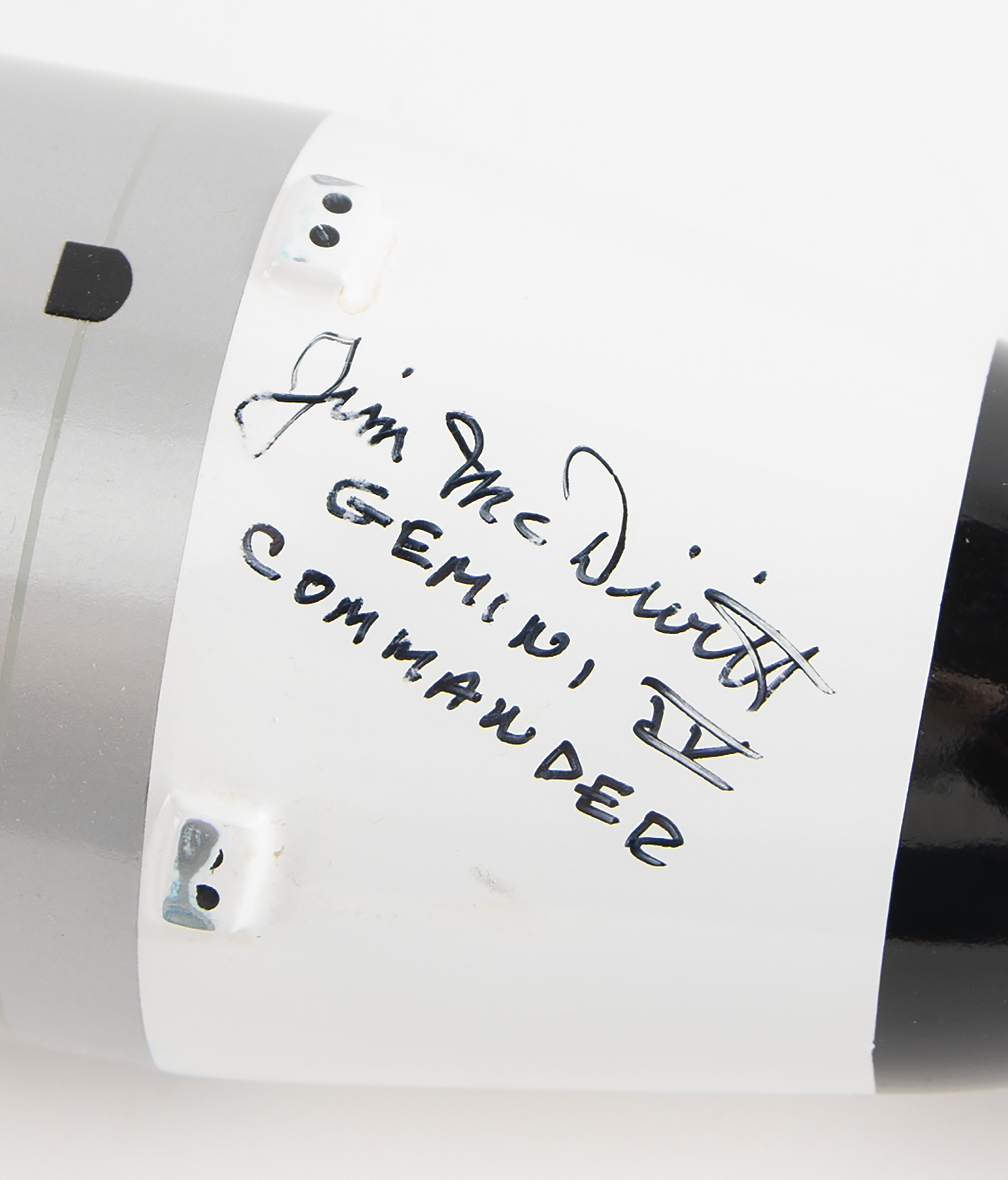 Impressive 1:36 scale composite model of the Gemini-Titan launch vehicle, standing 35.5˝ tall and 3.5˝ in diameter, signed on the top in black felt tip, "Jim McDivitt, Gemini IV, Commander." Complete with its black wooden base, featuring a plaque and hand-carved NASA 'meatball' logo. In fine condition.