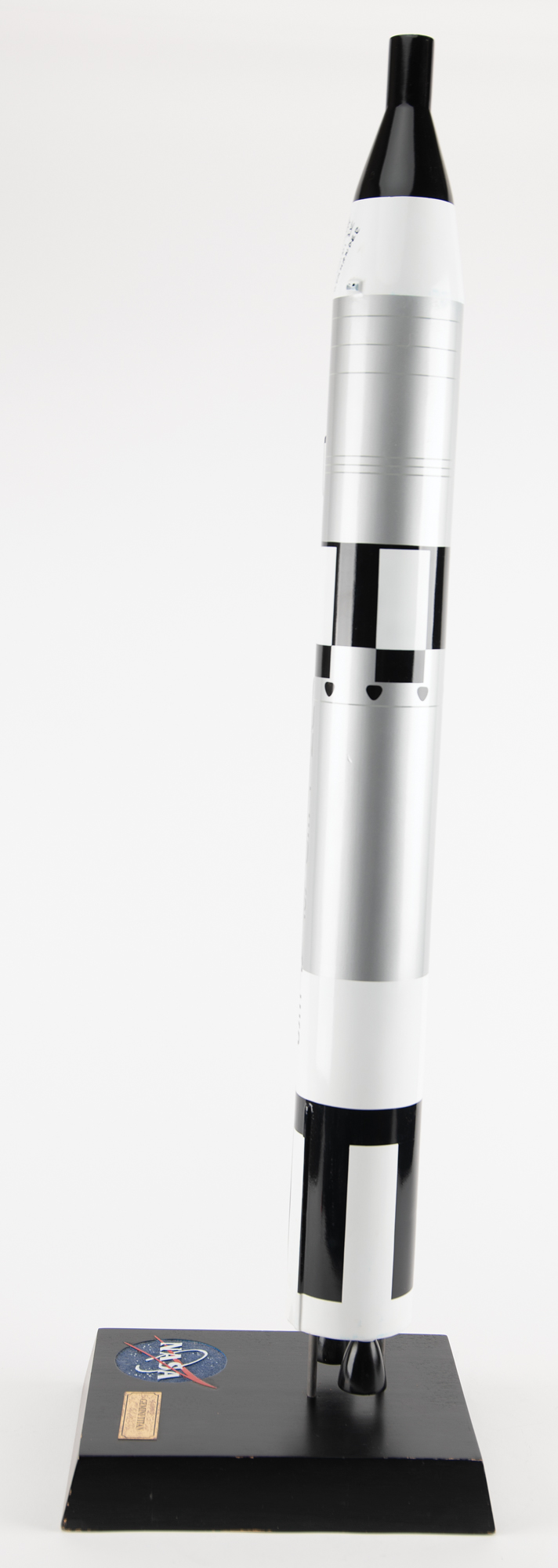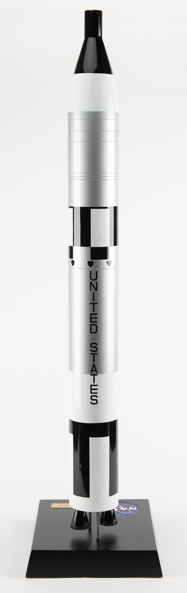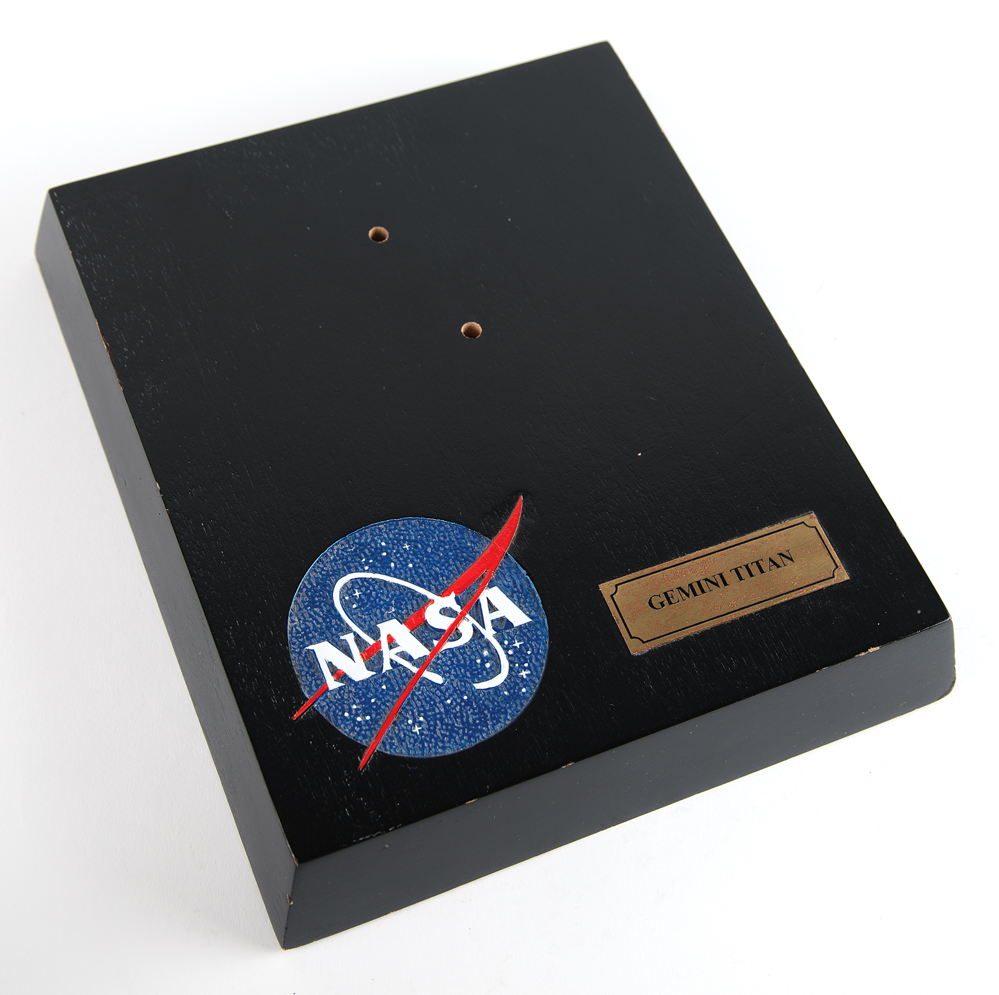 Impressive 1:36 scale composite model of the Gemini-Titan launch vehicle, standing 35.5˝ tall and 3.5˝ in diameter, signed on the top in black felt tip, "Jim McDivitt, Gemini IV, Commander." Complete with its black wooden base, featuring a plaque and hand-carved NASA 'meatball' logo. In fine condition.