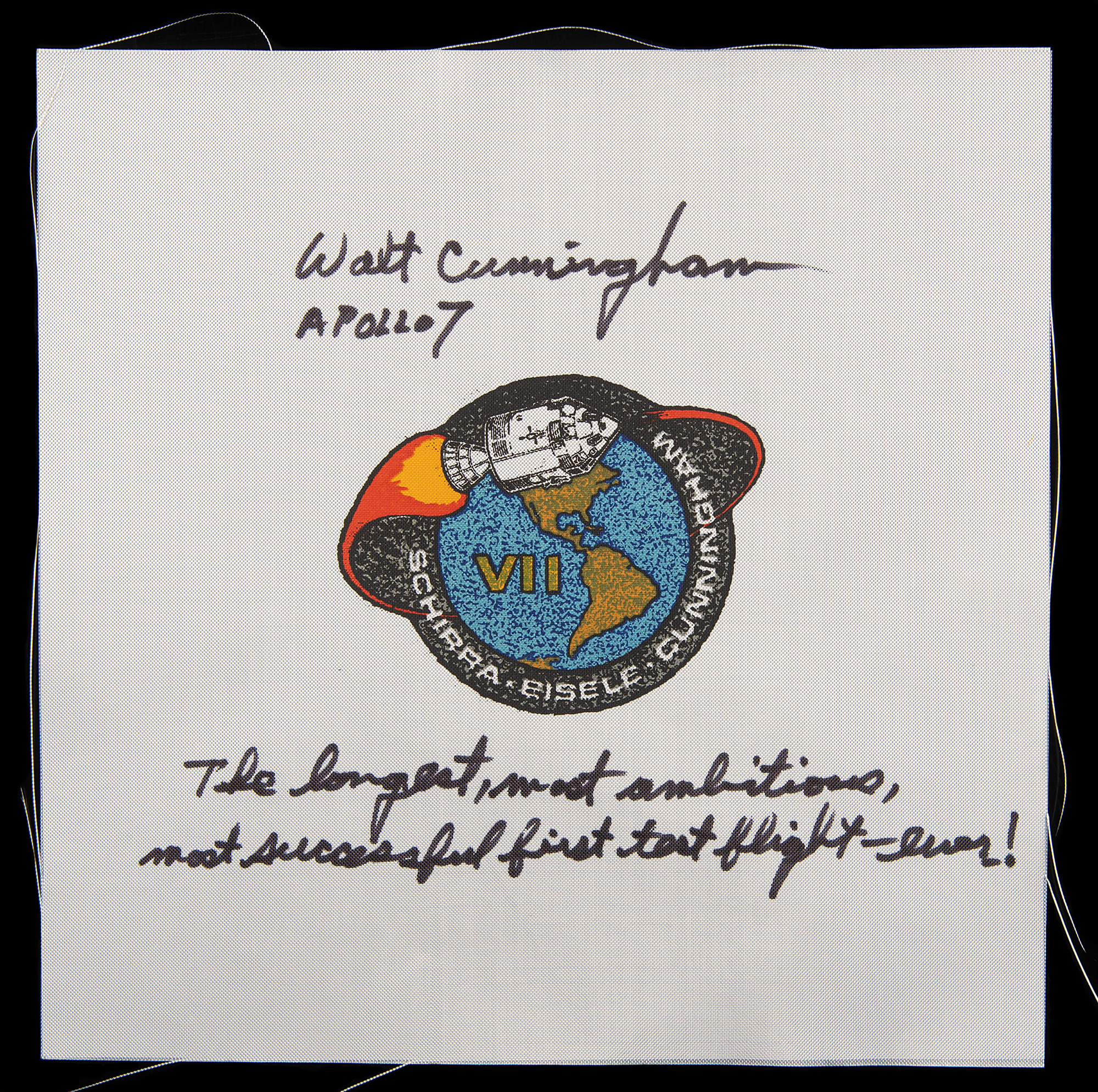 Appealing 9 x 9 swatch of Beta cloth bearing the Apollo 7 mission insignia, signed in black felt tip, "Walt Cunningham, Apollo 7, The longest, most ambitious, most successful first test flight—ever!" In very fine condition.