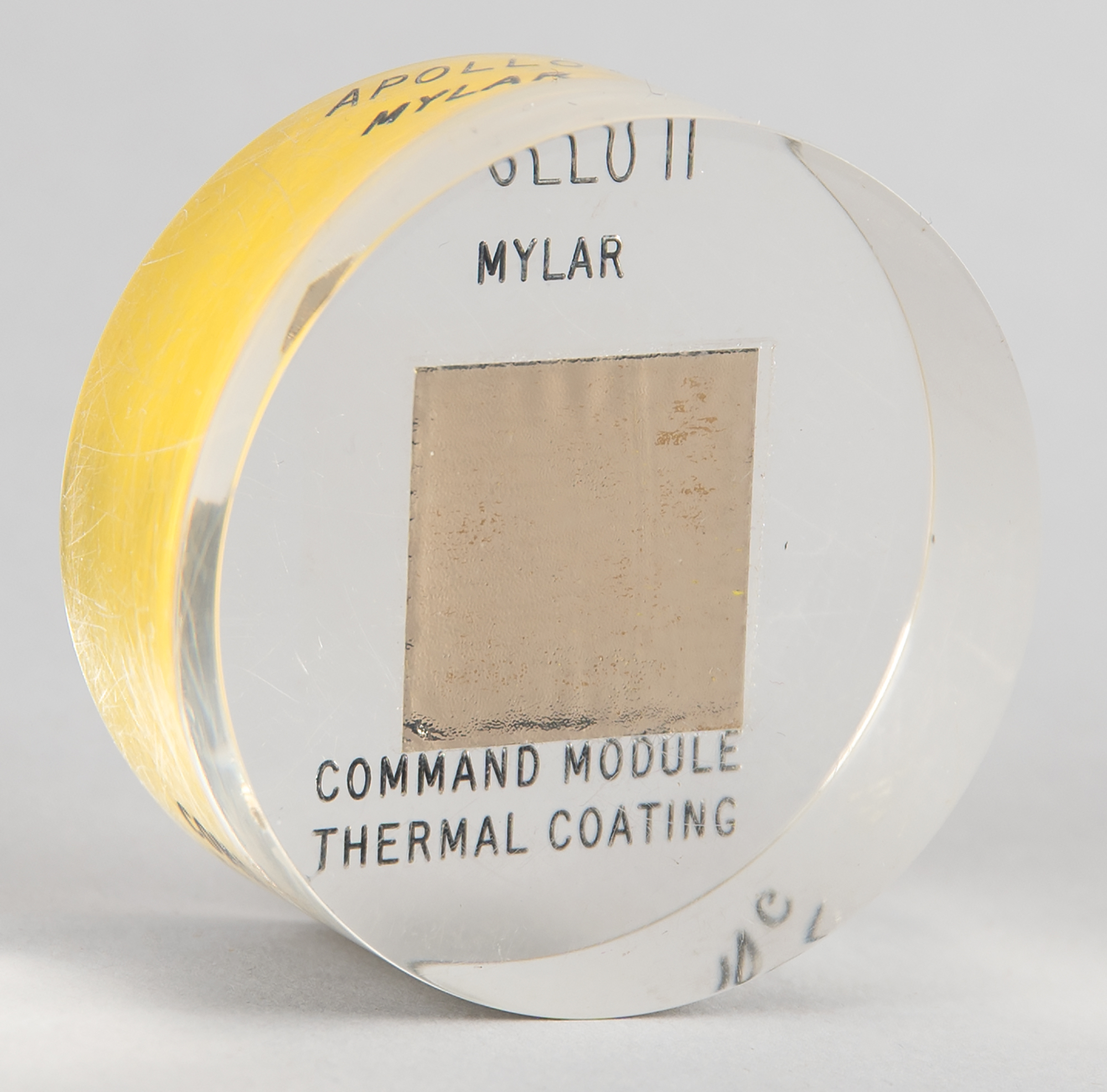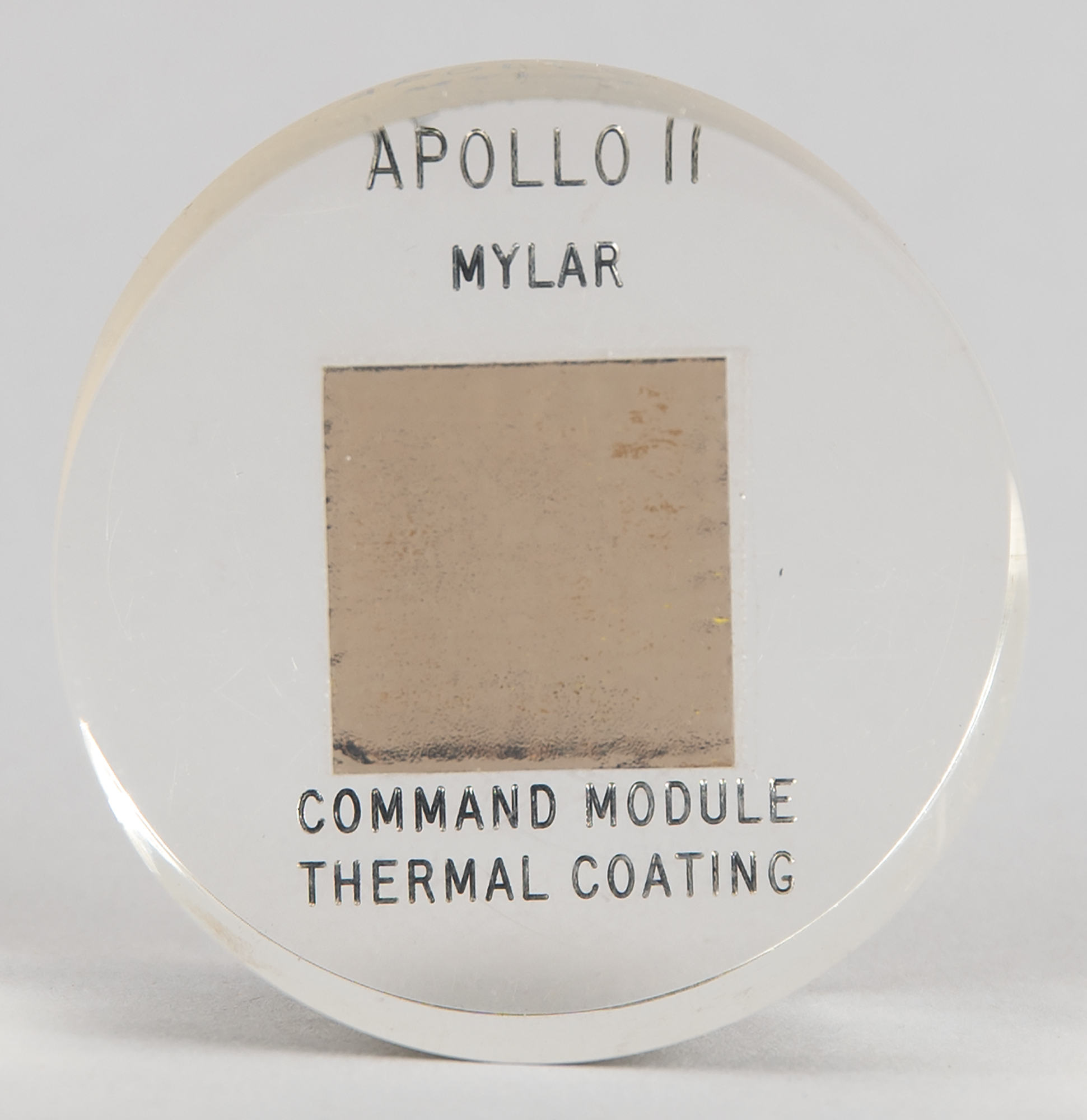 Large flown 1˝ x 1˝ swatch of Mylar thermal coating recovered from the Apollo 11 command module. Encased in a circular 2.25˝ Lucite display with imprinted text: “Apollo 11 Mylar Command Module Thermal Coating.” In fine condition.