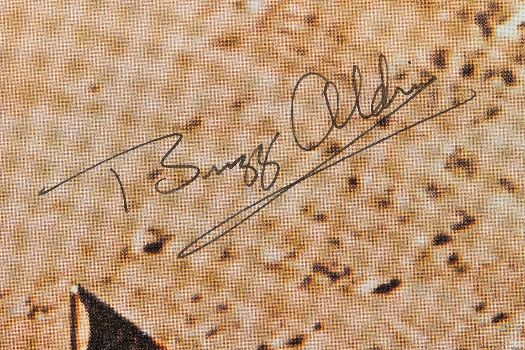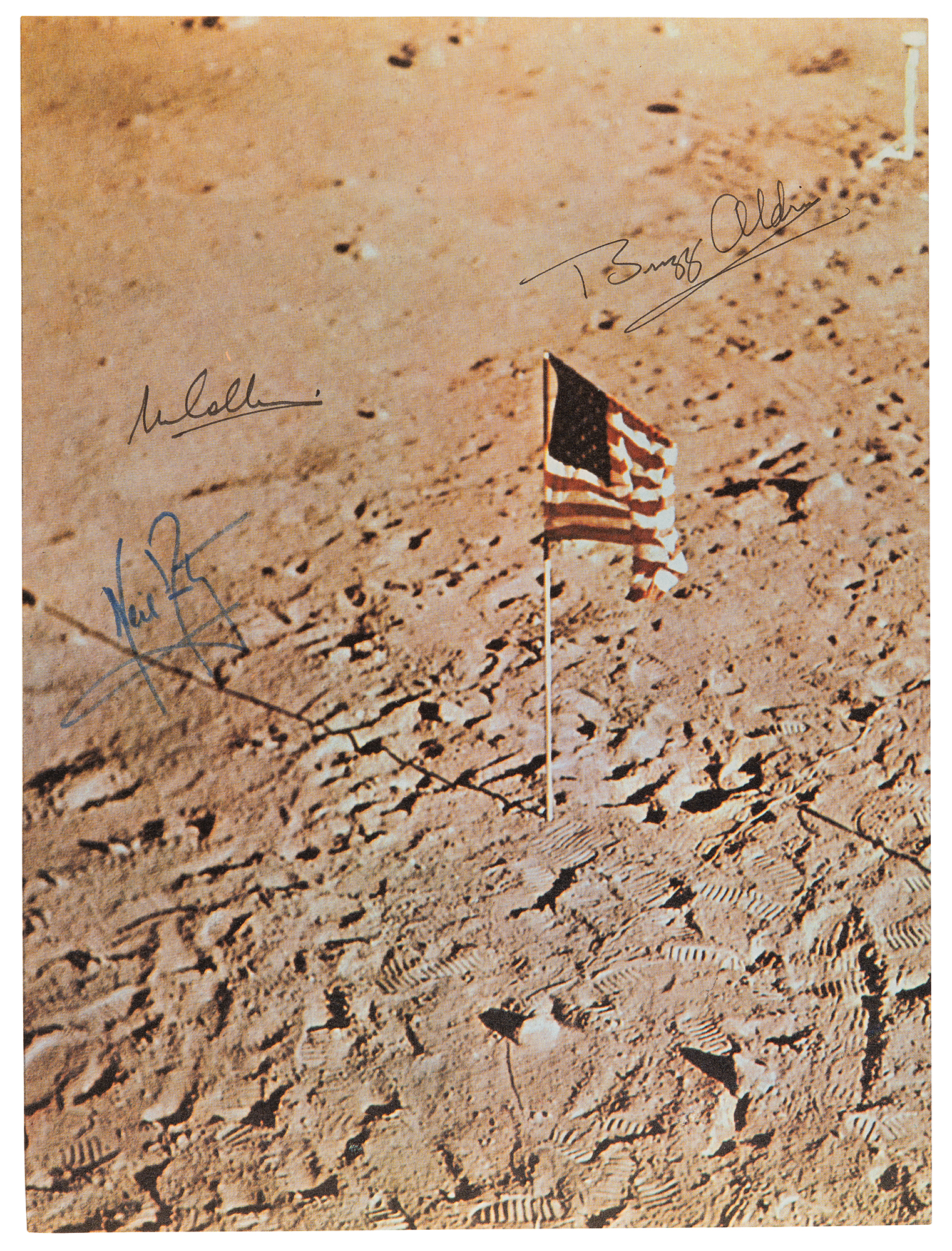 Attractive color 8 x 10.75 book photo of the American flag left in the Sea of Tranquility after the historic Apollo 11 mission, signed in blue felt tip by, “Neil Armstrong,” and in black ink, “Buzz Aldrin” and “M. Collins.” In very fine condition. An uncommon crew-signed image that evokes America’s victory in the Space Race.