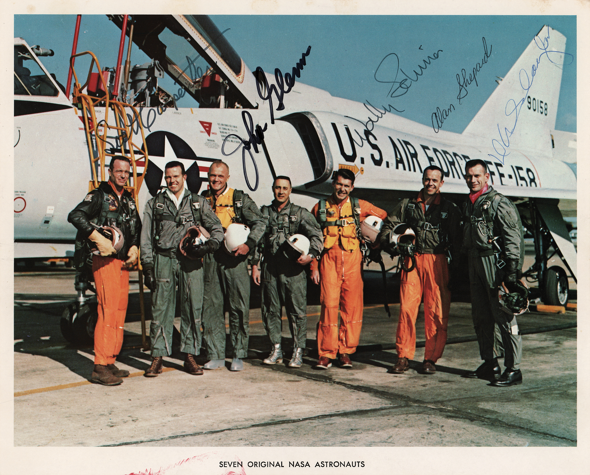 Official color 10 x 8 NASA lithograph of the original Mercury astronauts posing in front of a Convair F106-B aircraft at Langley Air Force Base on January 20, 1961, signed over their respective images in felt tip or ballpoint, “Scott Carpenter,” “John Glenn,” “Wally Schirra,” “Alan Shepard,” and “DK Slayton.” In fine condition, with a slight red stain in the bottom border.