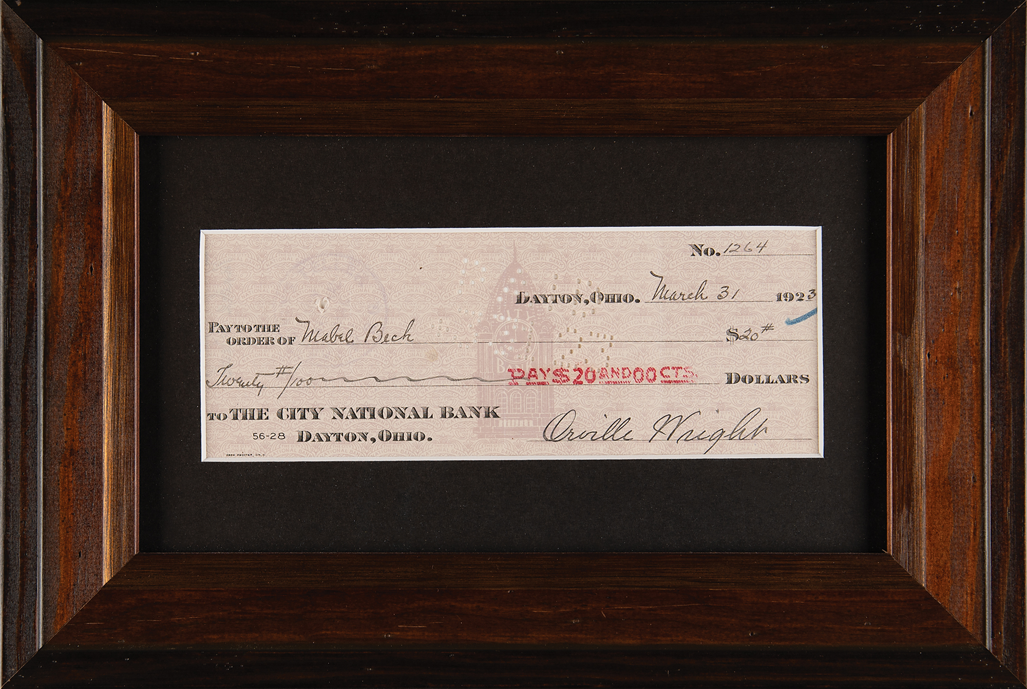 The City National Bank check, 7.75 x 3, filled out and signed by Wright, "Orville Wright," payable to Mabel Beck for $20, March 31, 1923. Matted and framed to an overall size of 12.5 x 8.5. In fine condition. Mabel Beck was Orville Wright's devoted friend and personal secretary for nearly 40 years. Accompanied by a full letter of authenticity from Beckett Authentication Services.