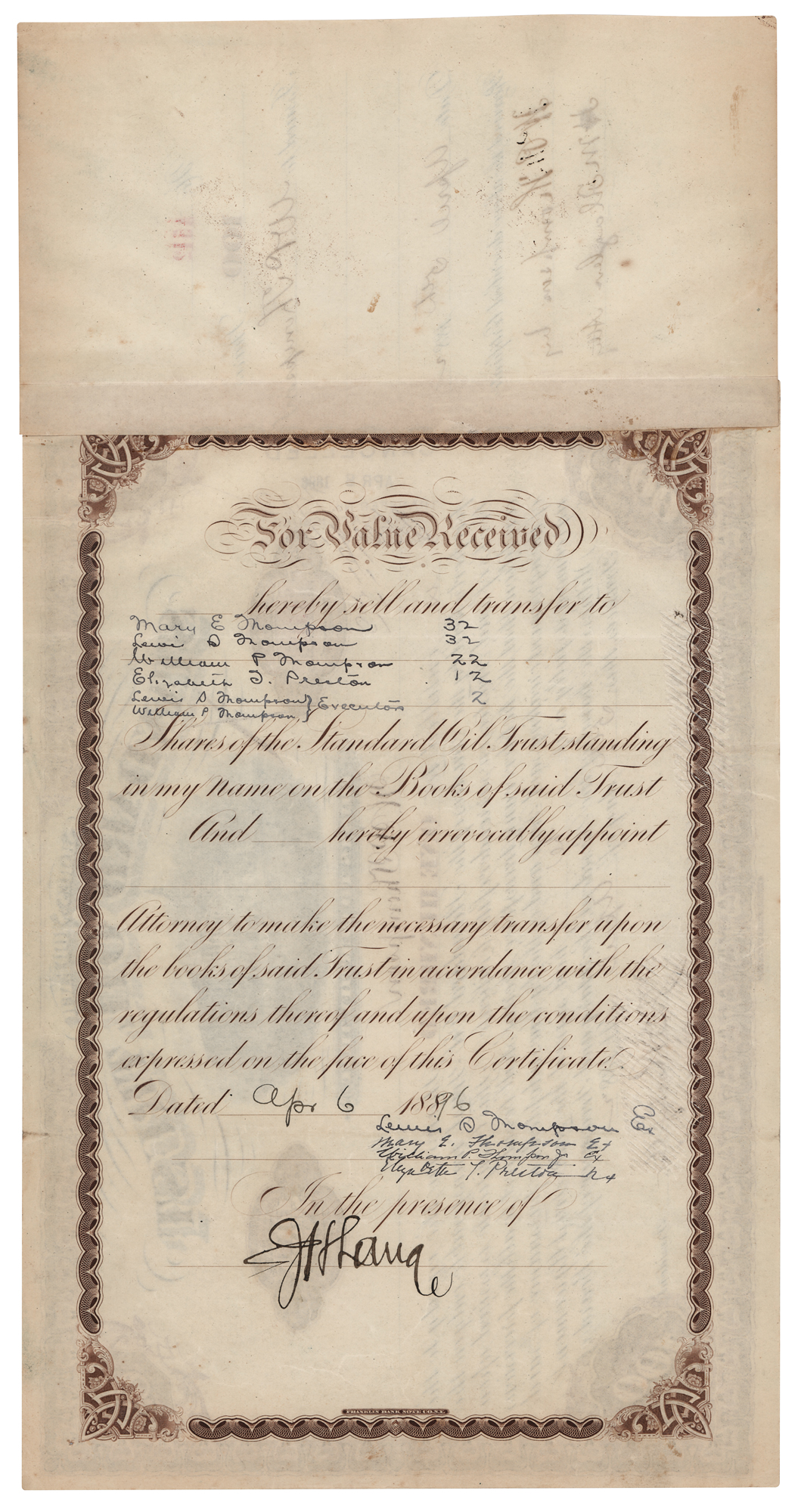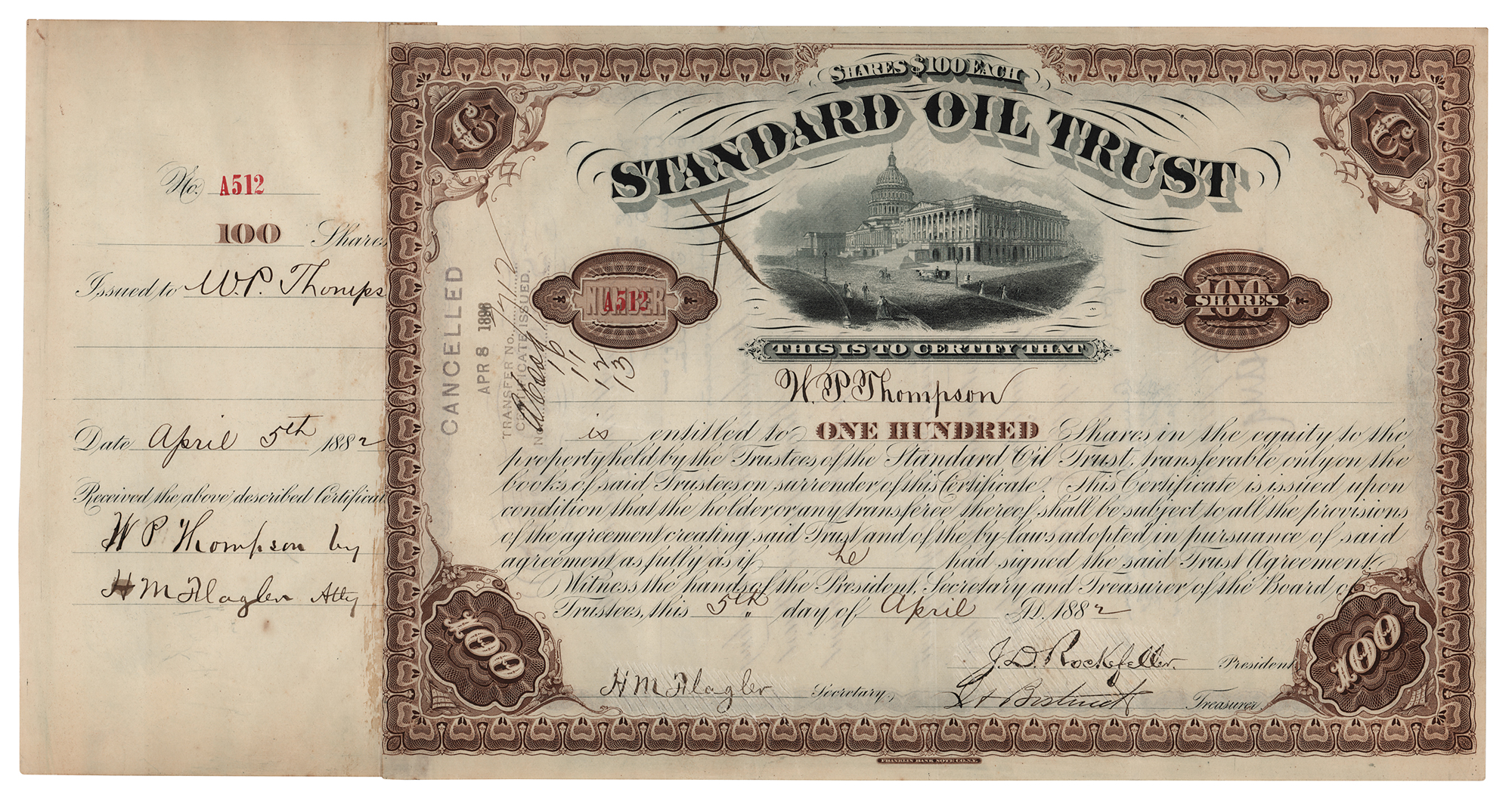 Partly-printed DS, one page, 11.5 x 7.75, April 5, 1882. Stock certificate for 100 shares in Rockefeller's Standard Oil Trust issued to W. P. Thompson, signed at the conclusion by John D. Rockefeller as president, Henry M. Flagler as secretary, and Jabez A. Bostwick as treasurer; the original receipt, signed again by Flagler on Thompson's behalf, remains affixed at the left edge. In fine condition, with the signatures lightly canceled.