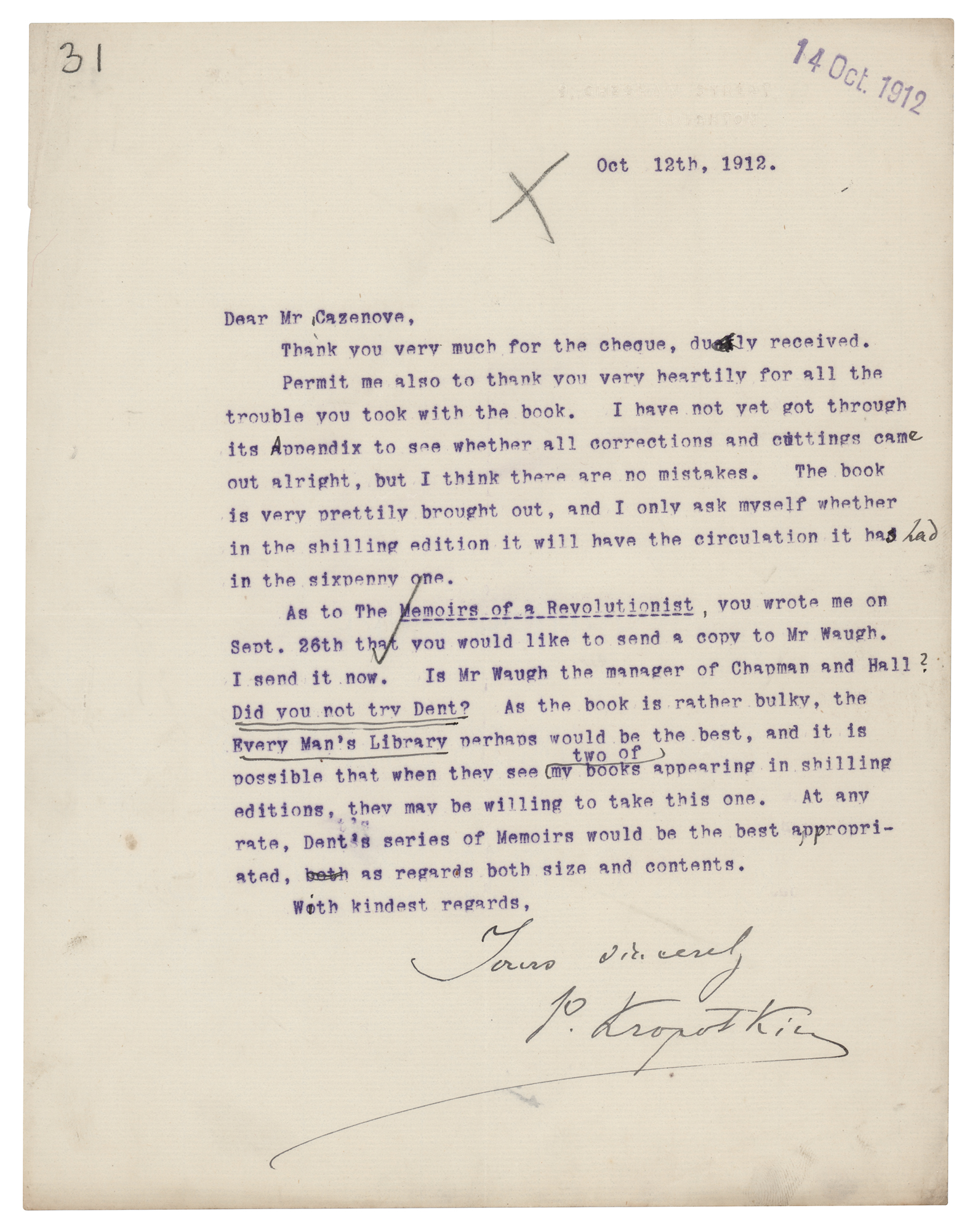 Russian geographer, zoologist, and political theorist (1842–1921) best known for his advocacy of anarchist communism. TLS signed “Yours sincerely, P. Kropotkin,” one page, 8 x 10.25, blindstamped 9 Chesam Street, Brighton letterhead, October 12, 1912. Letter to Mr. Cazenova, in part: "Thank you for the cheque…Permit me also to thank you very heartily for all the trouble you took with the book. I have not yet got through its Appendix to see whether all corrections and cuttings came out alright, but I think there are no mistakes. The book is very prettily brought out, and I only ask myself whether in the shilling edition it will have the circulation it had in the sixpenny one. As to The Memoirs of a Revolutionist, you wrote me on Sept. 26th that you would like to send a copy to Mr. Waugh. I send it now. Is Mr. Waugh the manager of Chapman and Hall? Did you not try Dent? As the book is rather bulky, the Every Man's Library perhaps would be the best, and it is possible that when they see two of my books appearing in shilling editions, they may be willing to take this one." In fine condition, with some light creasing to the lower right corner.