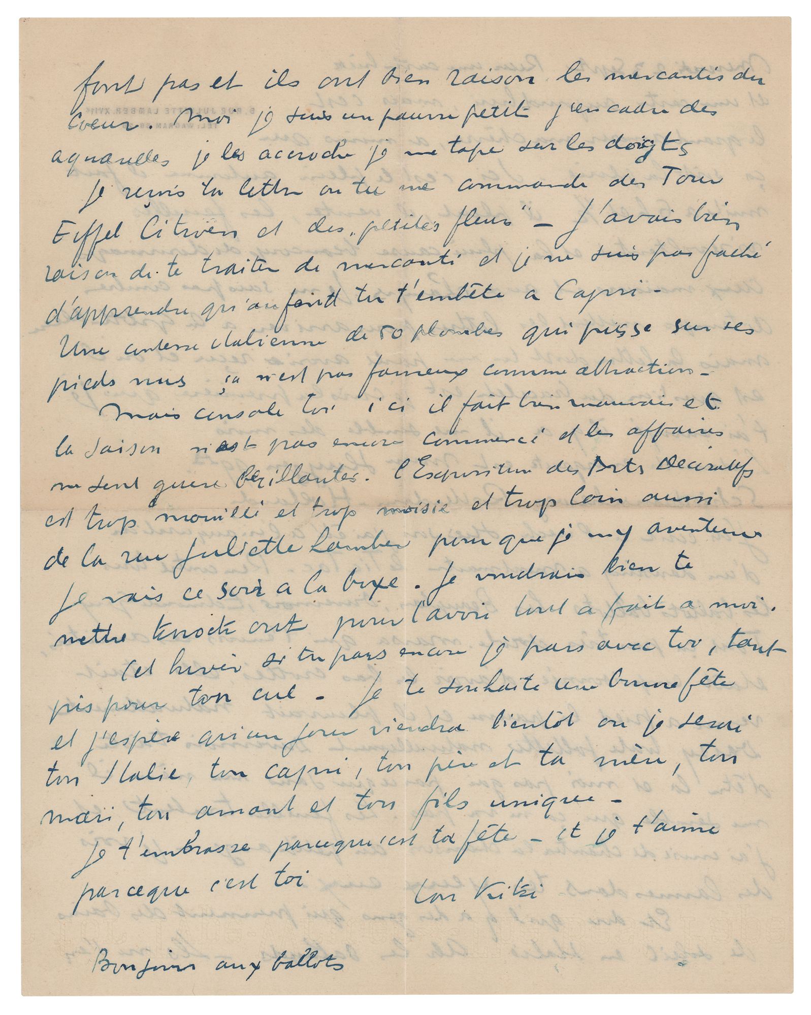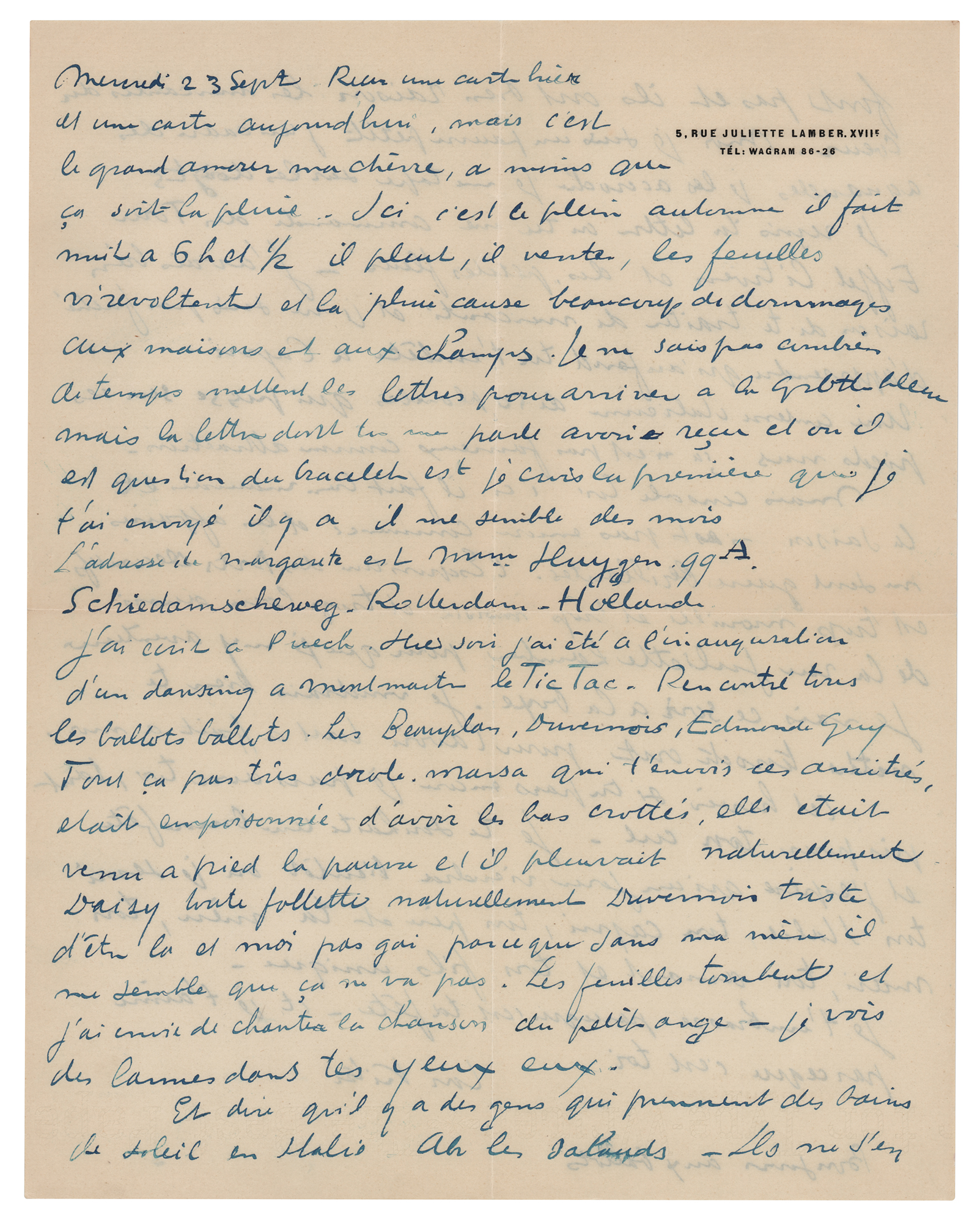 Dutch painter and one of the Fauves (1877–1968). ALS in French, signed “Kiki,” one page both sides, 8.5 x 11, 5 Rue Juliette Lamber letterhead, September 23, 1925. Lengthy untranslated handwritten letter by Kees Van Dongen to his wife. In fine condition. Accompanied by the original mailing envelope, addressed in Van Dongen's hand to "Madame Van Dongen."
