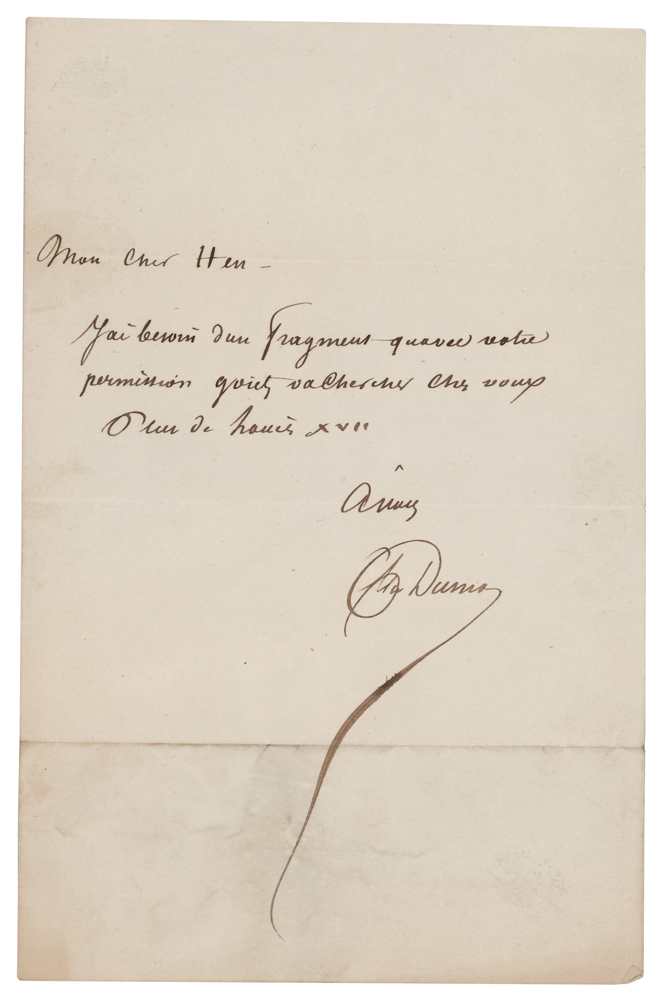 Prolific French writer (1802–1870) known for such classics as The Count of Monte Cristo and The Three Musketeers. ALS in French, signed “Ale. Dumas,” one page, 5.25 x 8.25, no date. Untranslated handwritten letter by Alexandre Dumas, pere. In fine condition.