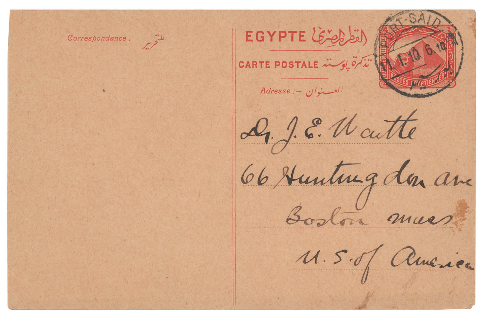 ALS penned on the reverse of a 5.5 x 3.5 Egyptian postal card, January 11, 1910. Handwritten letter from Port Said, Egypt, addressed to Dr. J. E. Waitt of Boston, in full: "Just a line to let you know that all's well—we are on our way. We stop off here 24 hours. Regard to your family from all of us." Reverse is addressed in Houdini's hand. In fine condition, with some light soiling.