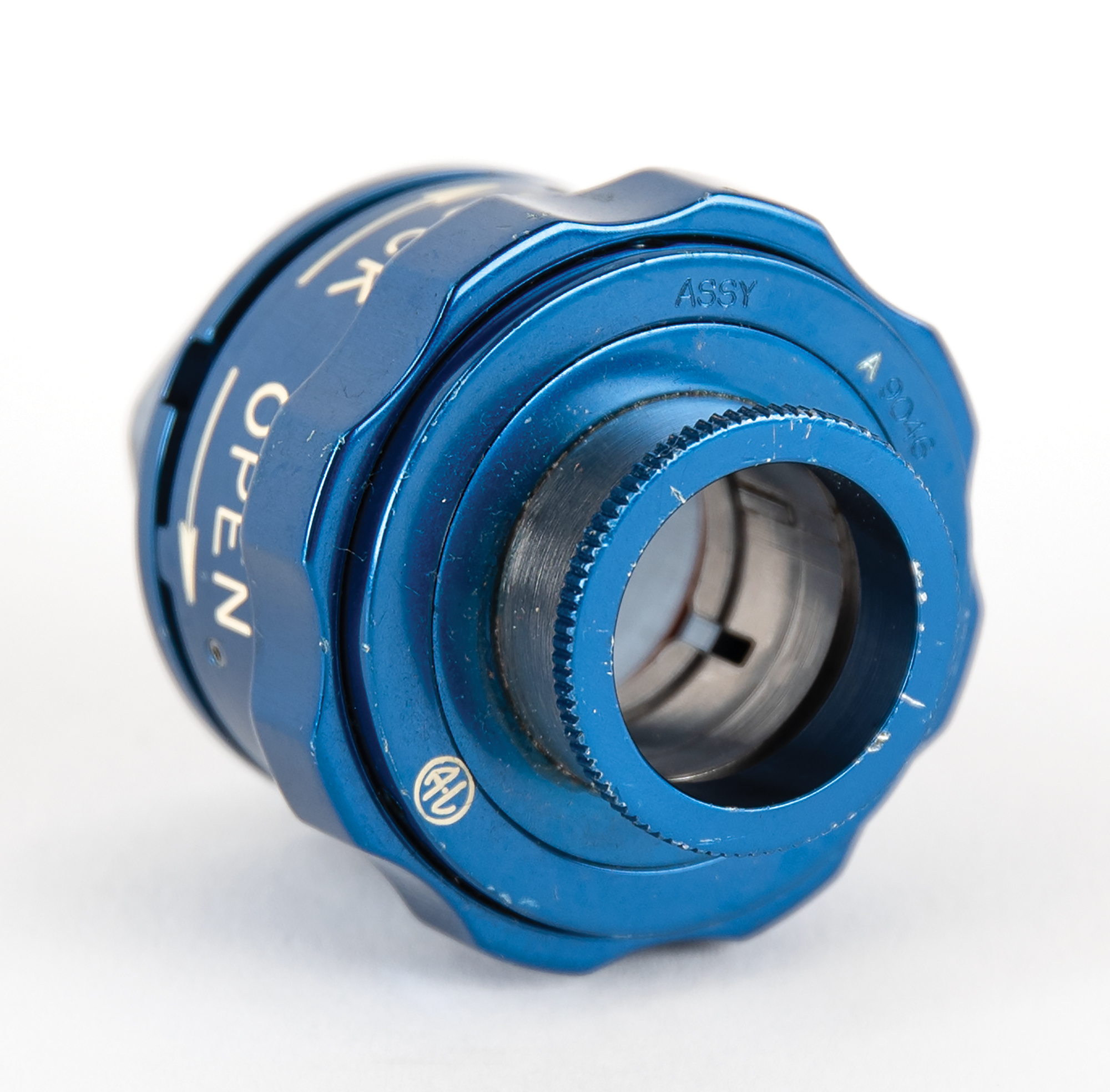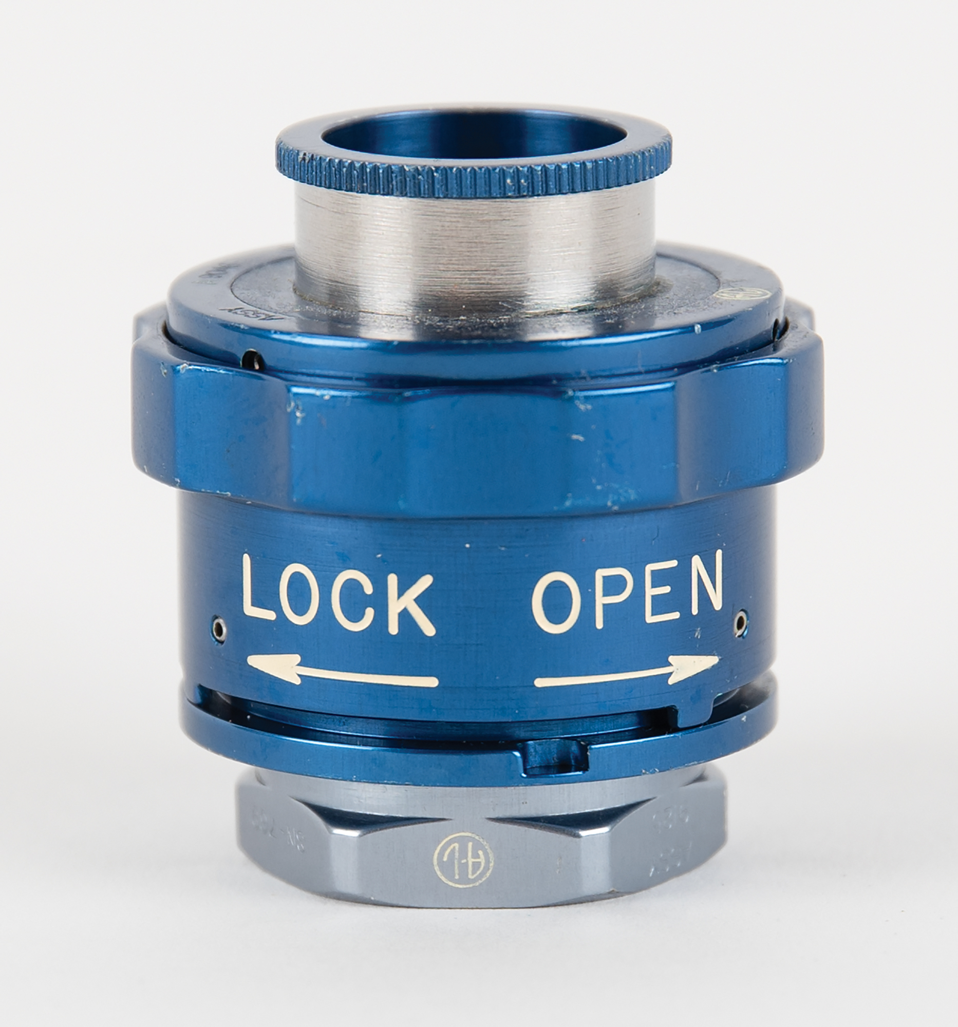 Blue anodized Apollo A7L space suit connector, approximately 1.5" diameter and 1.75" tall, produced by Air-Lock Inc. for use on the front of the space suit, as well as for the 'cobra-head' communications link. Includes both male and female ends. Locking upper portion is identified as "Assy. A9046 SN-1232," and the light blue threaded portion as "Assy. 9125 SN-769." In fine condition.