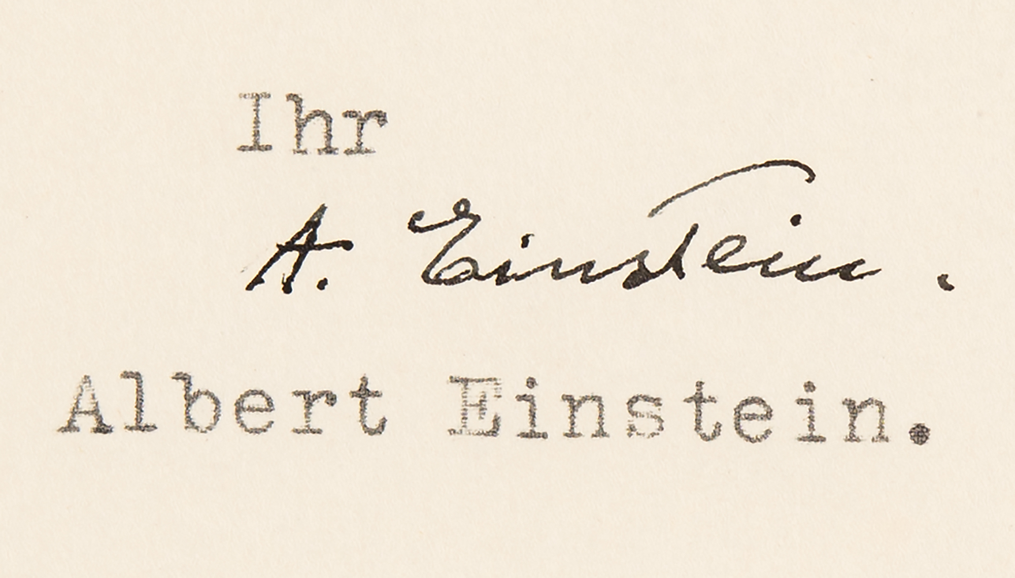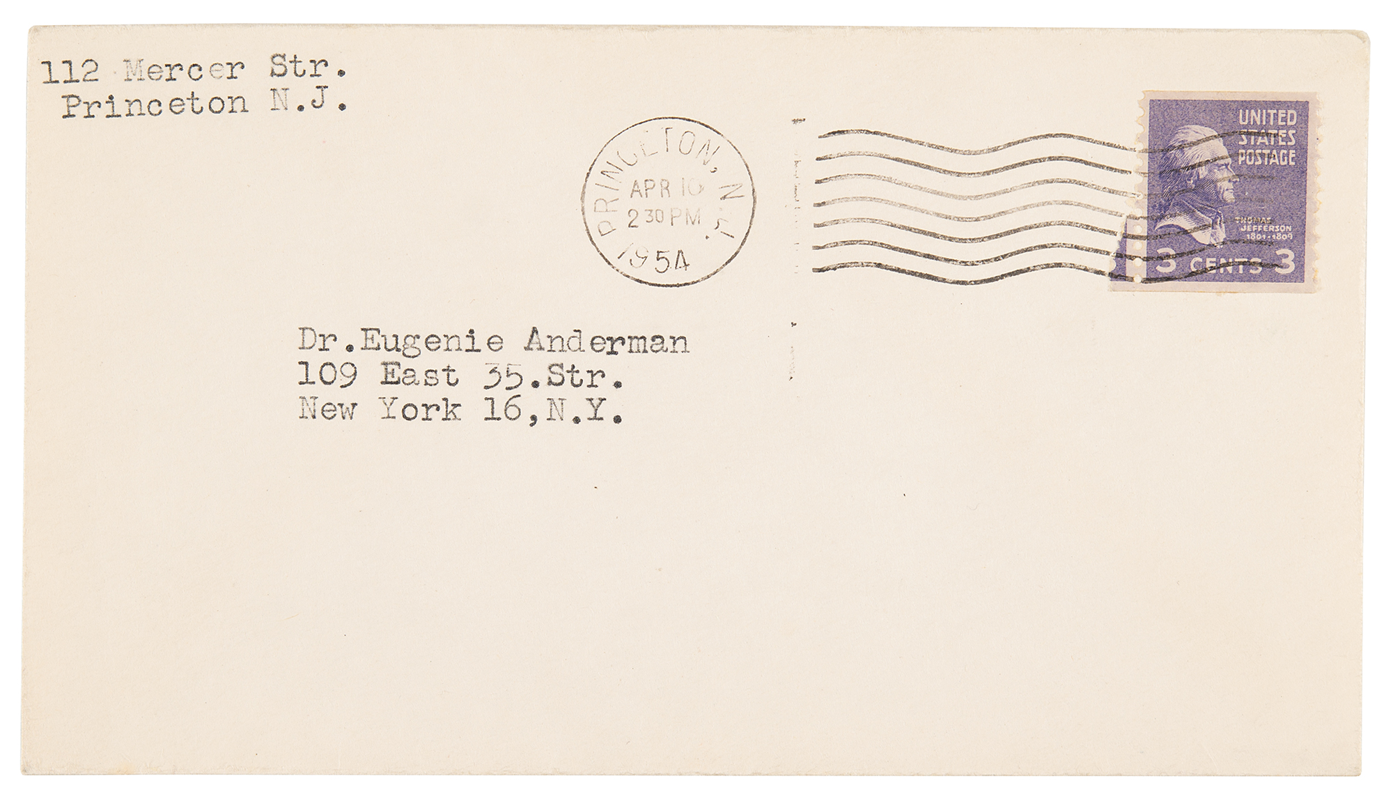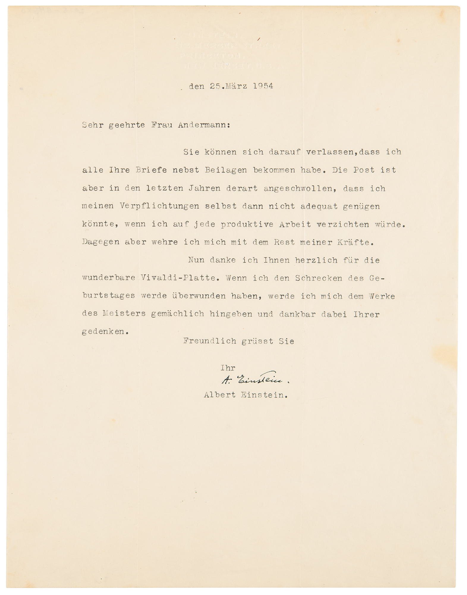 TLS in German, signed “A. Einstein,” one page, 8.5 x 11, blindstamped personal Princeton letterhead, March 25, 1954. Letter to Dr. Eugenie Anderman in New York, in part (translated): "You can be sure that I have received all your letters and their enclosures. However, the mail has swelled so much in recent years that I would not be able to adequately meet my obligations even if I were to give up all productive work. But I am resisting this with all the strength I have left. Now I would like to thank you very much for the wonderful Vivaldi record. When I have overcome the shock of the birthday, I will leisurely devote myself to the master's work and remember you gratefully." In fine condition. Accompanied by the original mailing envelope.