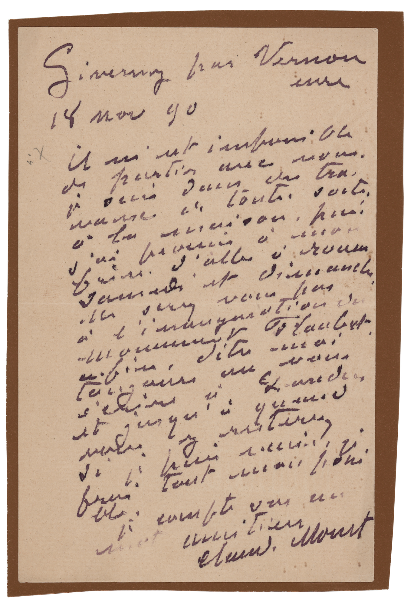 ALS in French, one page, 4.5 x 7, November 18, 1890. Handwritten letter to his friend Gustave Geffroy (1855–1926), a French journalist and art critic, replying that he cannot accompany him to London. In part (translated): "I am doing all sorts of work at home. Then I promised my brother to go to Rouen on Saturday and Sunday. Will you not be at the inauguration of the Flaubert monument." Affixed to a larger mount and in fine condition. Accompanied by the original mailing envelope, addressed in Monet's own hand, as well as an unsigned matte-finish portrait.