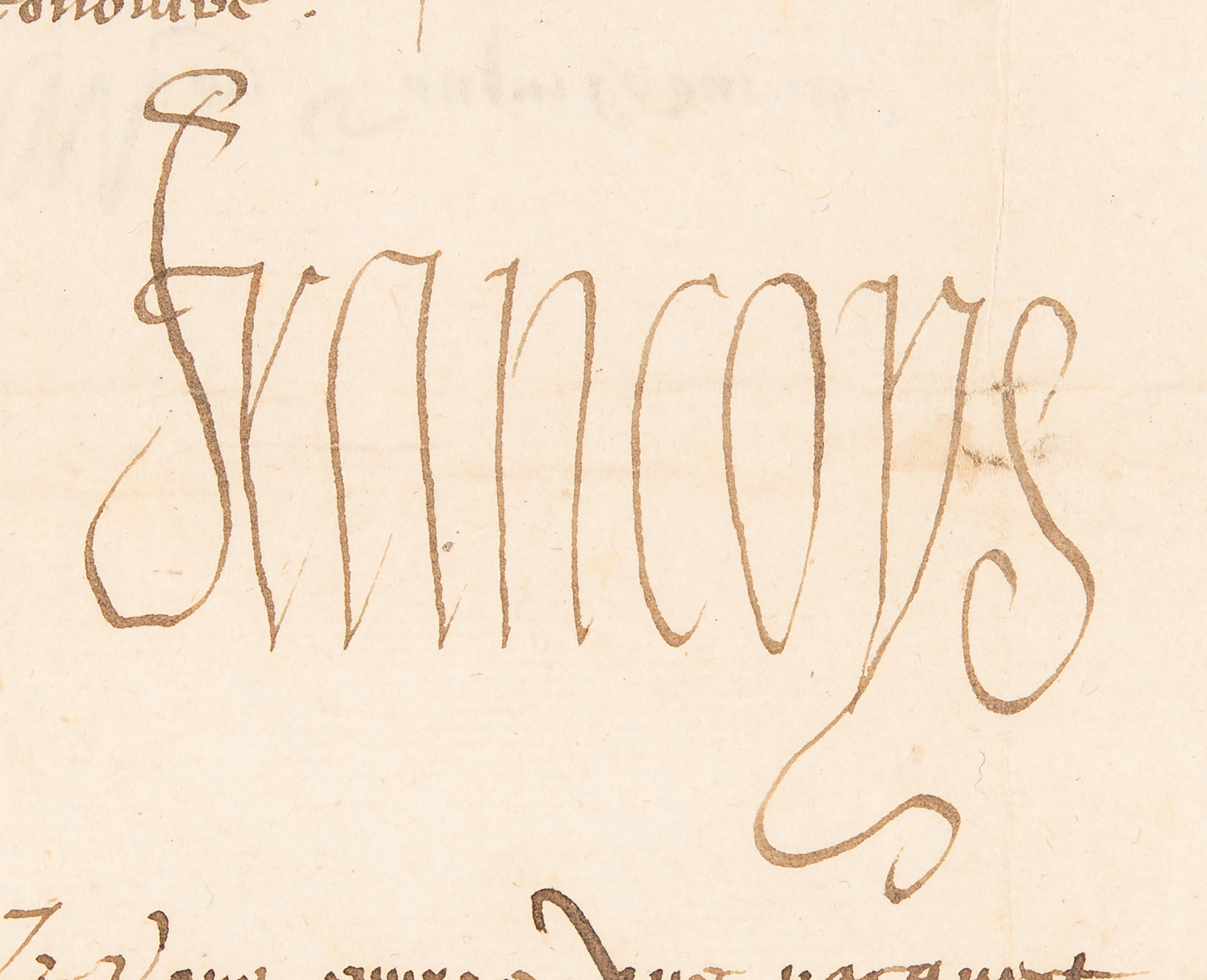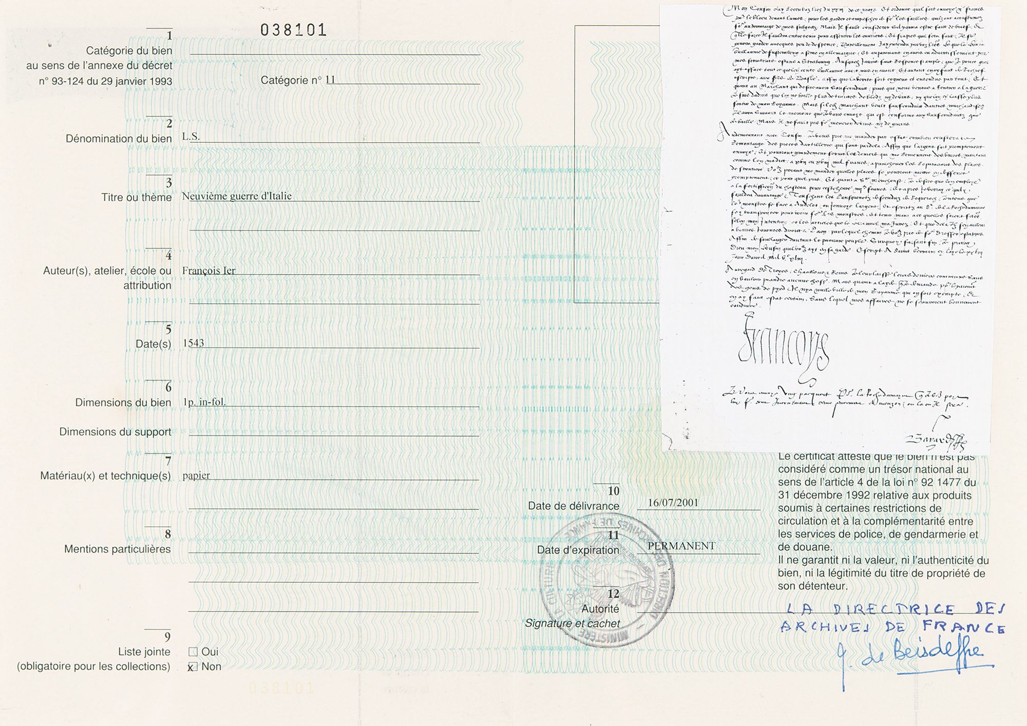 King of France (born 1494) who reigned from 1515 until his death in 1547. Known as the 'Father and Restorer of Letters,' the cultured and well-read Francis, himself a poet, ushered in the Renaissance in France with generous support for a number of writers and ambitious construction projects. Scarce LS in French, signed “Francoys,” one page, 7.75 x 11.5, April 28, 1543. Untranslated letter concerning the Ninth Italian War, prominently signed at the conclusion in ink by King Francis I. In very good to fine condition, with scattered light stains, and loss to two corners affecting none of the handwriting. Accompanied by an export certificate from the French Ministry of Culture and an engraved portrait of the king.