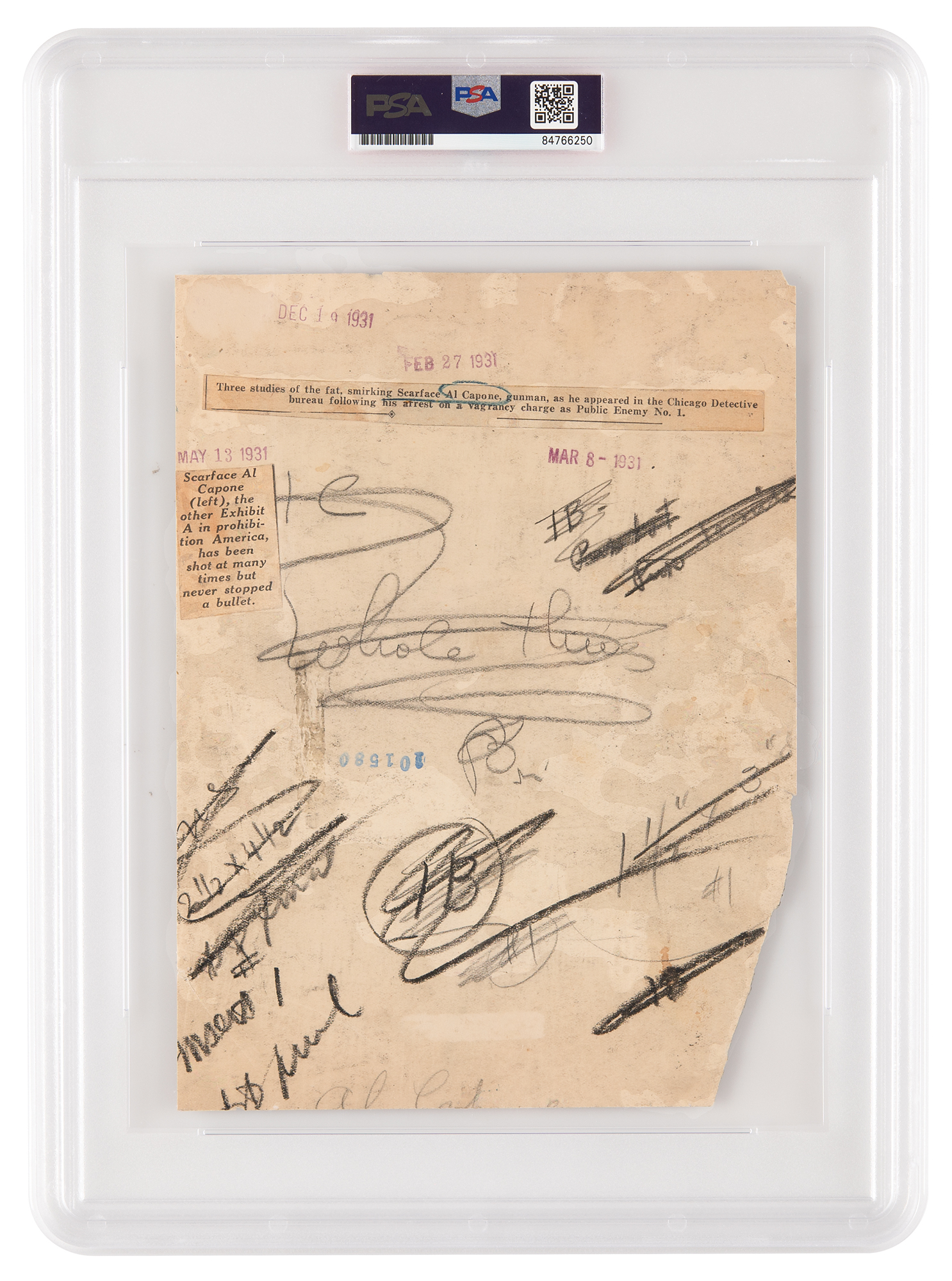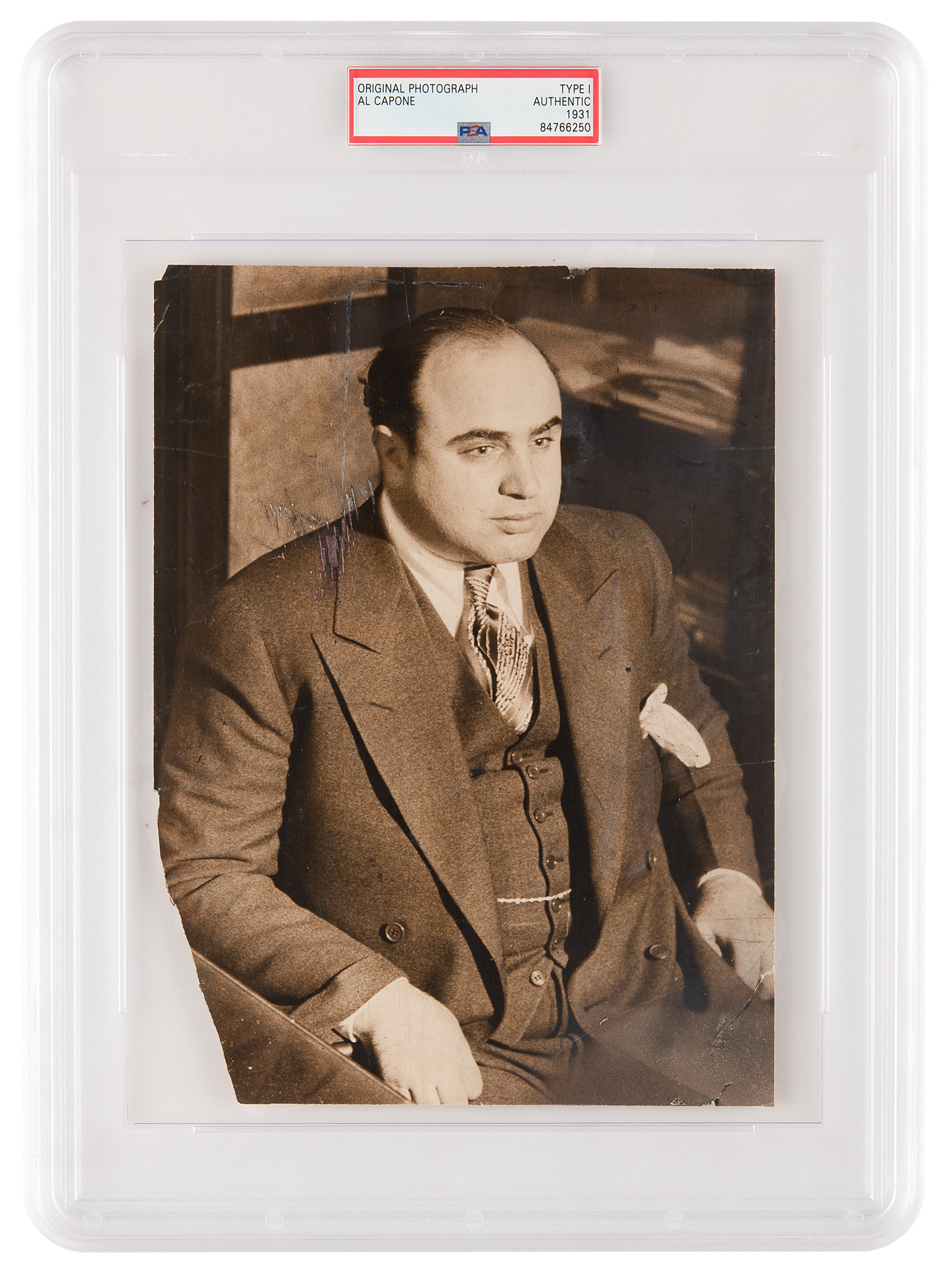 Original vintage glossy 7.75 x 9 half-length wire photo of Chicago Outfit crime boss Al Capone seated in the Chicago Detective bureau following his arrest on vagrancy charges. The reverse bears several stamps dated to 1931, two affixed newspaper captions, and numerous editorial notations. In very good condition, with overall crazing to the emulsion, and loss to the lower left side. Encapsulated by PSA as an authentic 'Type I' photograph.