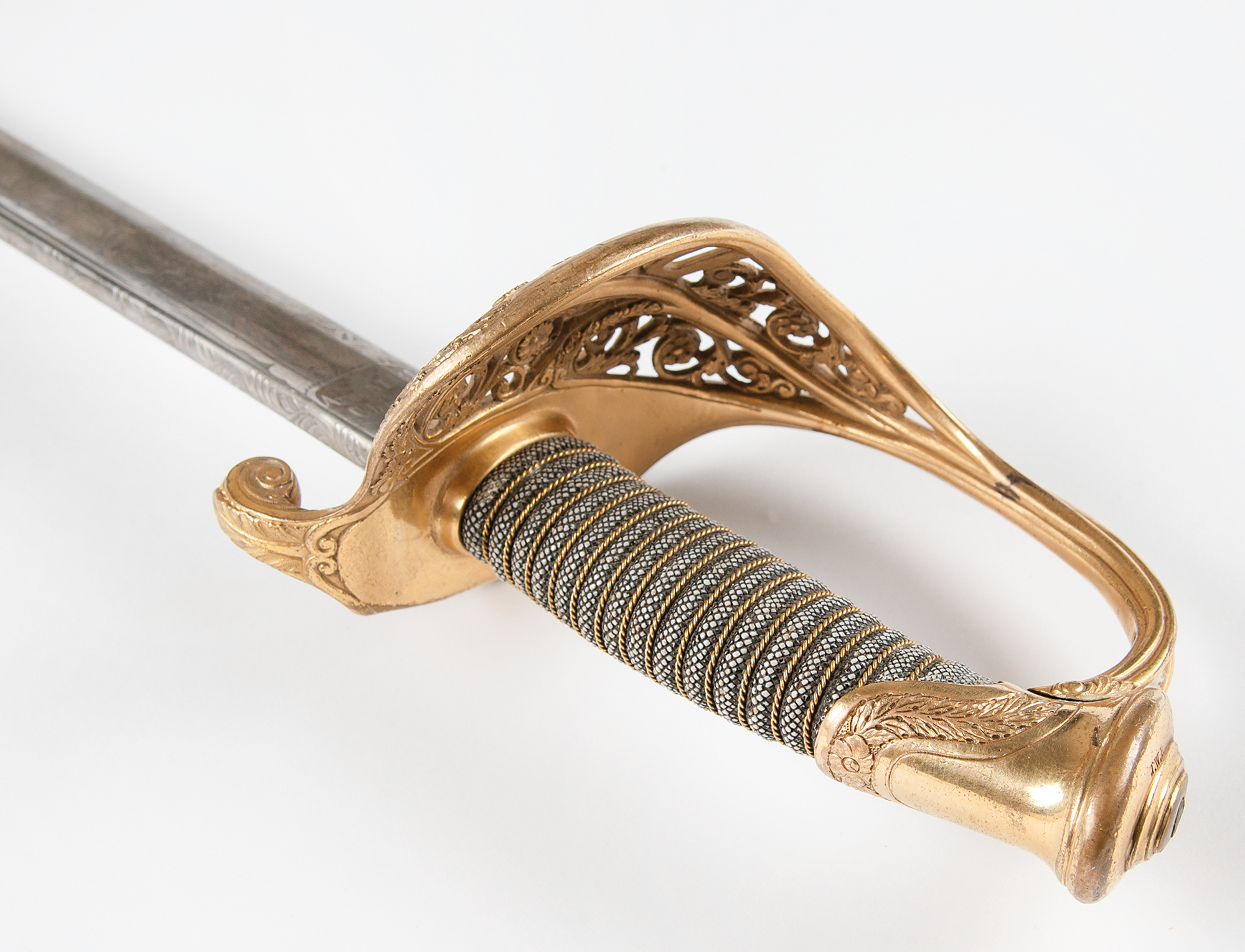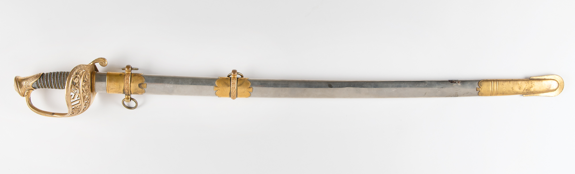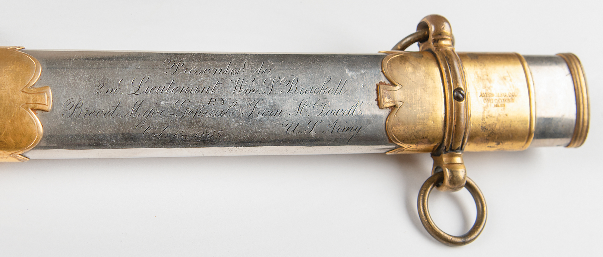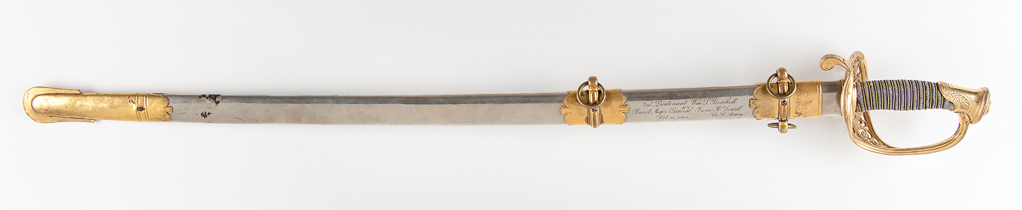 US Model 1850 staff and field officer's sword manufactured by Ames, presented to 2nd Lt. William S. Brackett by General Irving McDowell, engraved on the polished scabbard: "Presented to 2nd Lieutenant Wm. S. Brackett by Brevet Major-General Irvin McDowell, U.S. Army, Oct. 15, 1865." The sword measures 37.5˝ long overall, with a 32˝ slightly curved, single-edged blade featuring half-length etched panels on either side. The blade names the maker above the ricasso, "Ames Mfg. Co., Chicopee, Mass.," with government inspection stamp below: "US / ADK." The etched panel designs along the forte are still clear and visible with "E PLURIBUS UNUM" riband, eagle, and scrolls on the obverse; and a large "US" on the reverse. The ornate brass guard features a large "US" within the scrollwork, and the sharkskin grip with twisted brass wire remains intact. In very good to fine condition.