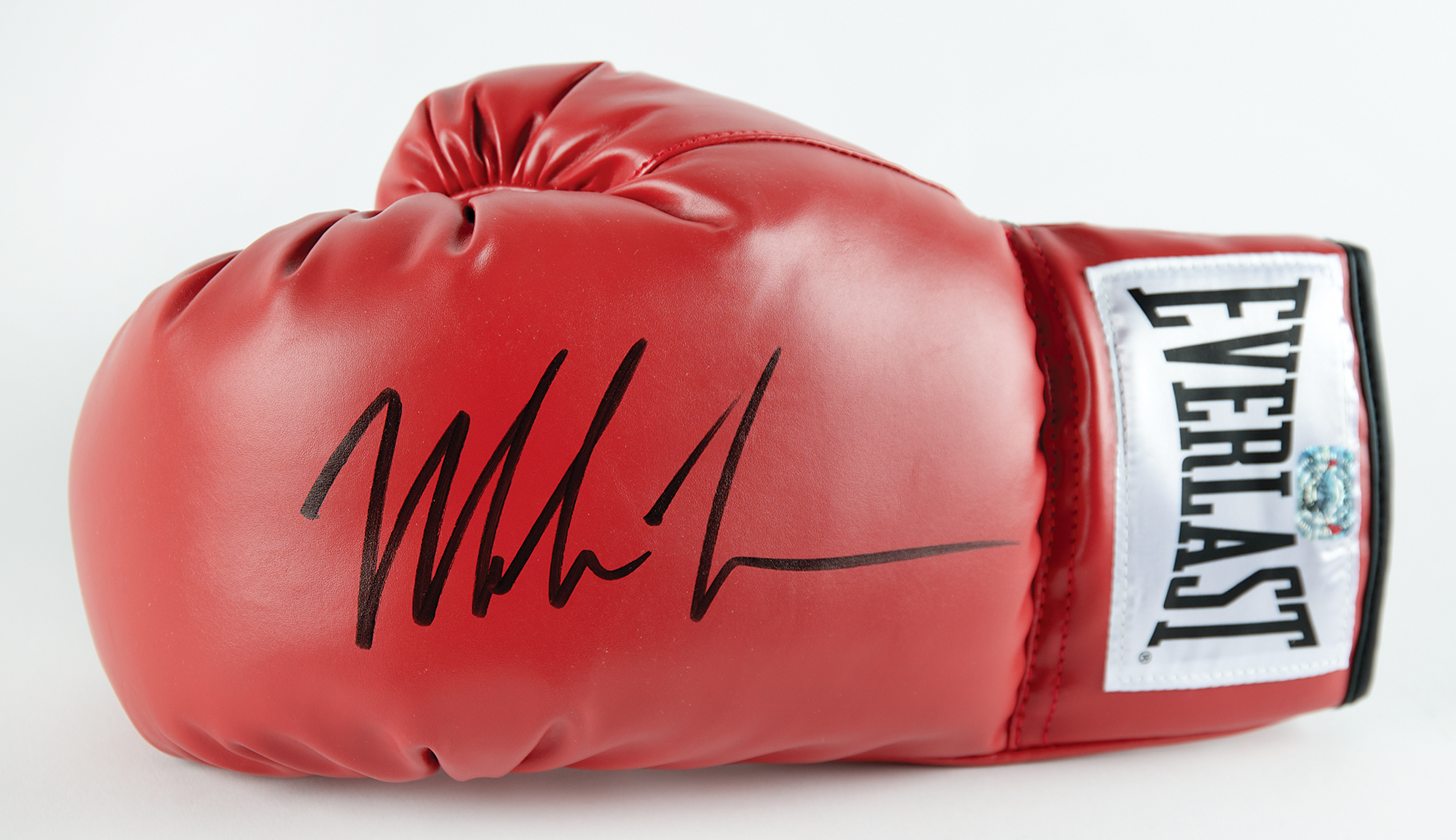 Red left-handed Everlast boxing glove, prominently signed in black felt tip by Mike Tyson. In very fine condition, with an authenticity label affixed to the wrist.