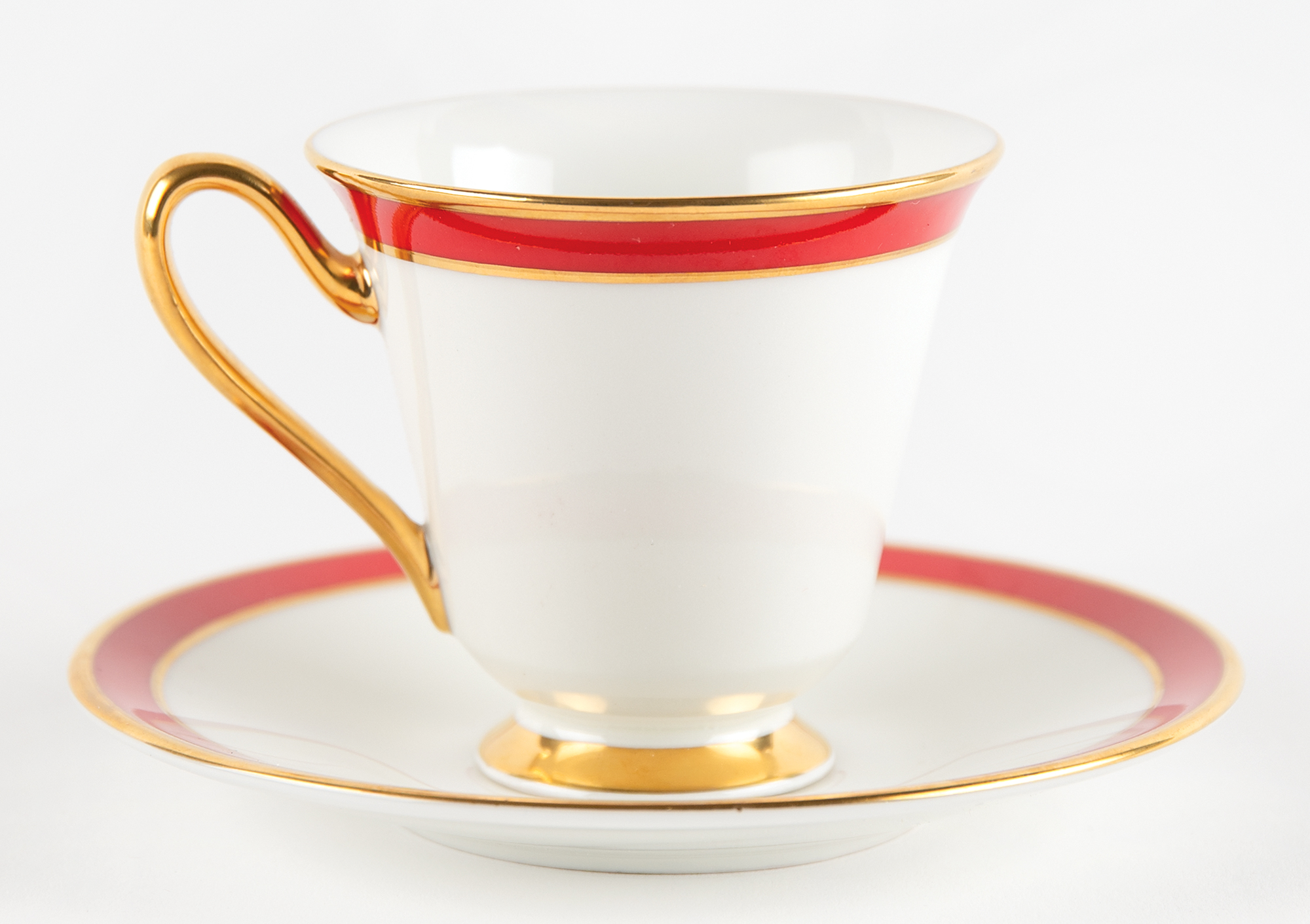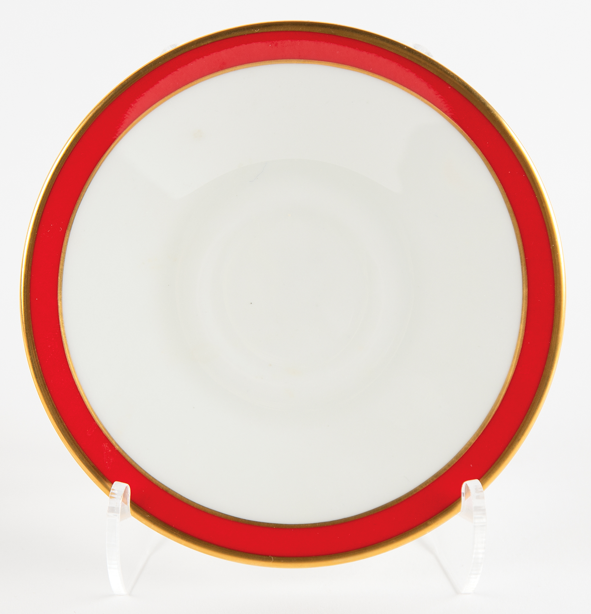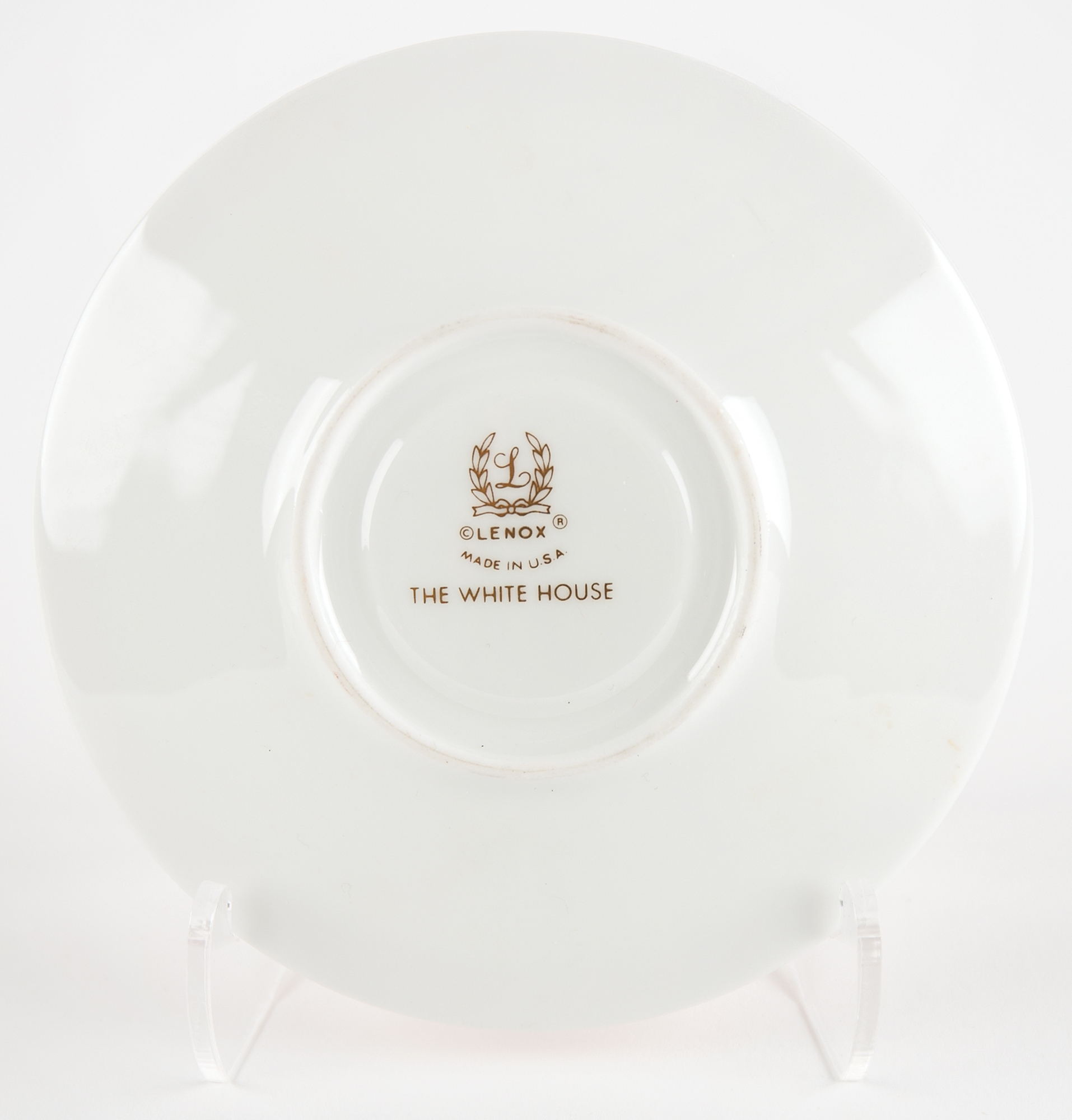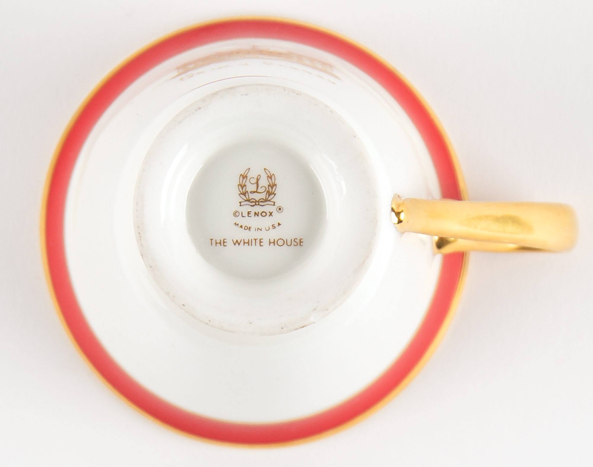 Very attractive Lenox china Nancy Reagan 'signature' tea cup and saucer set. The cup, 3.5˝ x 2.75˝, features a gold handle, base, and lip, which also bears a red border, and the body bears Reagan’s facsimile signature below an image of the South Portico of the White House. The saucer, 5˝ in diameter, bears a matching red-and-gold border. The undersides of both are marked “Lenox, Made in USA, The White House.” In overall very fine condition.