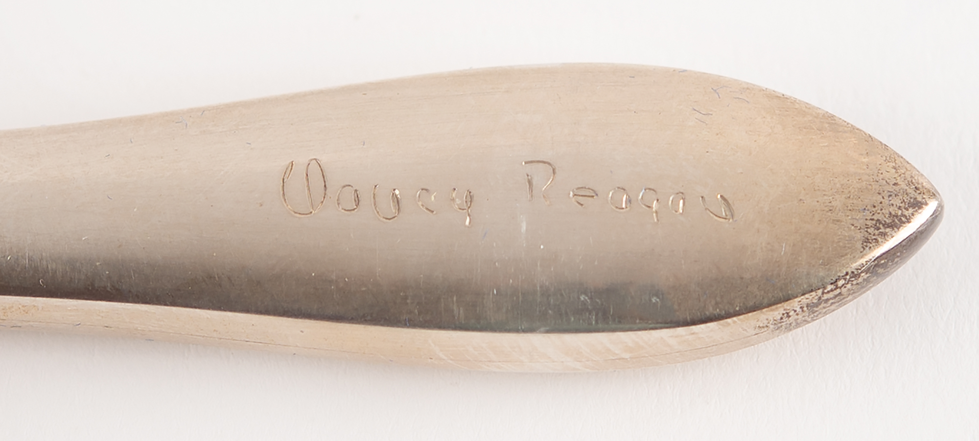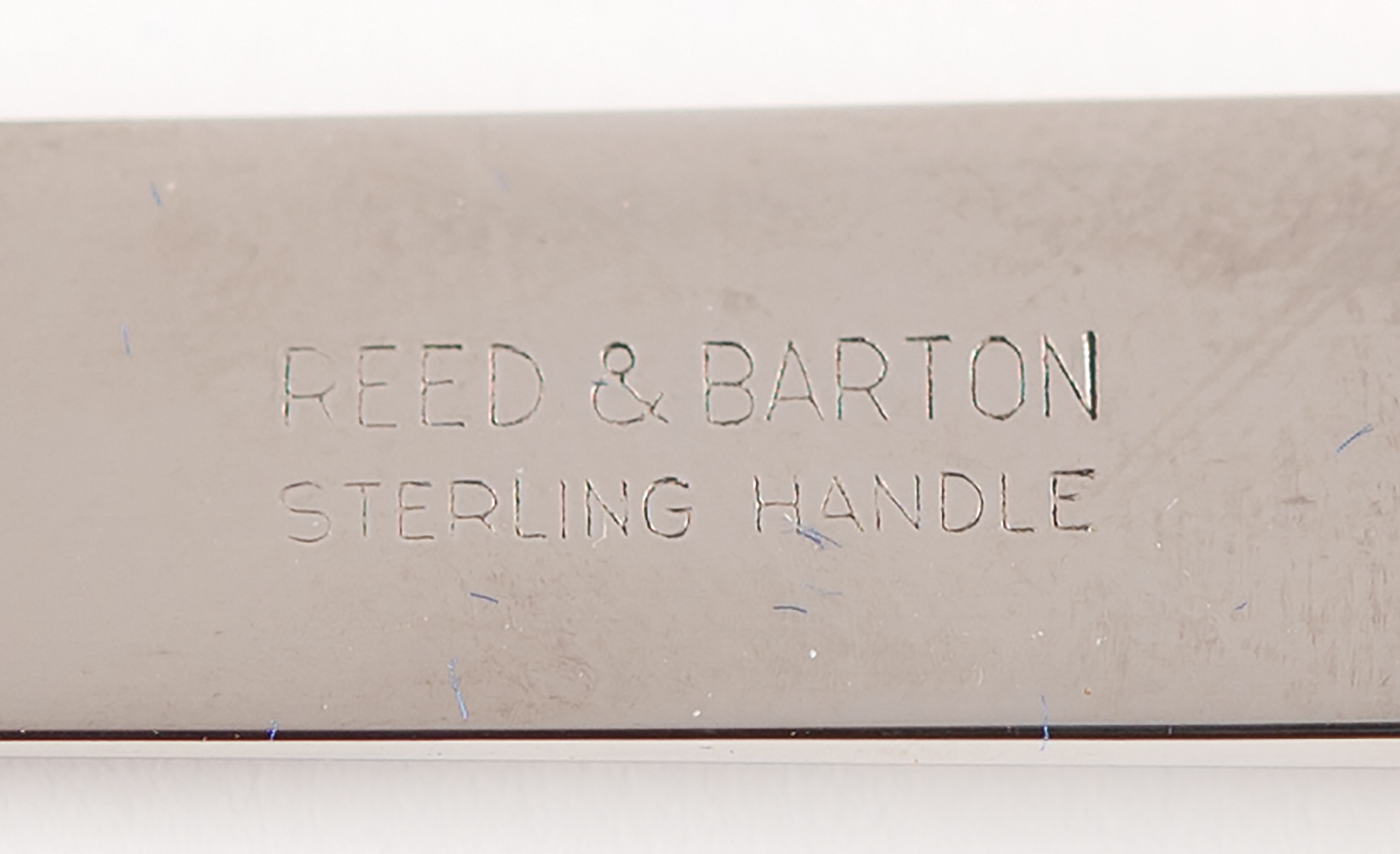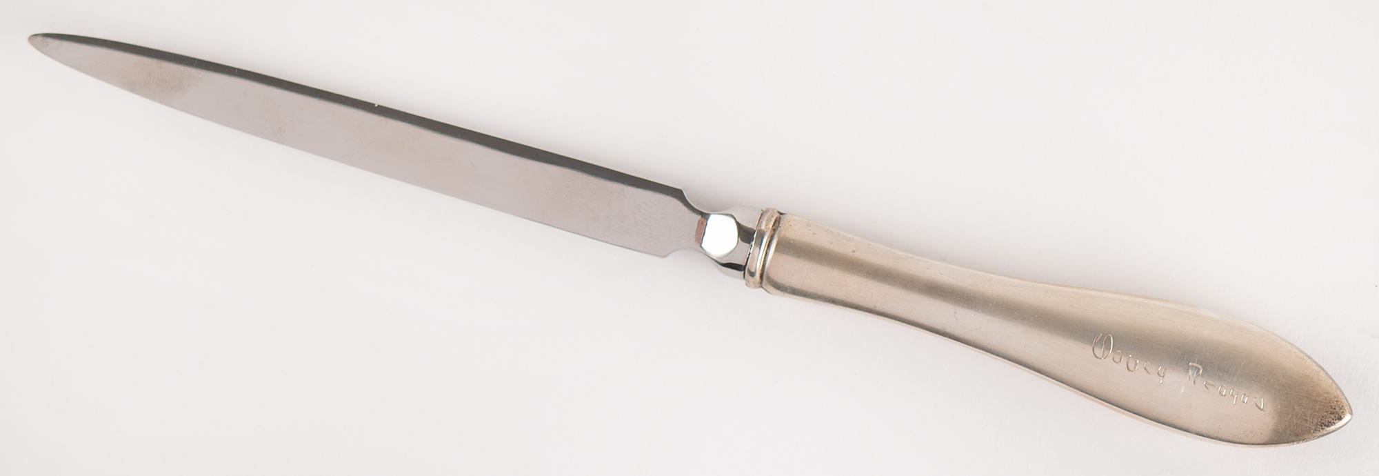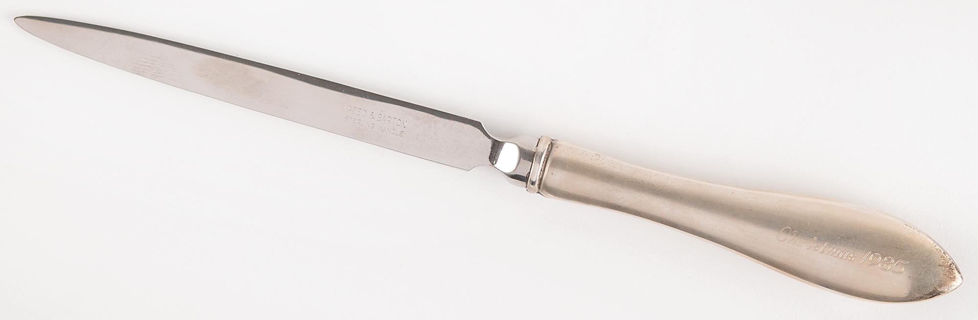 Attractive Reed & Barton sterling silver Nancy Reagan ‘signature’ letter opener, measuring 7.75˝ in length, with one side of the handle engraved with Reagan’s facsimile signature, and the other side engraved, “Christmas, 1985.” Includes the original Reed & Barton presentation box. In fine condition.