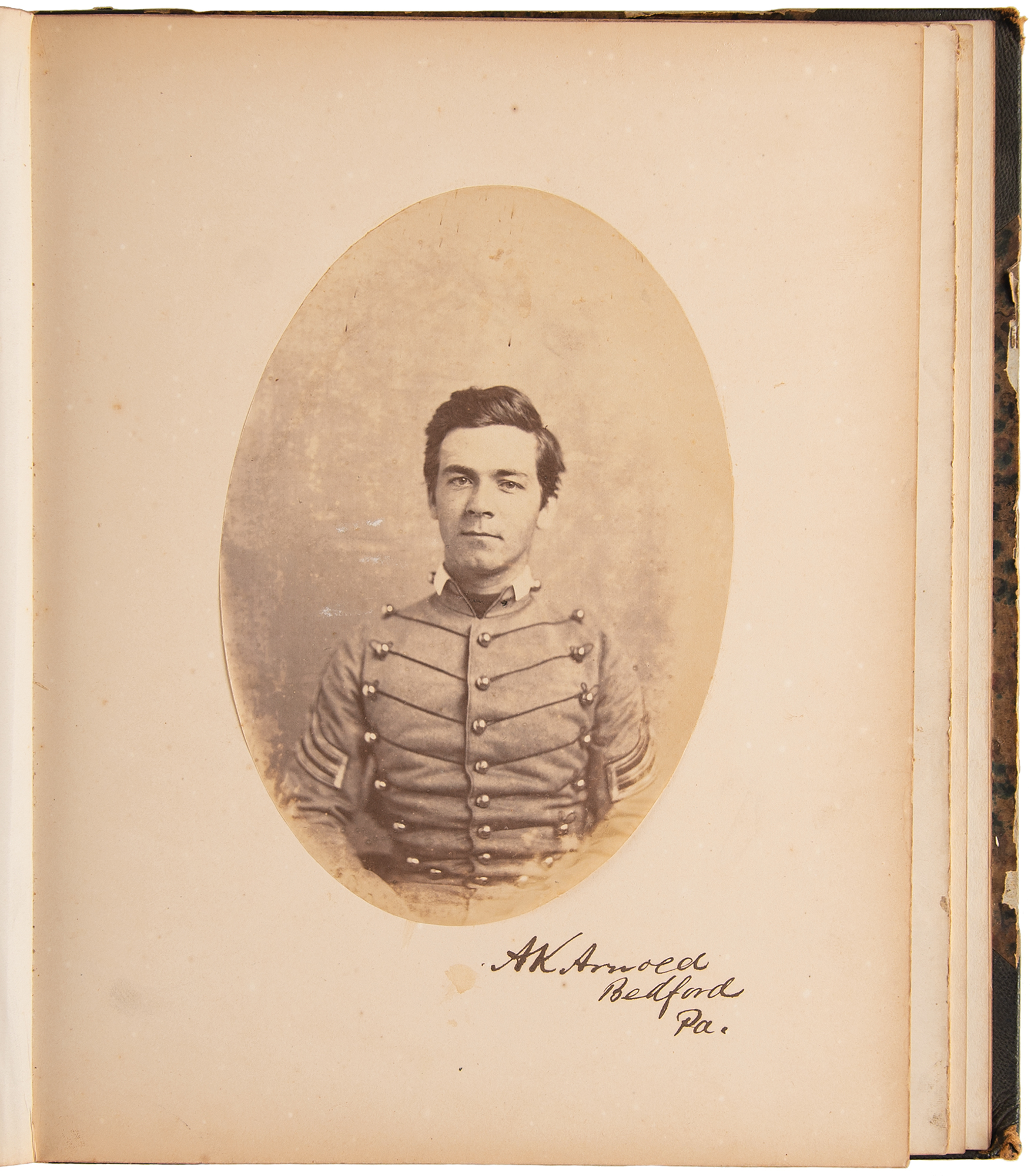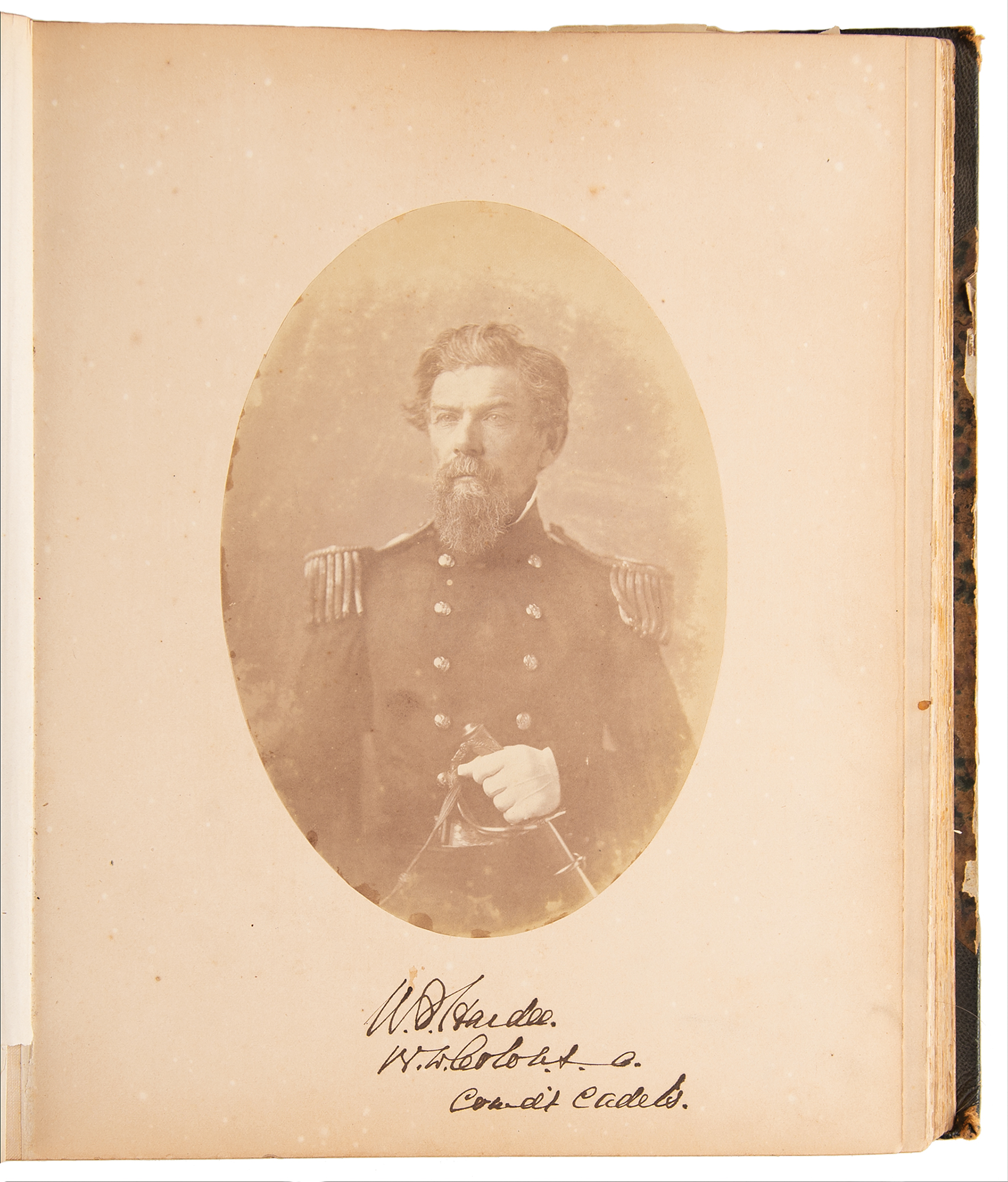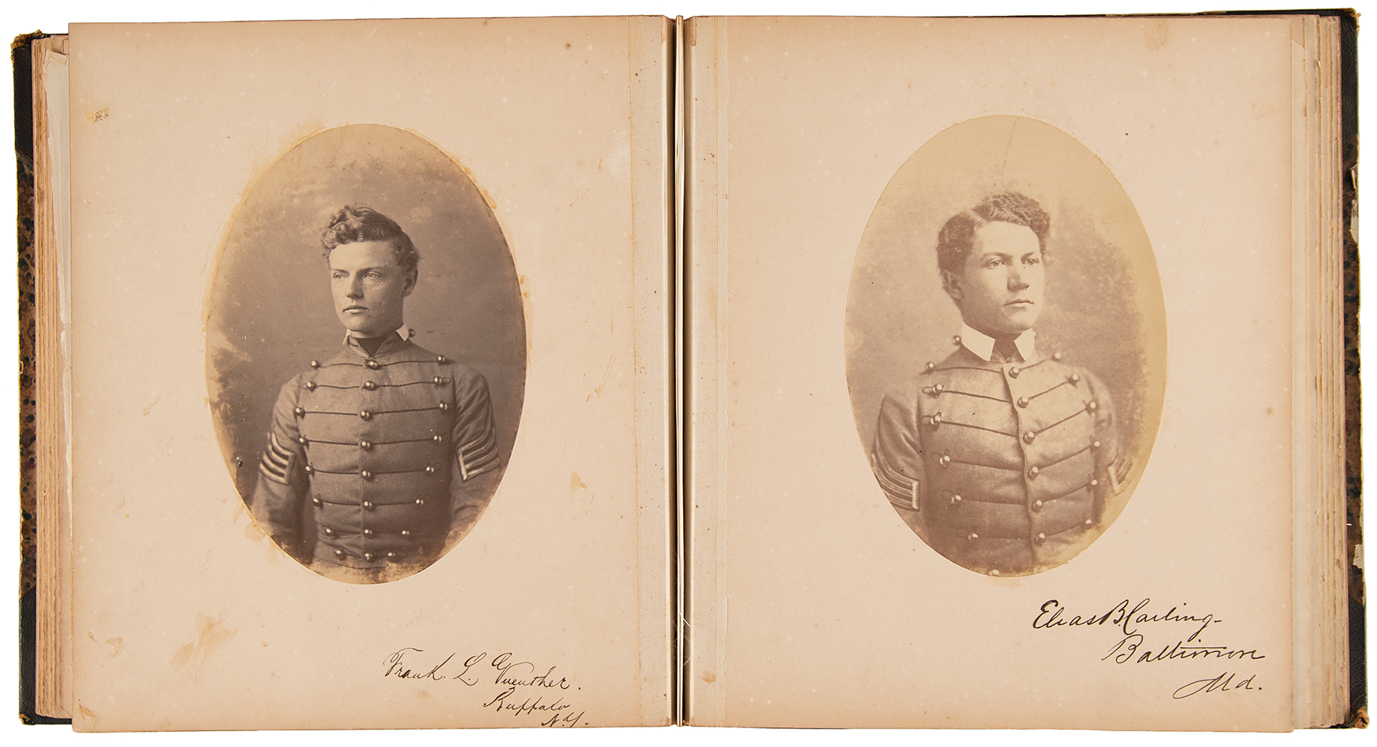 Extremely rare original leatherbound yearbook for the West Point Class of 1859, 11 x 11.5, containing 33 salt print portraits of the esteemed institution's cadets and faculty, each boldly signed on the mount in ink by the subject.