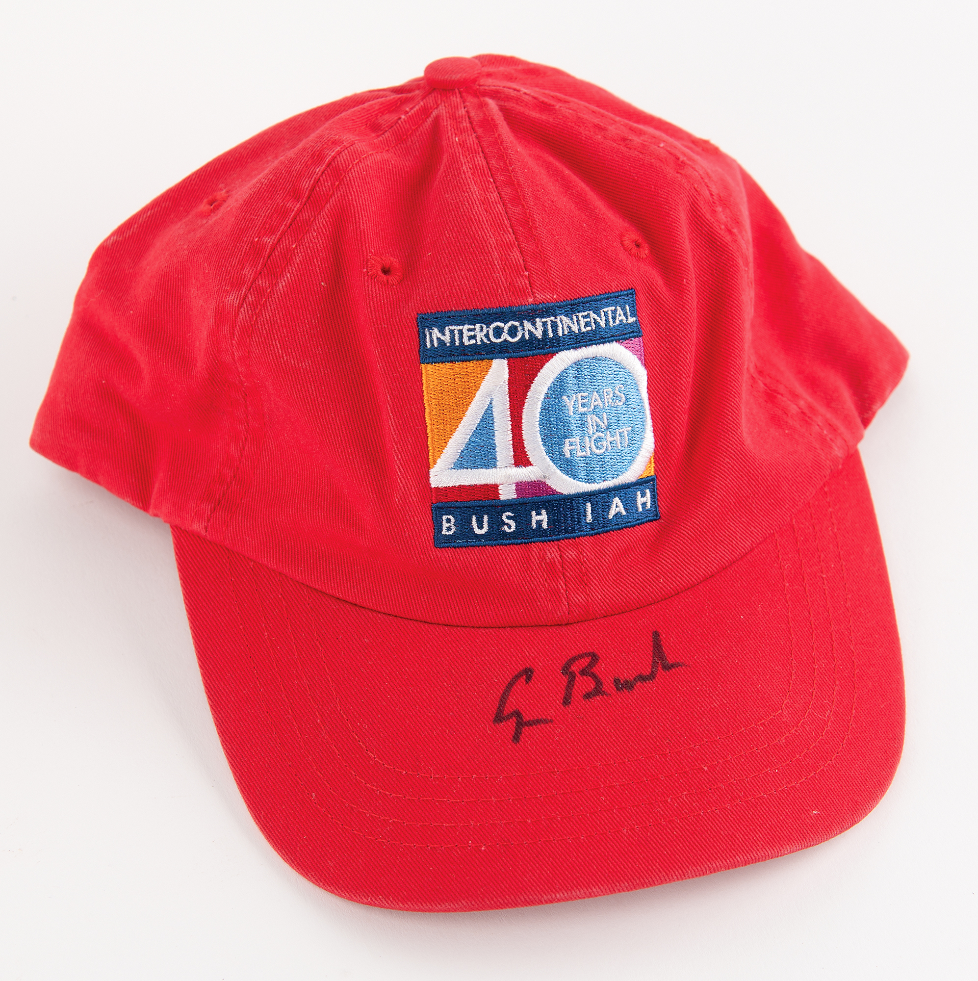 Red baseball cap embroidered with an emblem honoring 40 years in flight at George Bush Intercontinental/Houston Airport, signed on the top of the bill in black felt tip by George Bush. In fine condition, with a JSA label affixed to the underside. Accompanied by a certificate of authenticity from JSA. Initially named Houston Intercontinental Airport upon its opening in 1969, the facility was renamed in honor of George H. W. Bush, the 41st president of the United States and a resident of Houston, in 1997.