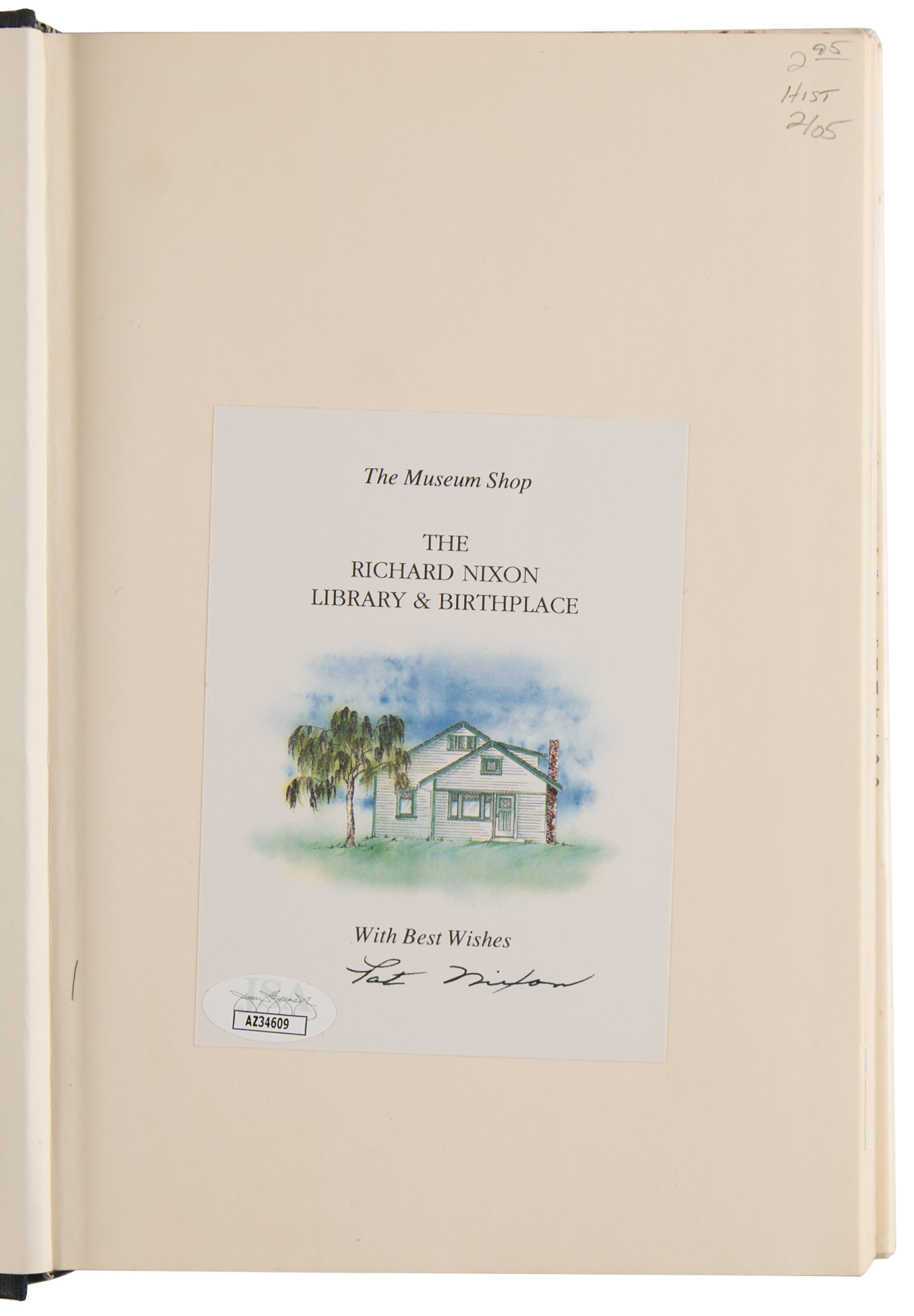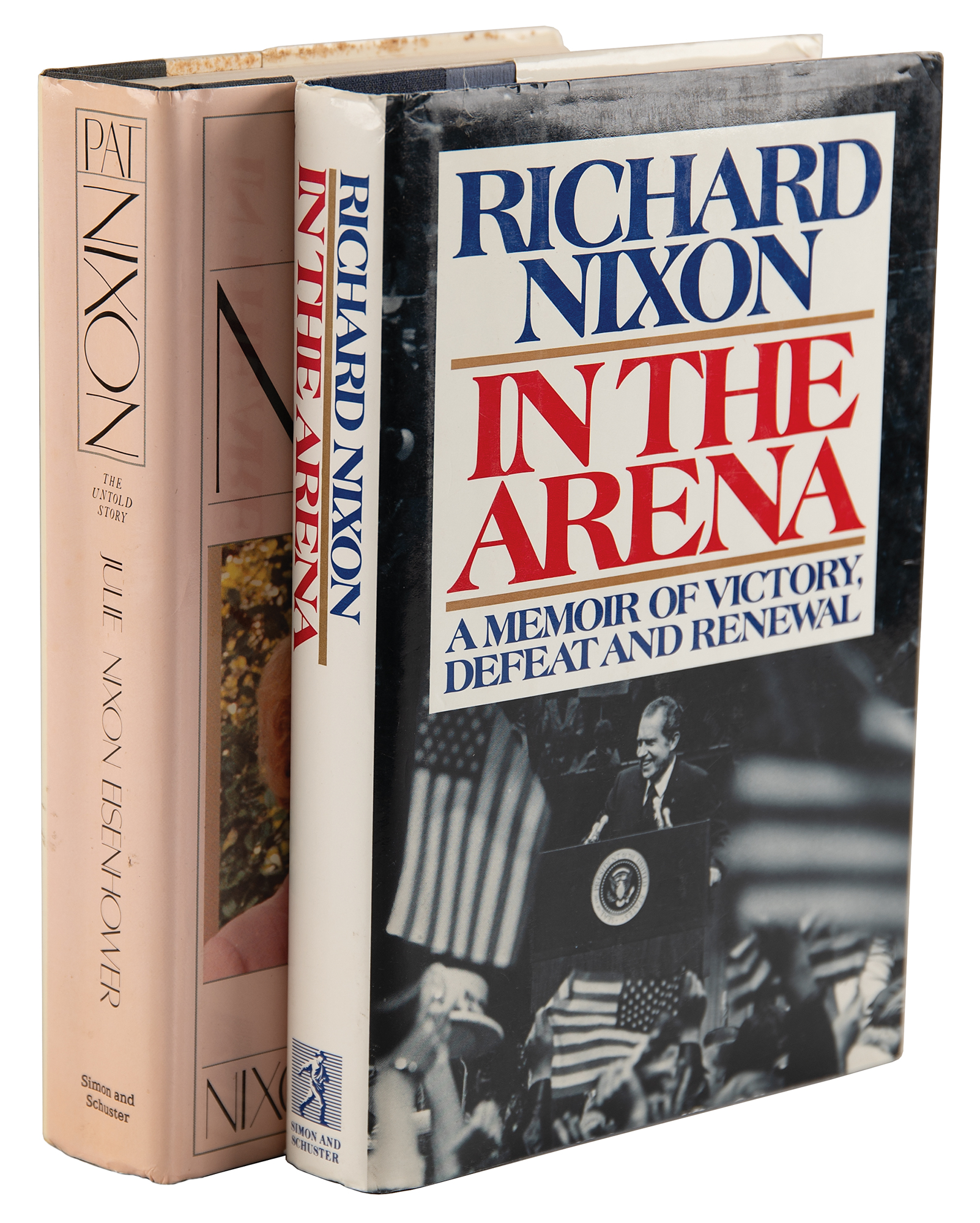 Two signed books: a first edition of In the Arena, hardcover with dust jacket, signed in black felt tip by Richard Nixon on a bookplate affixed to the opening page; and a later printing of Pat Nixon: The Untold Story, hardcover with dust jacket, signed in black felt tip by Pat Nixon on a bookplate affixed to the opening page. In very good to fine condition, with some buckling to the spines and a JSA label affixed to the Pat Nixon bookplate. Accompanied by a certificate of authenticity from JSA for Pat Nixon's signature.