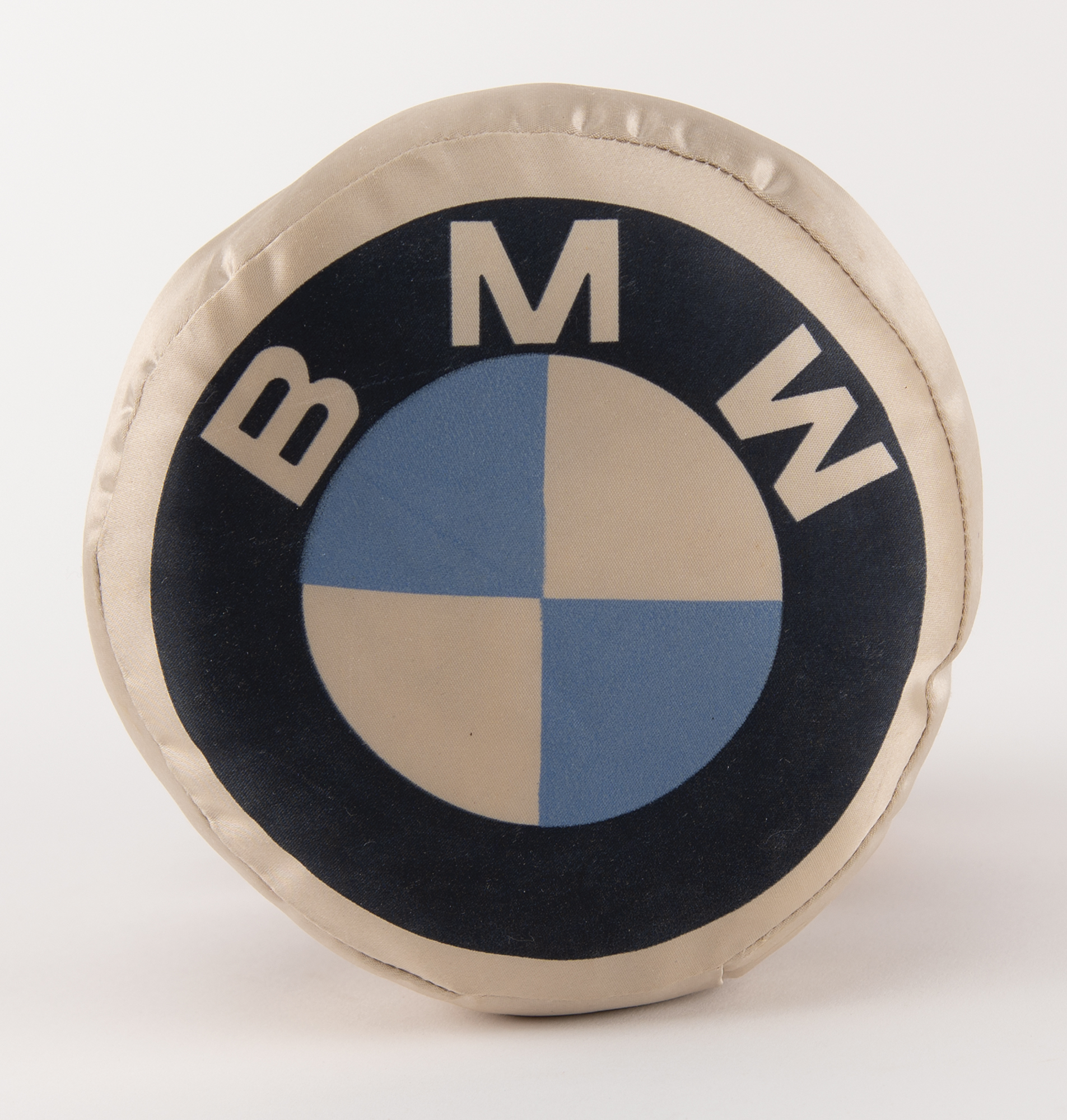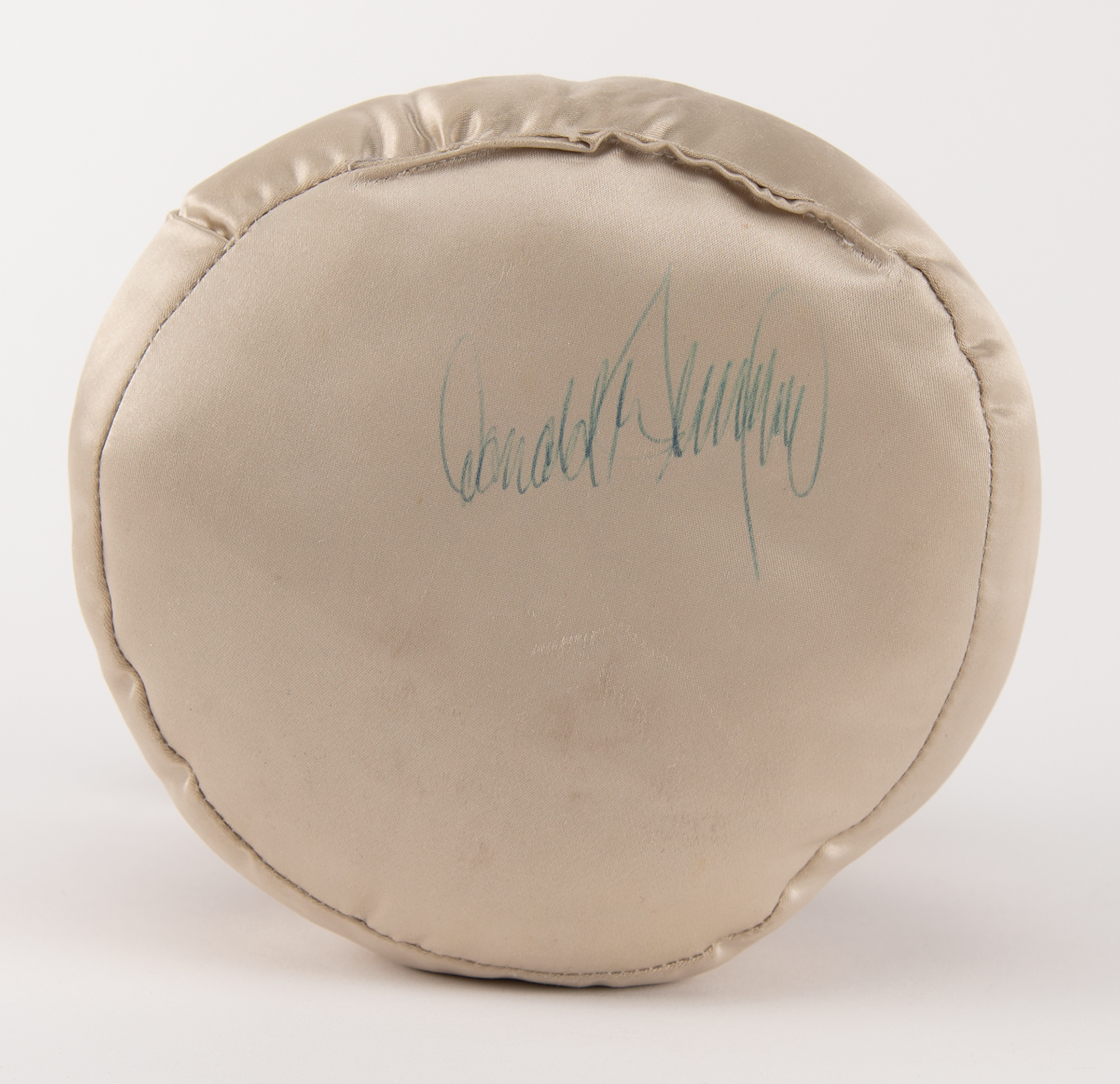 Unusual circular 6˝-diameter pillow with the BMW emblem on the front, signed on the reverse in blue ink by Donald Trump. In fine condition.