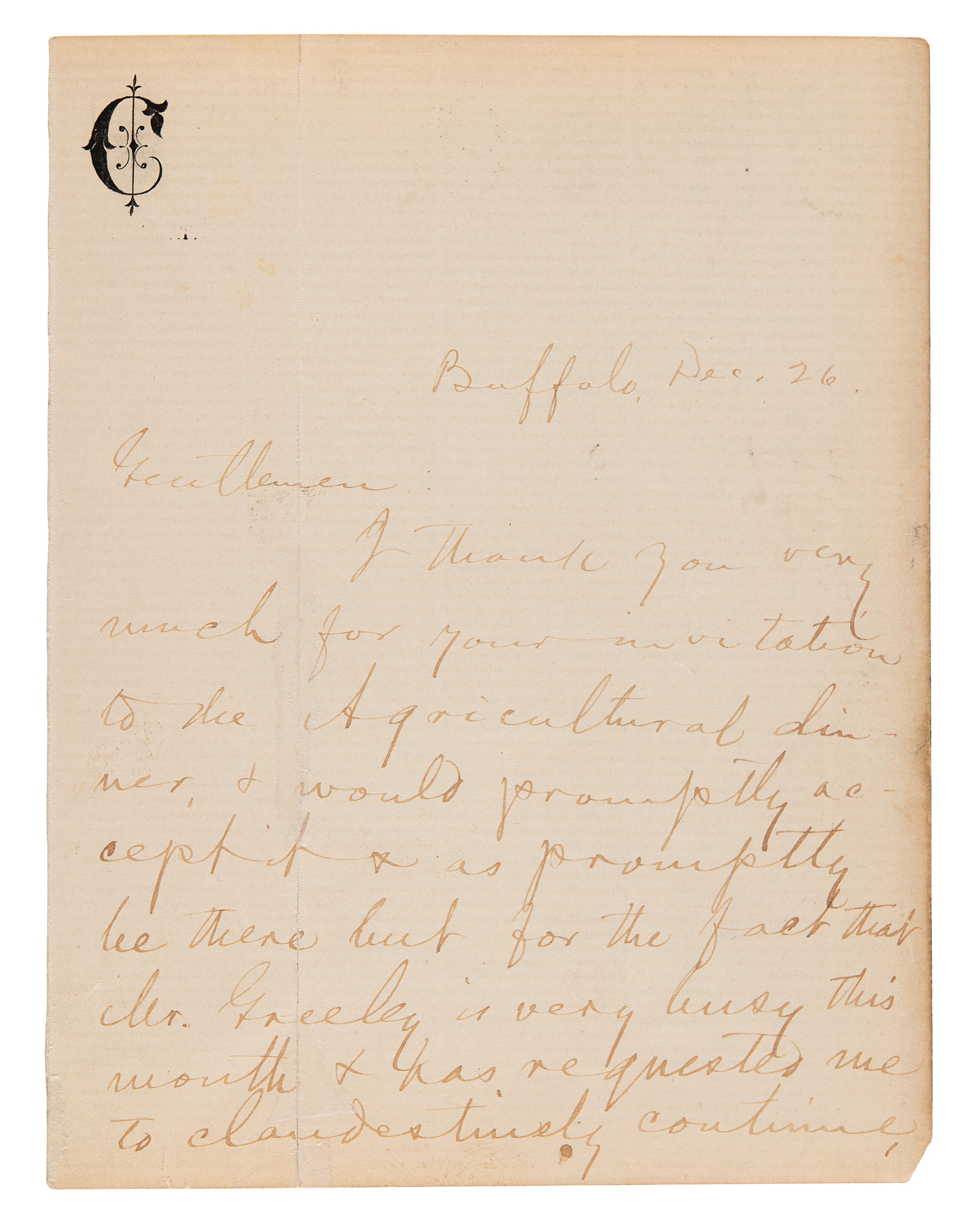 ALS signed "Mark Twain," three pages on two adjoining sheets, 4.25 x 5.25, personal ‘C’ crest letterhead, December 26 [1870]. Addressed from Buffalo, New York, a handwritten letter to the Farmers' Club of the American Institute of the City of New York, declining an invitation with allusion to his recently published sketch 'How I Edited an Agricultural Paper Once' (Galaxy, July 1870). In full: "I thank you very much for your invitation to the Agricultural dinner, & would promptly accept it & as promptly be there but for the fact that Mr. Greeley is very busy this month & has requested me to clandestinely continue for him in The Tribune the articles headed 'What I Know About Farming.' Consequently, the necessity of explaining to the readers of that journal why buttermilk cannot be manufactured profitably at 8 cents a quart out of butter that costs 60 cents a pound compels my stay at home until the article is written." Under Clemens' signature, a notation by A. B. Crandell reads: "Explanatory: As Secretary of the New York Rural Club – Horace Greeley President – I was instructed to invite Mark Twain to one of our dinners. This is his reply." In fine condition.
