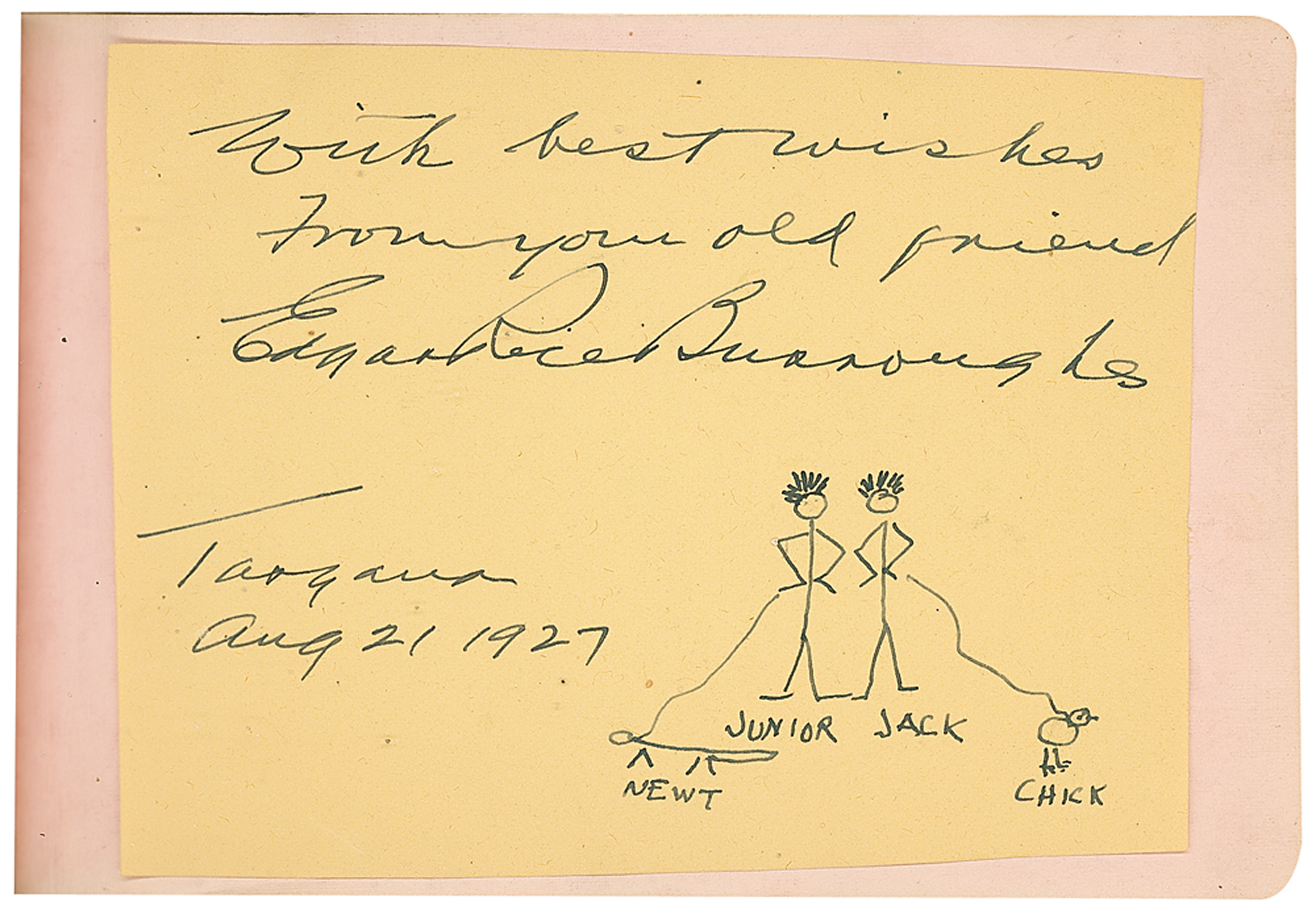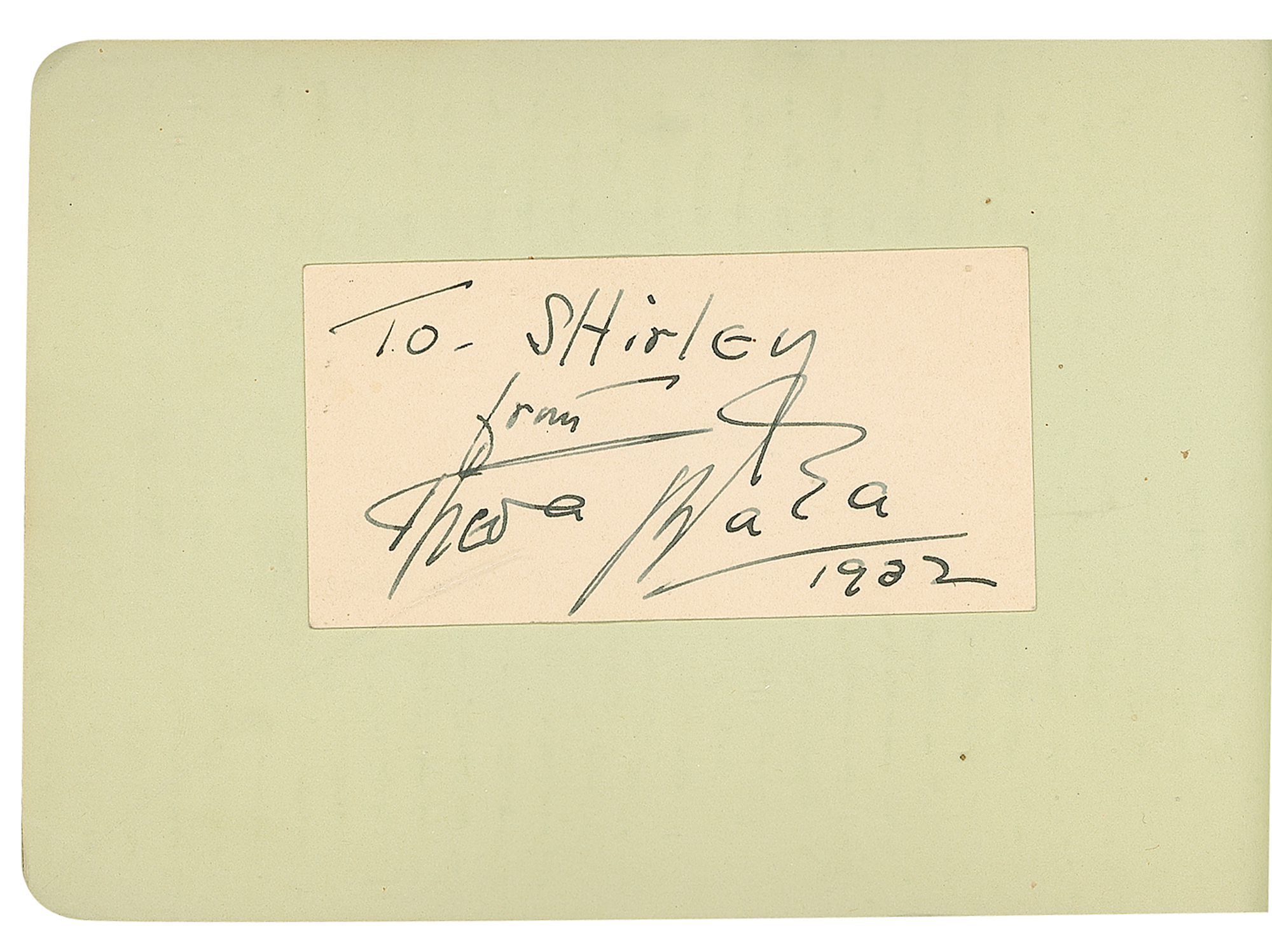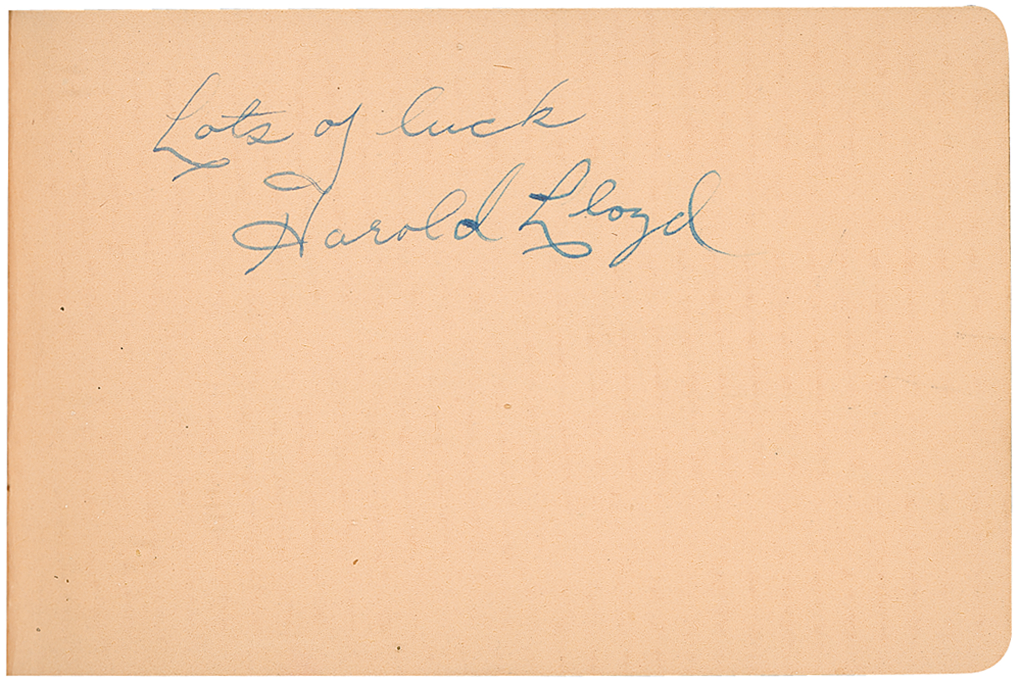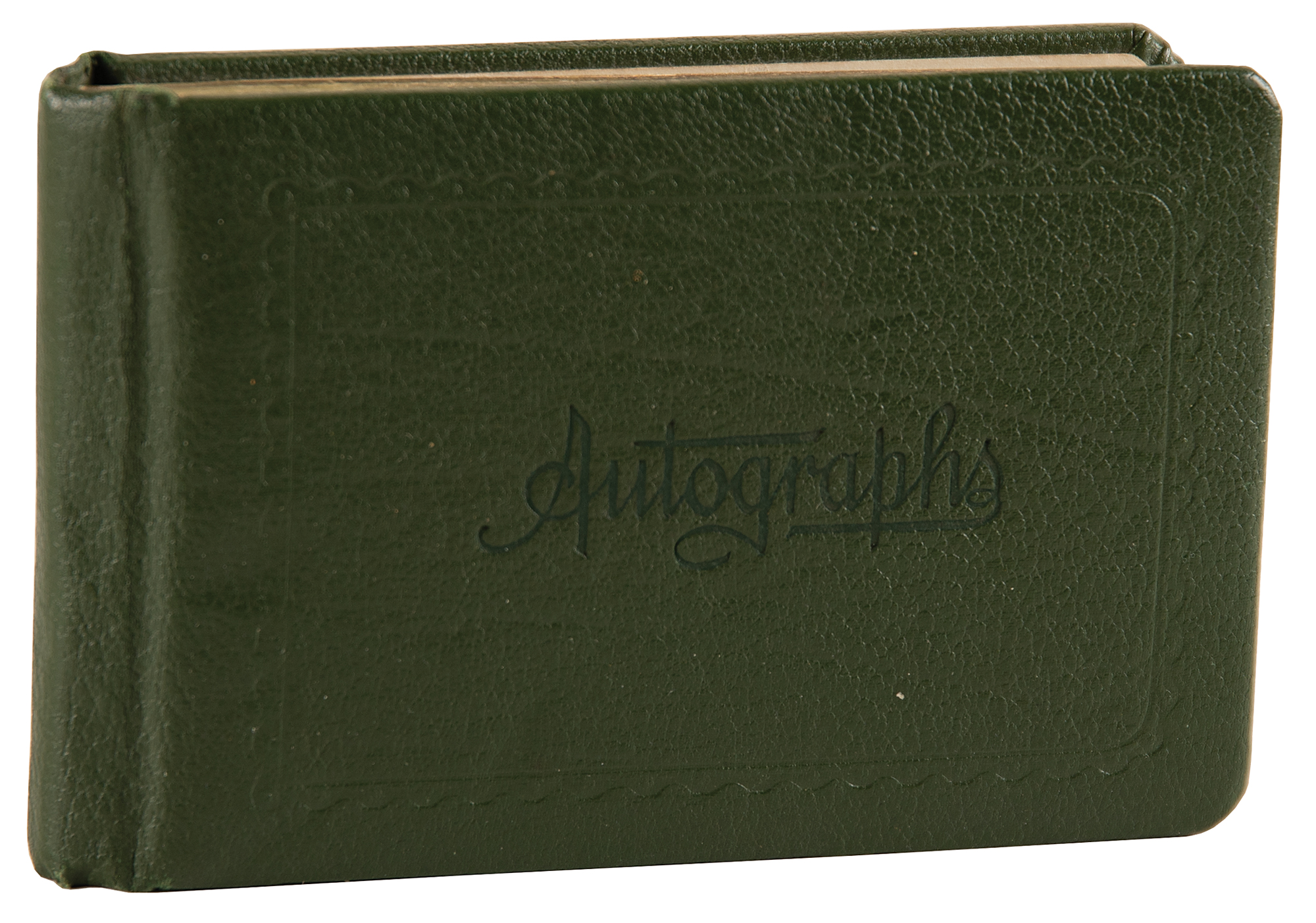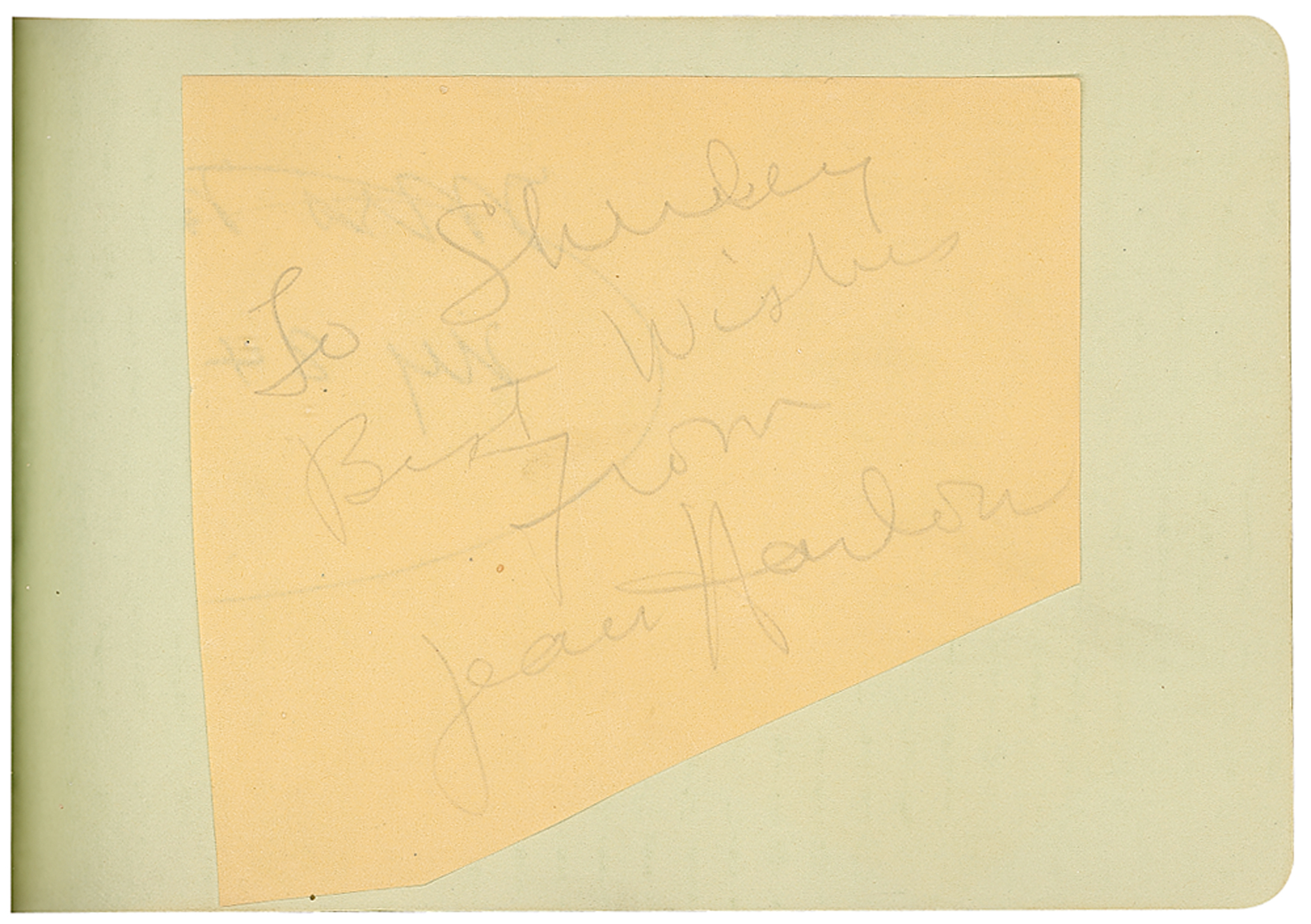 Vintage leather-bound autograph album, 6.25 x 4, signed inside in pencil and ink by over 80 classic actors and actresses, some on affixed cards or slips, most single page and all back-to-back, with some adding inscriptions to Shirley. Signers include: Jean Harlow, John Wayne, Harold Lloyd, Al Jolson, Edgar Rice Burroughs (adding an original sketch), Theda Bara, Clara Bow, Marlene Dietrich, Joan Crawford, Ginger Rogers, Jackie Cooper, Charlotte Greenwood, Edna May Oliver, Ramon Novarro, Joel McCrea, Lew Ayres, Janet Gaynor, Loretta Young, Norma Shearer, Ruby Keeler, May Robson, and more. In very good to fine condition, with rippling and wrinkling to pages with affixed signatures, and scattered toning and soiling. The consignor notes that many of the signatures were originally obtained at a Los Angeles country club in the 1920s and 1930s.