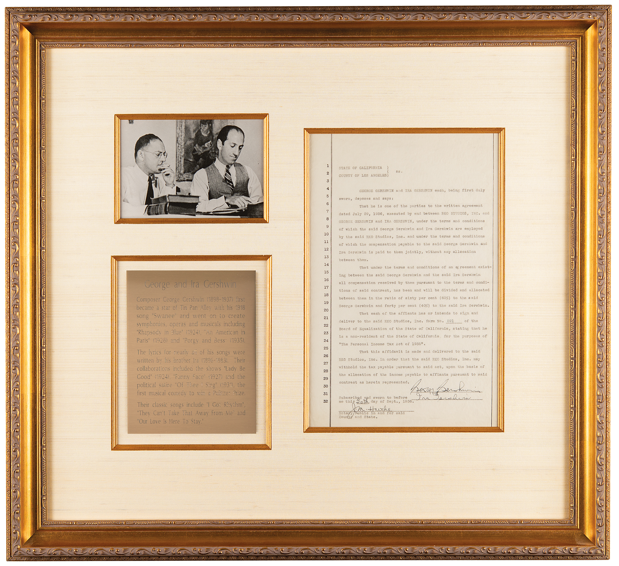 Rare DS, one page, 8.25 x 12.75, September 30, 1936. An agreement between "RKO Studios, Inc., and George Gershwin and Ira Gershwin…under the terms and conditions of which the compensation payable to the said George Gershwin and Ira Gershwin…will be divided and allocated between them in the ratio of sixty per cent (60%) to the said George Gershwin and forty per cent (40%) to the said Ira Gershwin." Nicely signed at the conclusion by both George and Ira Gershwin, and countersigned by a notary. Attractively cloth-matted and framed with an image and engraved biographical plaque to an overall size of 26.5 x 24.5. In fine condition.