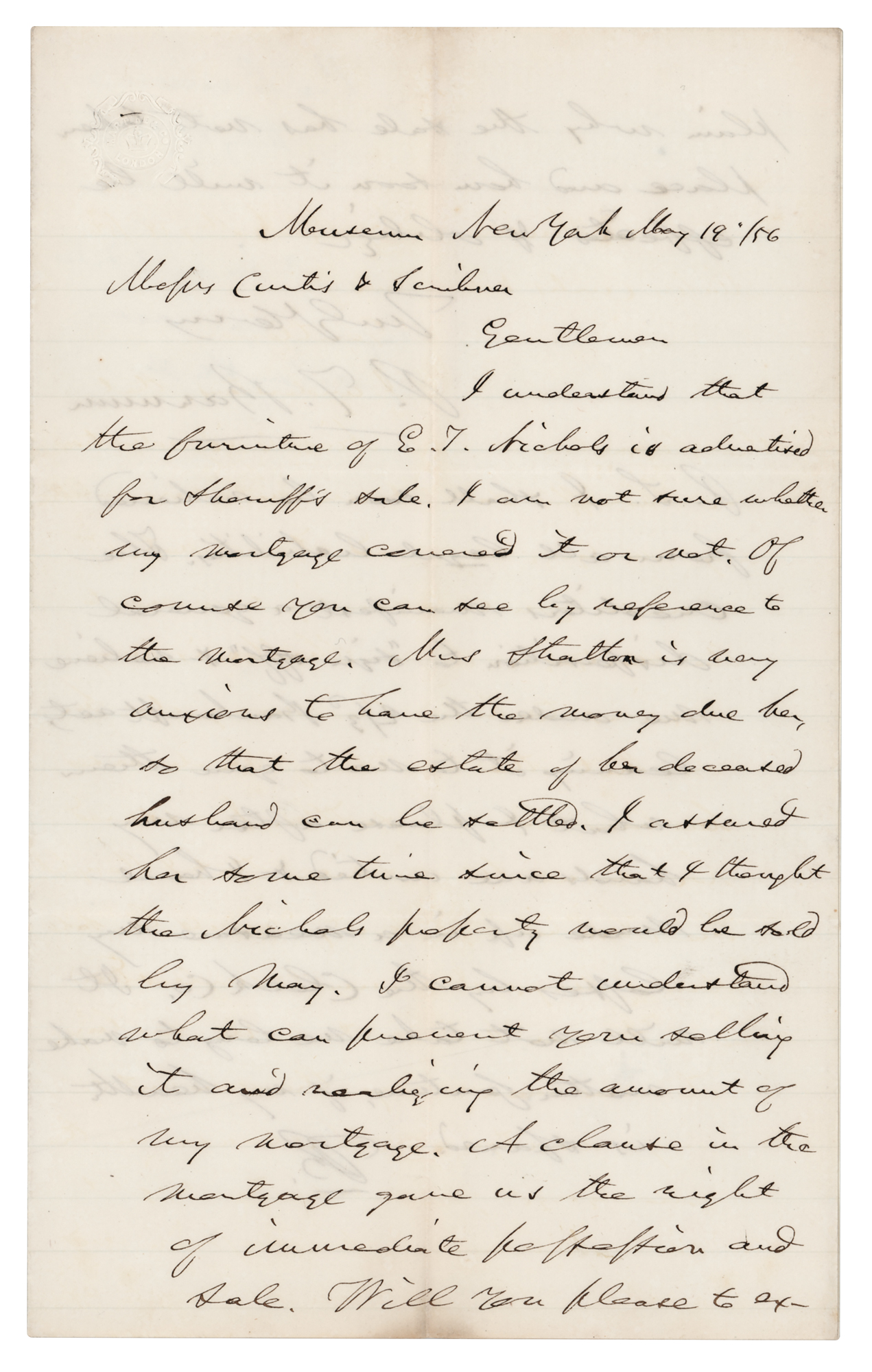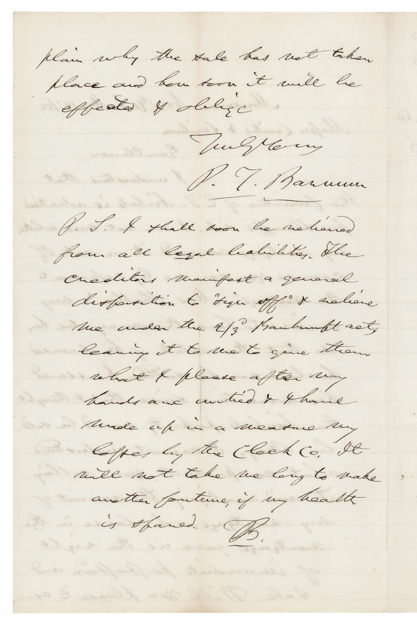 ALS, one page, both sides, 5 x 8, May 19, 1856. Addressed from his famous New York museum, a handwritten letter to the firm of Curtis and Scribner, in part: “I understand that the furniture of E. T. Nichols is advertised for Sheriff's sale. I am not sure whether my mortgage covered it or not. Of course you can see my reference to the mortgage. Mrs. Stratten is very anxious to have the money due her, so that the estate of her deceased husband can be settled…I cannot understand what can prevent you selling it…The mortgage gave us the right of immediate benefaction and sale. Will you please to explain why the sale has not taken place.” Barnum adds a lengthy postscript, signing "B" at the conclusion, in part: “I shall soon be relieved from all legal liabilities…under the 2/3 Bankruptcy Act, leaving it to me to give them what I please. It will not take me long to make another fortune.” The reverse is docketed in another hand. In fine condition. At this stage in his eventful life, Barnum had recently retired. Faced with insistent creditors, he rekindled his entrepreneurial spirit, eventually assembling the ‘Greatest Show on Earth,’ which evolved into the Ringling Brothers and Barnum and Bailey Circus.