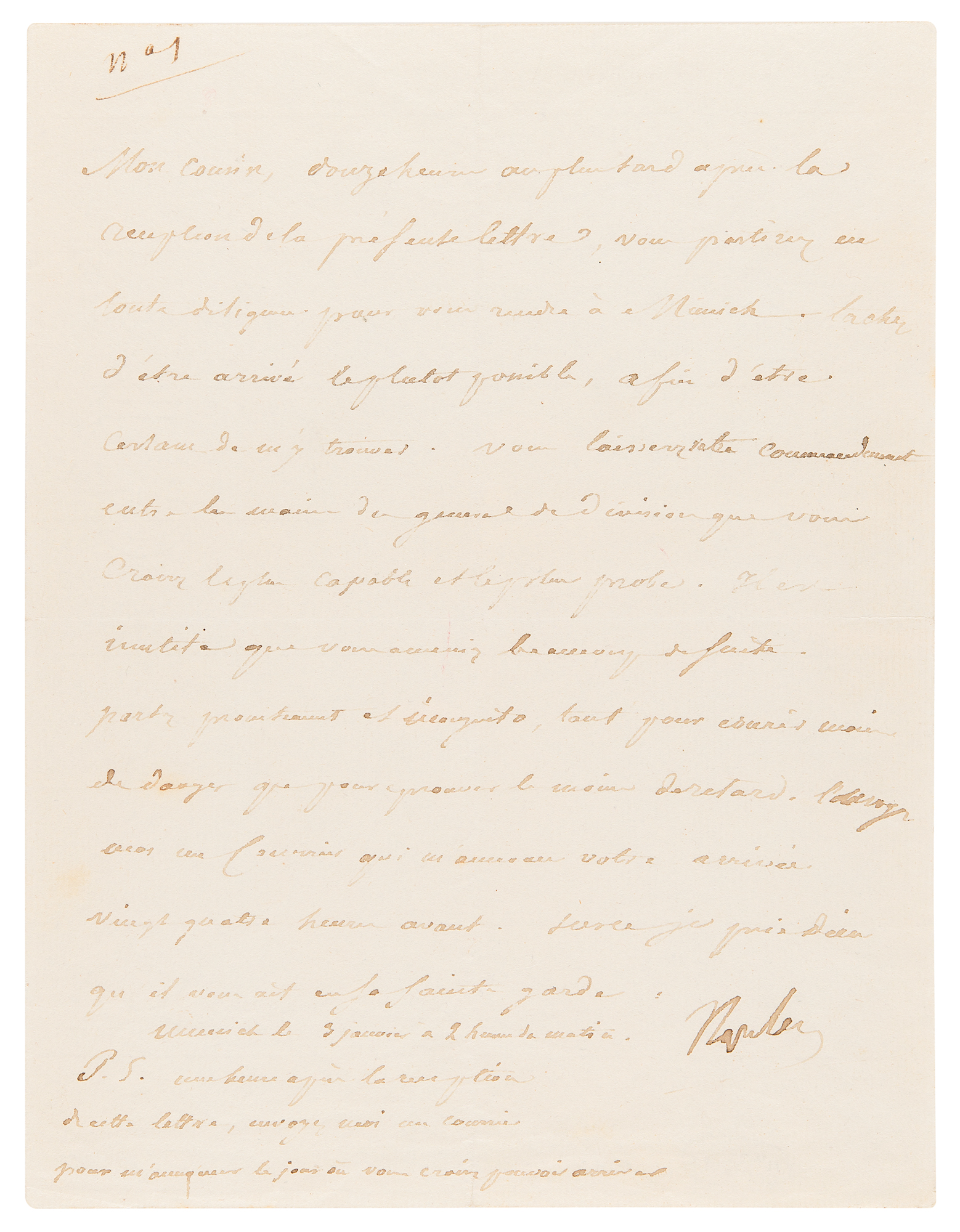 Noteworthy LS in French, one page, 6.5 x 8.5, January 3 [1806] Letter to his stepson Eugène de Beauharnais, in full (translated): “Twelve hours at latest after the receipt of this letter you will set off for Munich in all possible haste. Take care to arrive as soon as possible, then you may still find us there. Leave your command with whichever of your divisional generals you consider most capable and honest. It will be useless for you to bring a large suite. Leave at once, incognito, as much to avoid danger as to avoid delays. Send me a courier to announce to me that you will be arriving twenty four hours after him." The short postscript reads "One hour after you get this send me a courier with the day of your arrival." In fine condition.