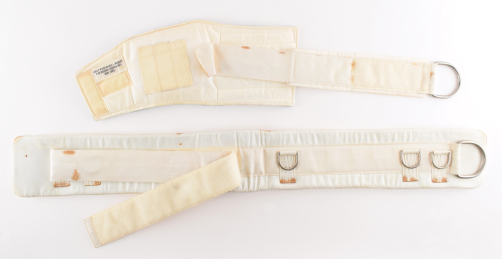 Two belt pads designed for use on the Space Shuttle treadmill: a pad with a tag reading: "Belt Pad Assy—Right, P/N SEG46120253-301, S/N 1003"; and a longer pad annotated, "WLST410313-301 Assembly, Trainer, Class III." In overall very good to fine condition.