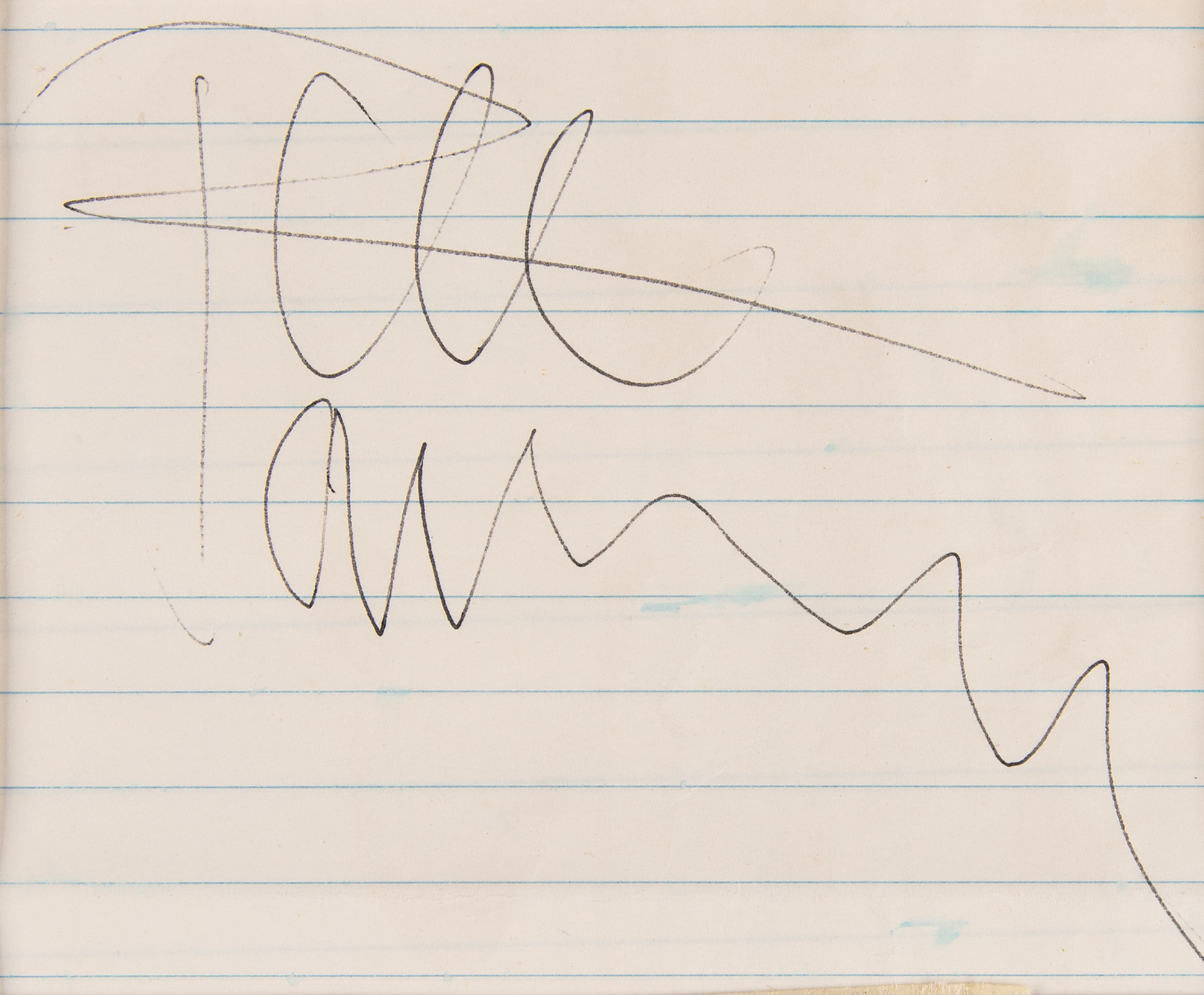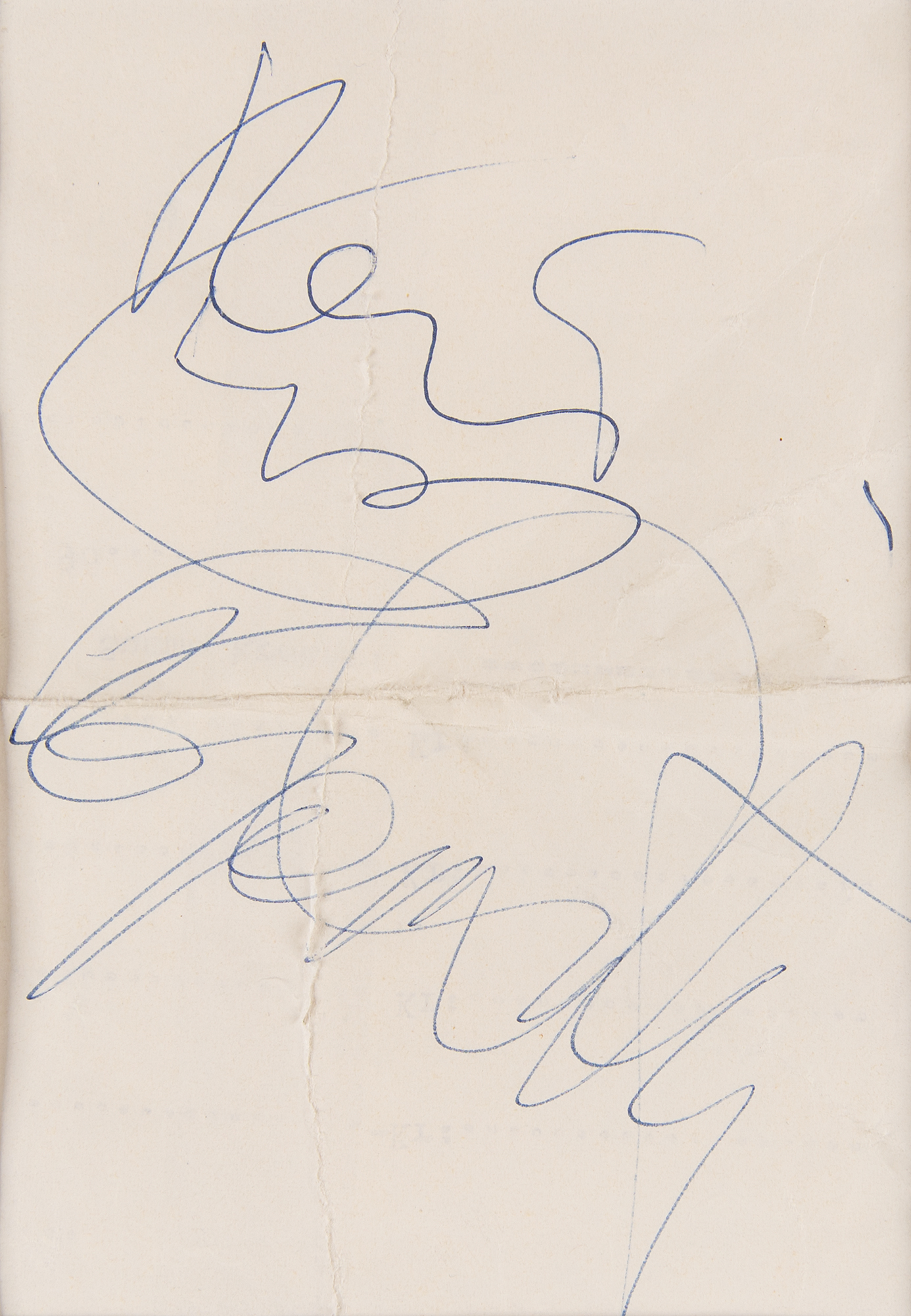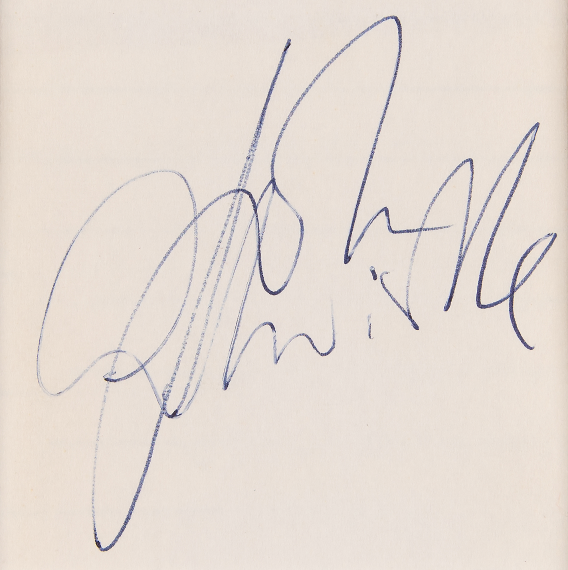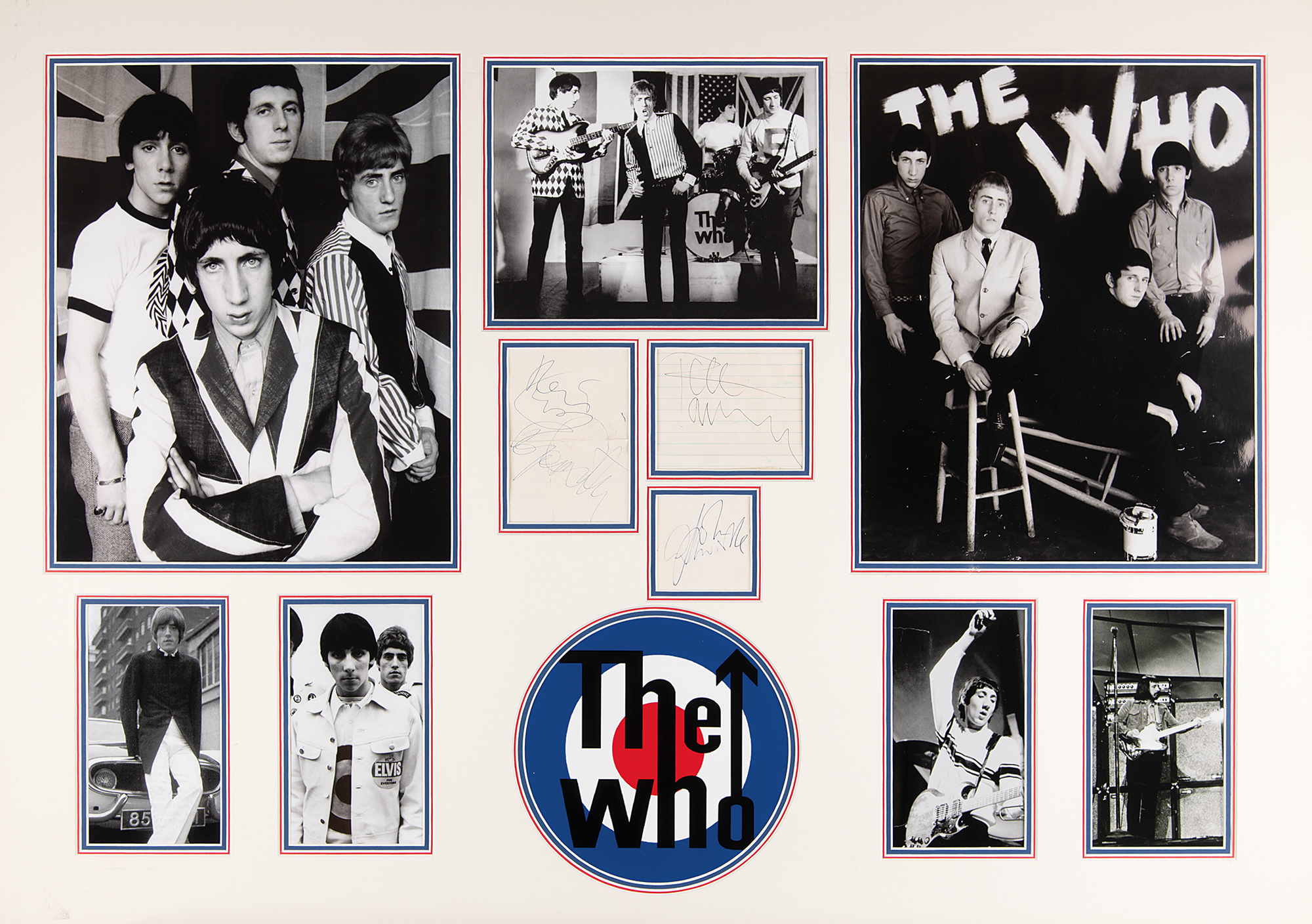 Vintage ballpoint signatures of The Who — “Keith Moon” and “Roger Daltrey,” “Pete Townshend,” and “John Entwistle” — on three off-white sheets ranging in size from 2.75 x 2.75 to 3.5 x 5. The signatures are double-matted with eight photographs of the band and their ‘RAF roundel’ logo to an overall size of 39.25 x 27.5. In overall very good to fine condition, with creasing and folds to the Moon/Daltrey slip, and two tears to the Townshend photo.