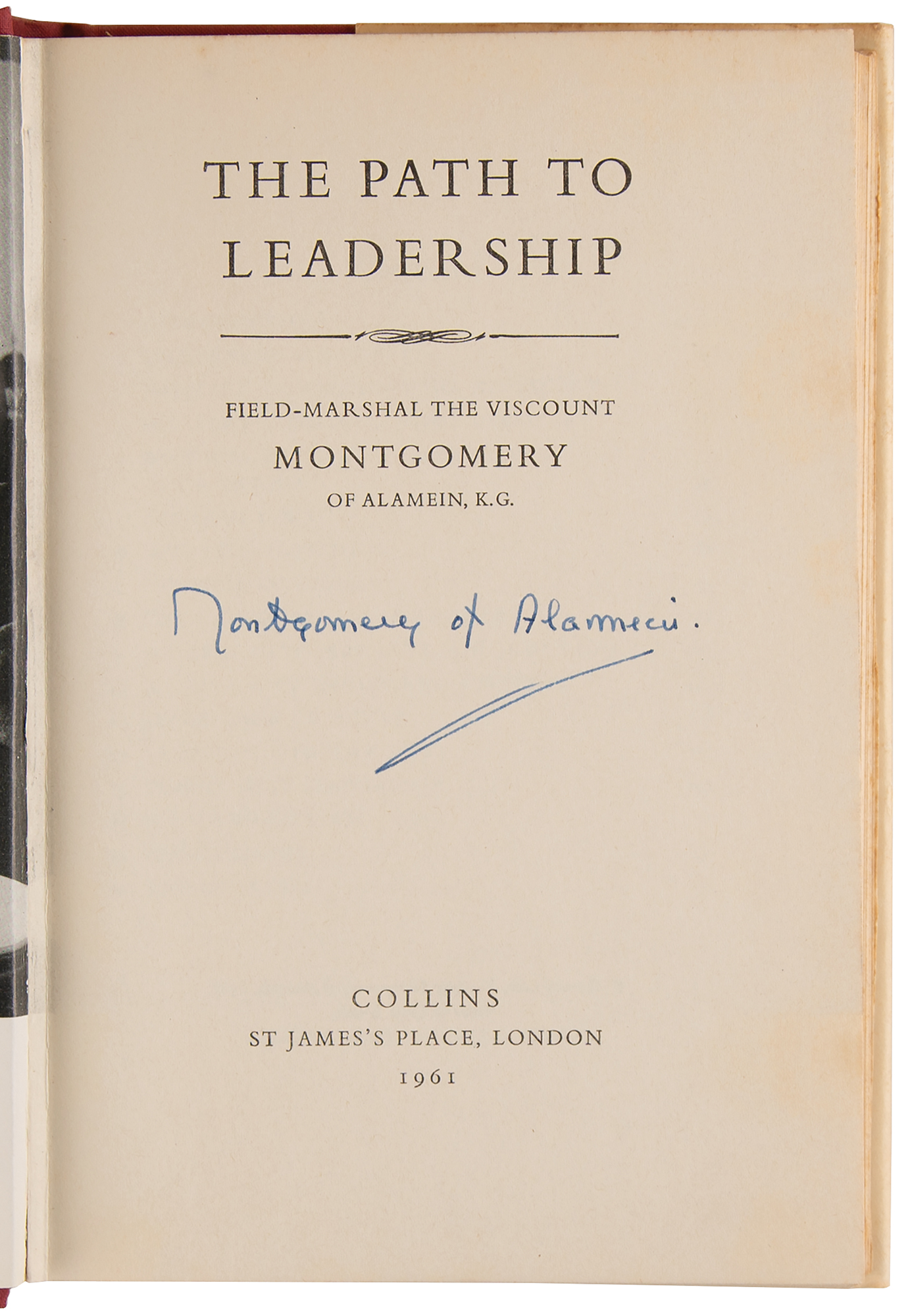 Signed book: The Path to Leadership. First edition. London: Collins, 1961. Hardcover with dust jacket, 5.75 x 8.5, 256 pages. Signed on the title page in fountain pen, "Montgomery of Alamein." In fine condition.