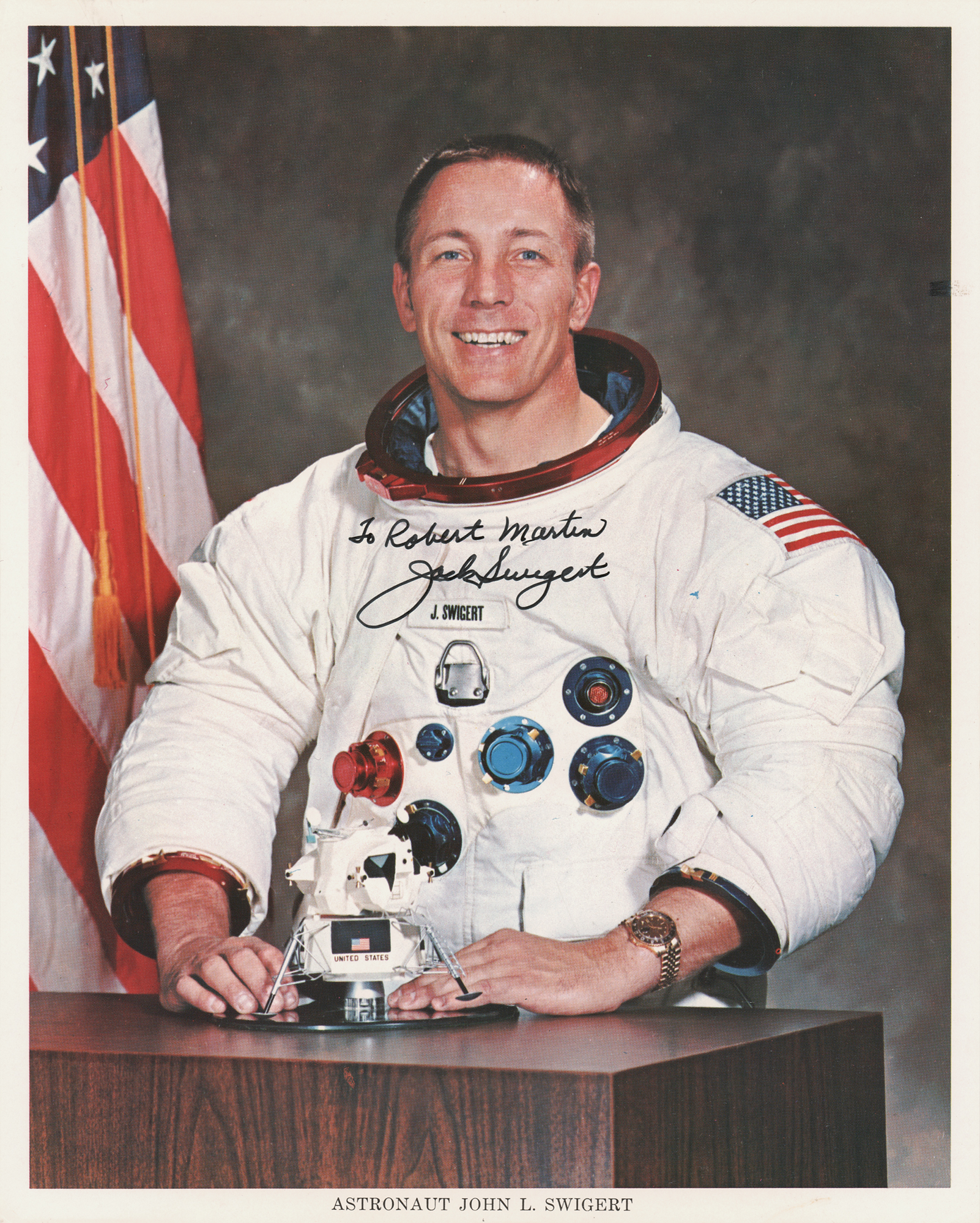 Uncommon official color 8 x 10 NASA lithograph of Jack Swigert posing in his white space suit with a lunar module model and the American flag, neatly signed and inscribed in black felt tip, "To Robert Martin, Jack Swigert.” In fine condition, with a couple of small ceases to the upper left corner.
