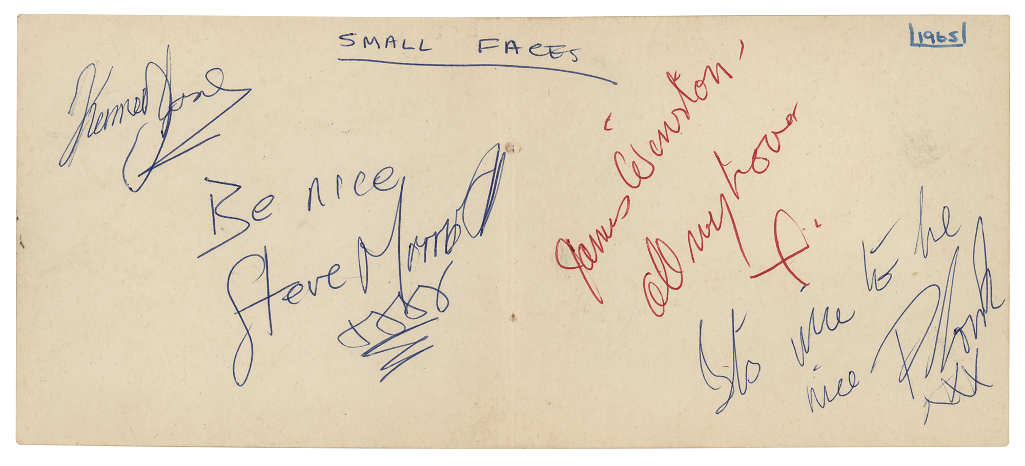 Vintage ballpoint signatures of the Small Faces—Steve Marriott, Kenny Jones, Ronnie ‘Plonk’ Lane, and Jimmy Winston—on an off-white 9 x 5 autograph album centerfold. The consignor notes that the autographs were obtained in Bristol, England in 1965. In fine condition. Accompanied by a certificate of authenticity from Tracks.