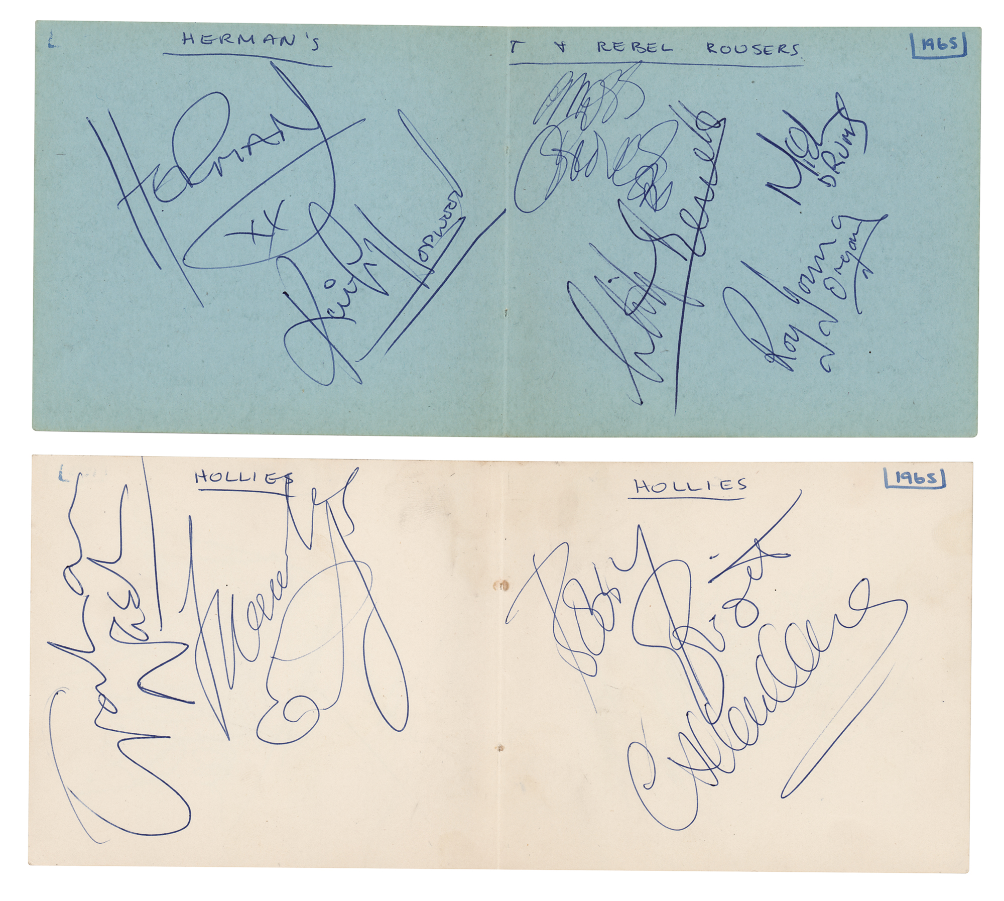Vintage ballpoint signatures of The Kinks and The Hollies on two autograph album center fold pages, both measuring 9 x 4. Members of Herman’s Hermits include Peter Noone as “Herman,” Keith Hopwood, Barry Whitwam, Derek Leckenby, and Karl Green; and members of The Hollies include Eric Haydock, Allan Clarke, Graham Nash, Bobby Elliott, and one other; the reverse of the Hollies signed page contains of three Hermits members. The pages also contain signatures of Cliff Bennett, The Rebel Rousers, and The Measles. The consignor notes that the autographs were obtained in Bristol, England in 1965. In fine condition. Accompanied by a certificate of authenticity from Tracks.