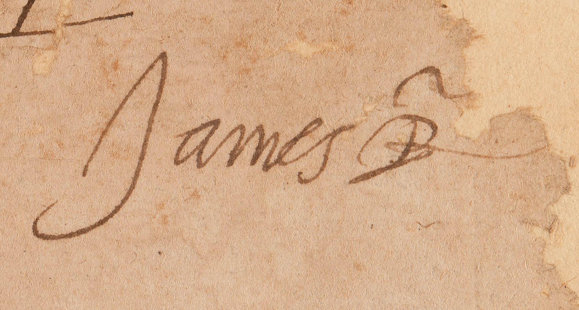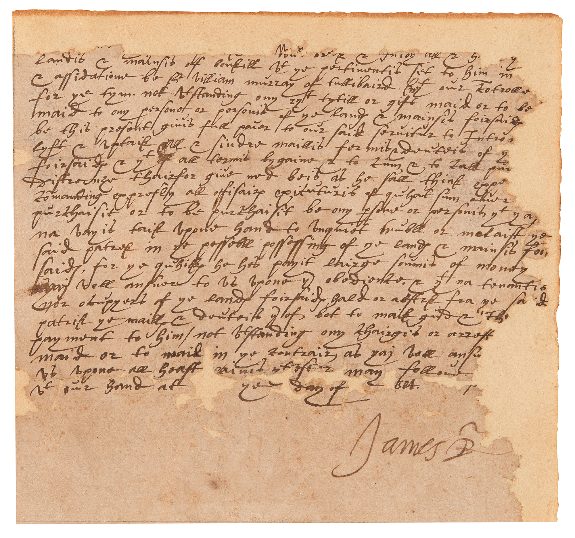 King of England and Ireland (1566–1625) under whom the 'Golden Age' of Elizabethan literature and drama continued, and who famously sponsored the translation of the Bible into English; as King James VI, he ruled Scotland from 1567 until his death. Manuscript DS, signed “James R,” one page, 6.25 x 6, dated 1584. Document in relation to William Murray of Tullibardine, the Comptroller of Scotland, in part: "S[i]r William Murray of Tullibaird knycht our co[n]troller for the tym not w[i]thstanding ony rycht tytill or gift maid or to be maid to ony persone or personis of the landis & mainisi foirsaidis be this present givis full power to our said servitur to Intro (met) lyft & uptaik all & th[a]t of all termis & deuteis of the(e) foirsaidis & th[a]t of all termis bygaine & to cum & to call pur(sue) distreinye thairfor give ned beis, as he sall think expe(dient)." Backed by a slightly larger sheet and in good to very good condition, with substantial paper loss, remarkably not adversely affecting the signature.