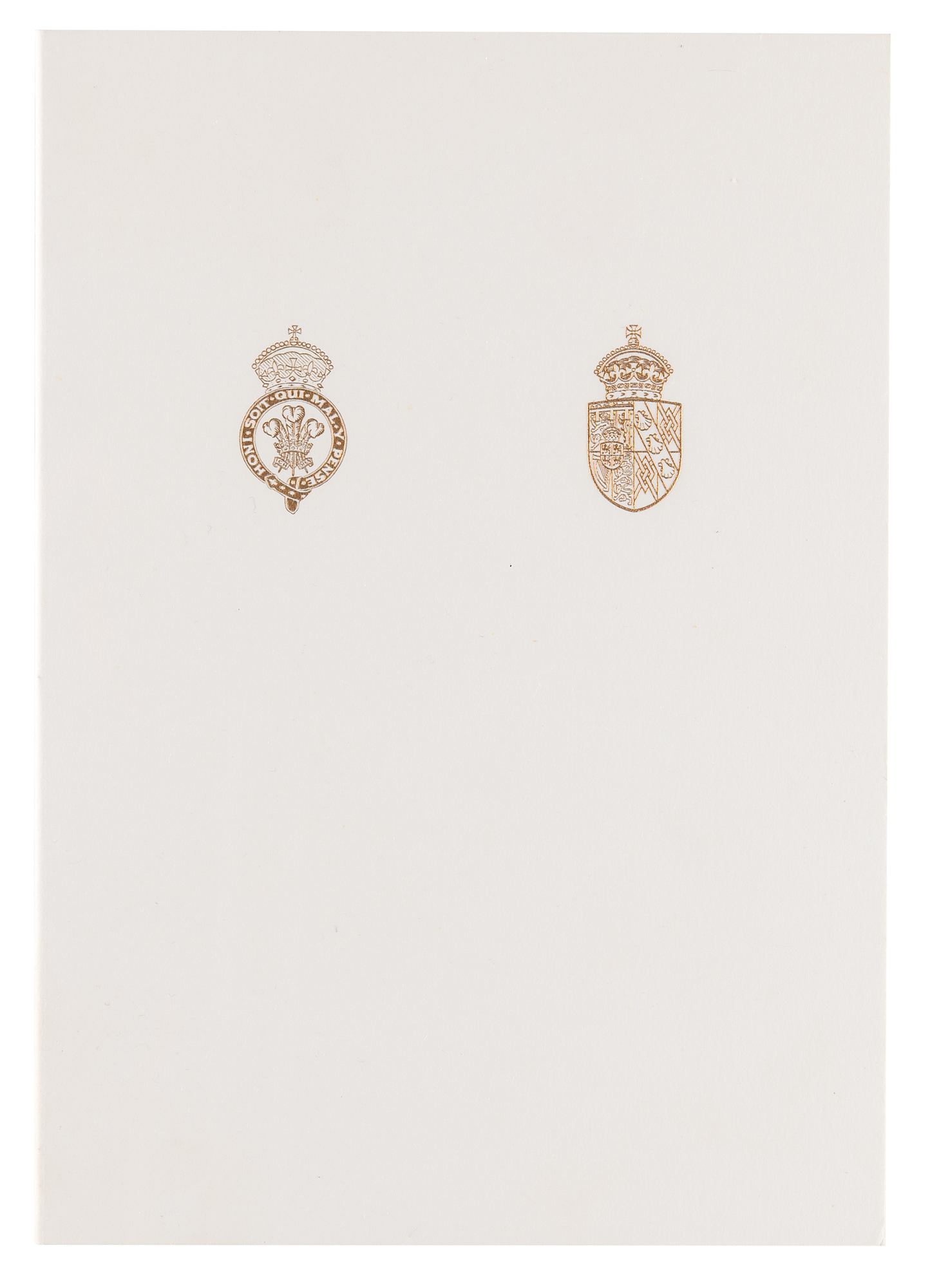 Appealing 1986 Christmas card embossed on the front with the Prince of Wales’s feathers and Order of the Garter motto and the Spencer family arms, measuring 10.25 x 7.25 open, featuring an affixed color photo of the royal couple posing with their young sons Prince William and Prince Harry, signed and inscribed in fountain pen, "To you both, from Charles and" and "Diana." In very fine condition.