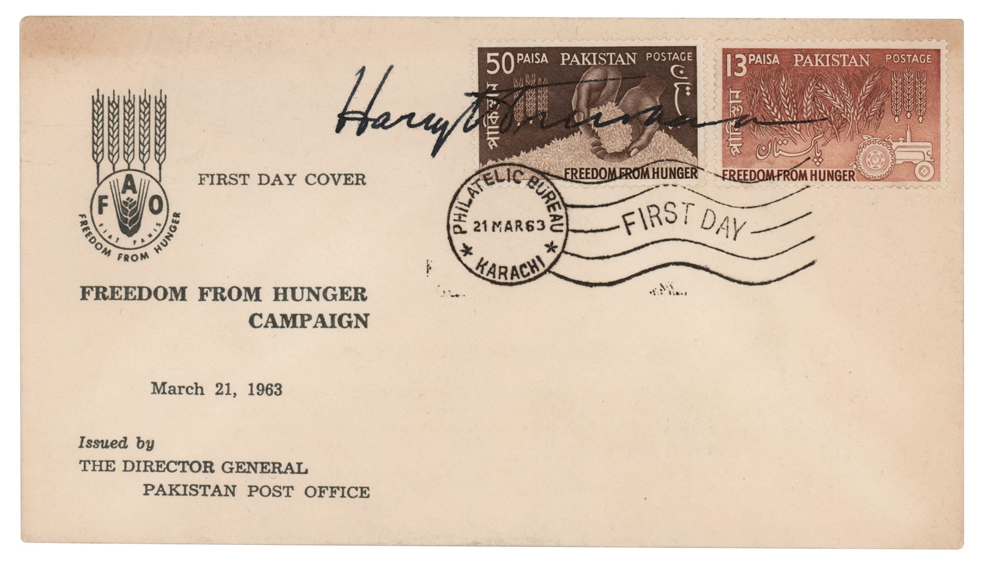 Pakistani FDC with a cachet honoring the 'Freedom from Hunger' campaign, signed across the stamps in bold fountain pen, "Harry S. Truman". In fine condition.