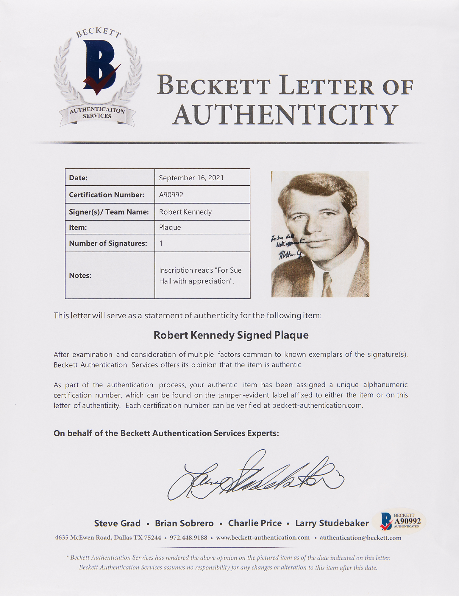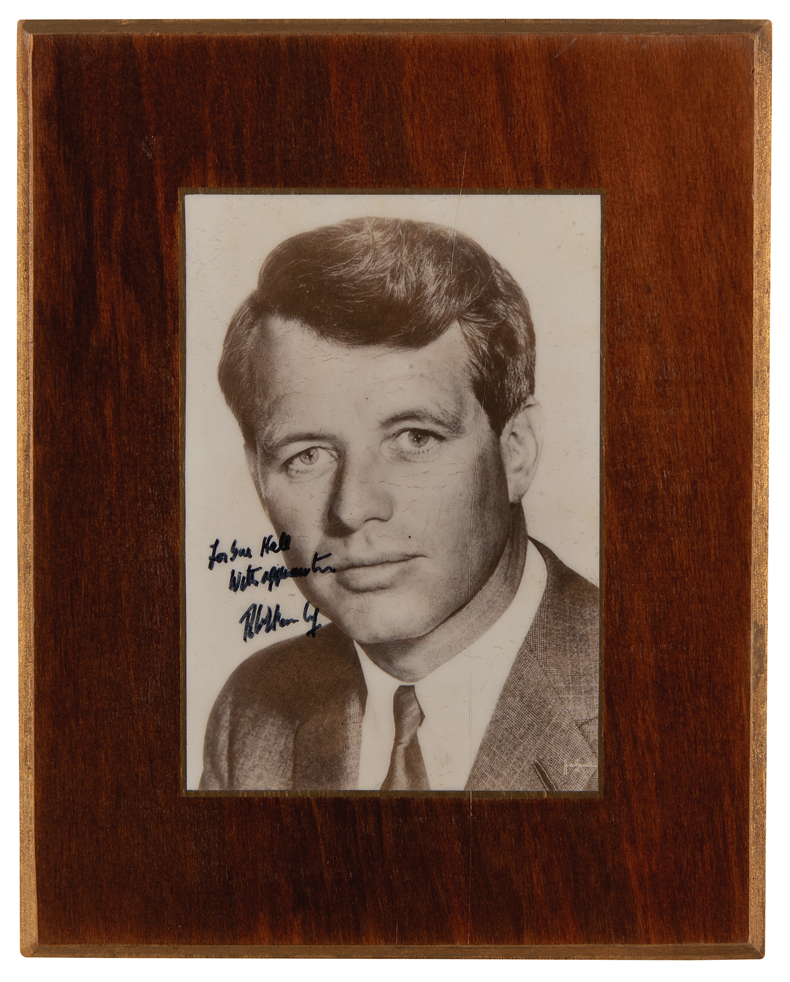 Glossy 4.25 x 6.25 portrait photo of Robert F. Kennedy, signed and inscribed in black felt tip, “For Sue Hall, with appreciation, Robert Kennedy.” The photo is mounted and lacquered on a wooden 8 x 10 presentation mount. In fine condition, with some light scuffing. Accompanied by a full letter of authenticity from Beckett Authentication Services.