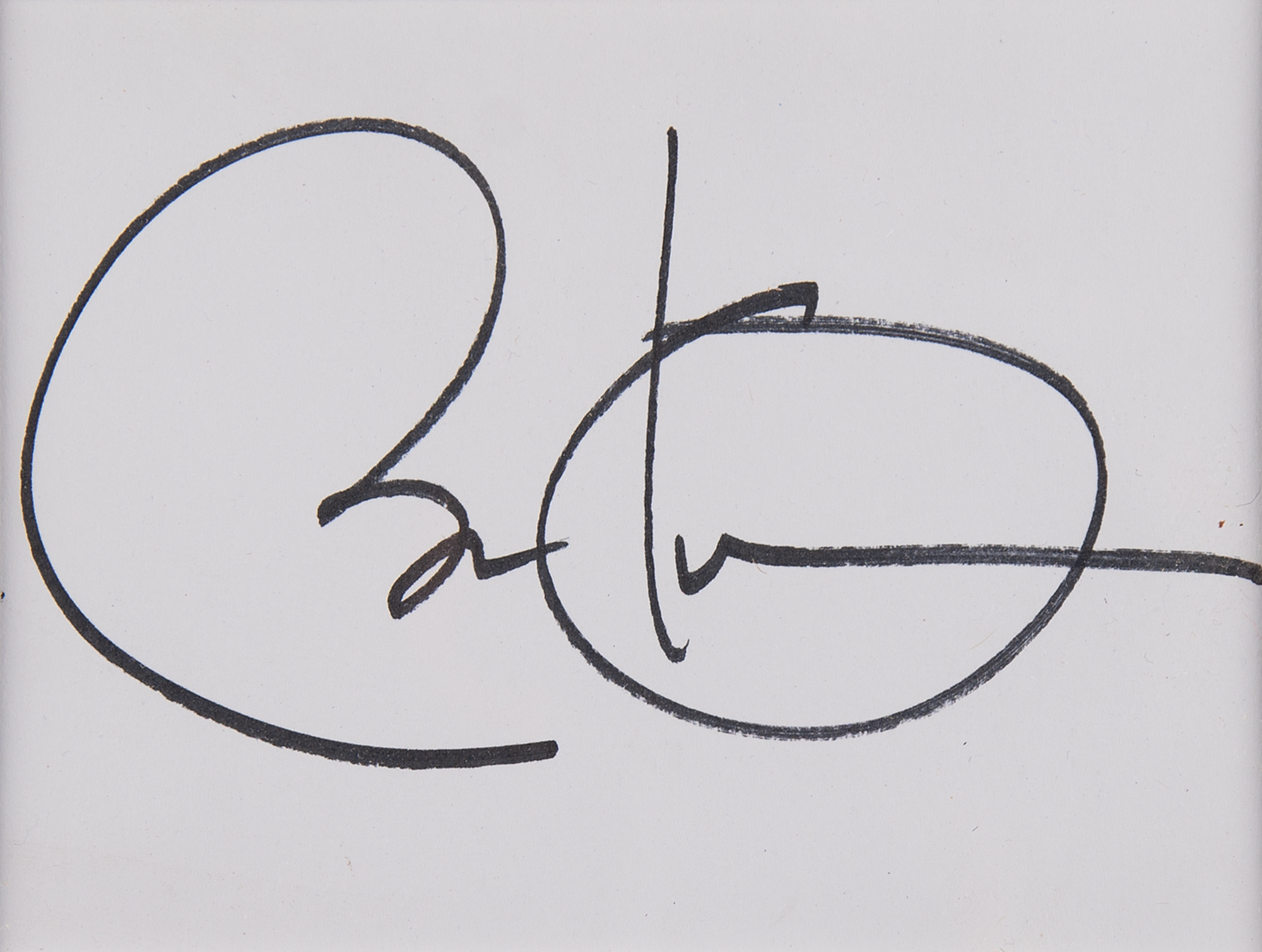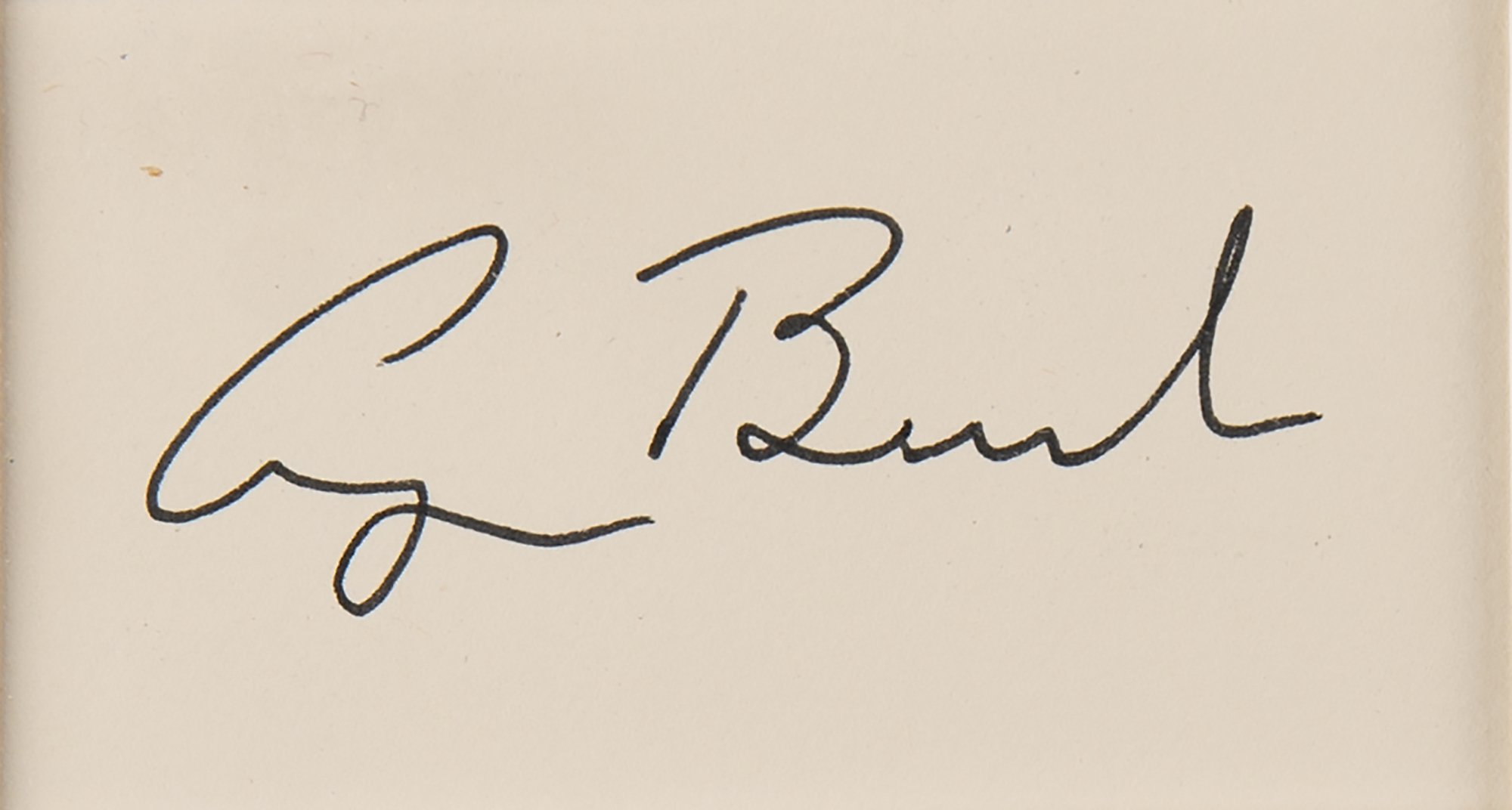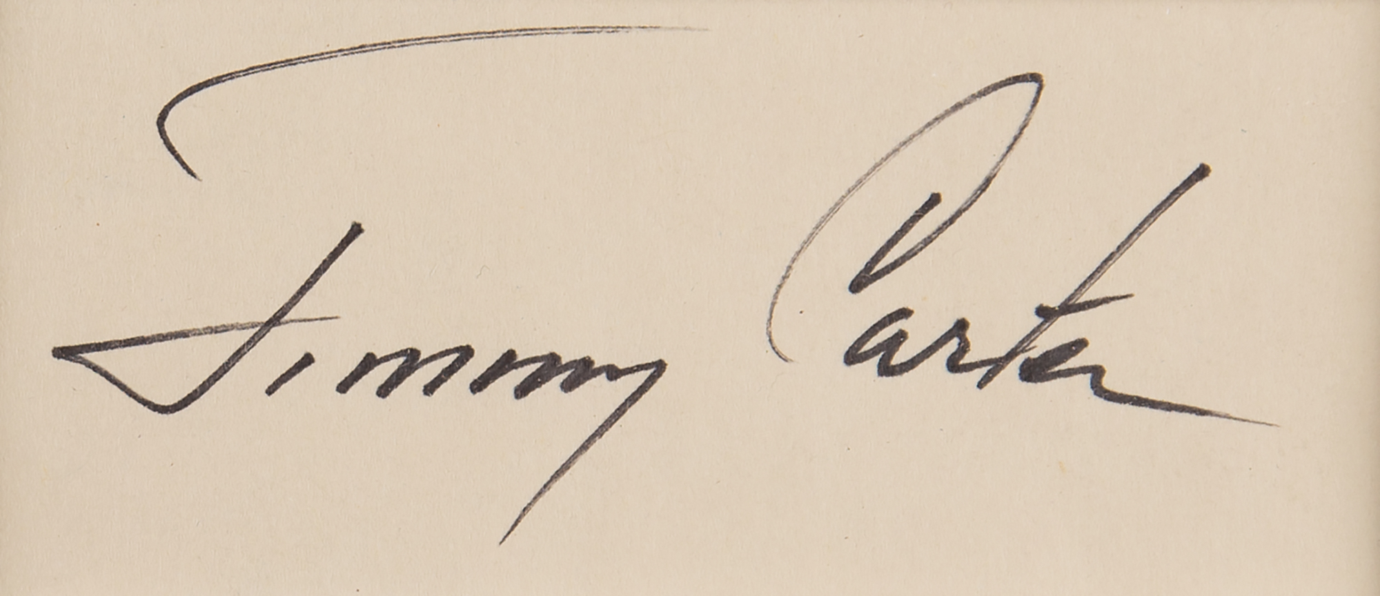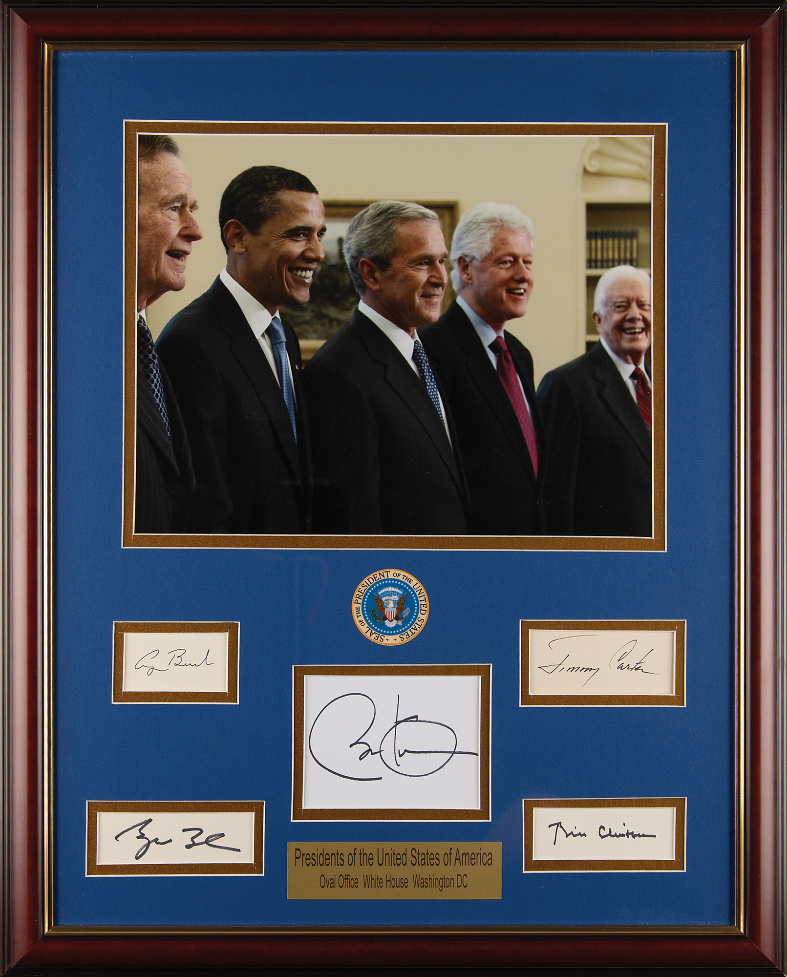 Desirable group of five ink signatures—"Jimmy Carter," "George Bush," "Bill Clinton," "George W. Bush," and "Barack Obama"—on individual slips, ranging in size from 2.5 x 1.5 to 4.5 x 3.5, handsomely double-matted and framed with a portrait of the five presidents to an overall size of 20.5 x 25.5. In overall very fine condition. A fantastic presidential autograph display.