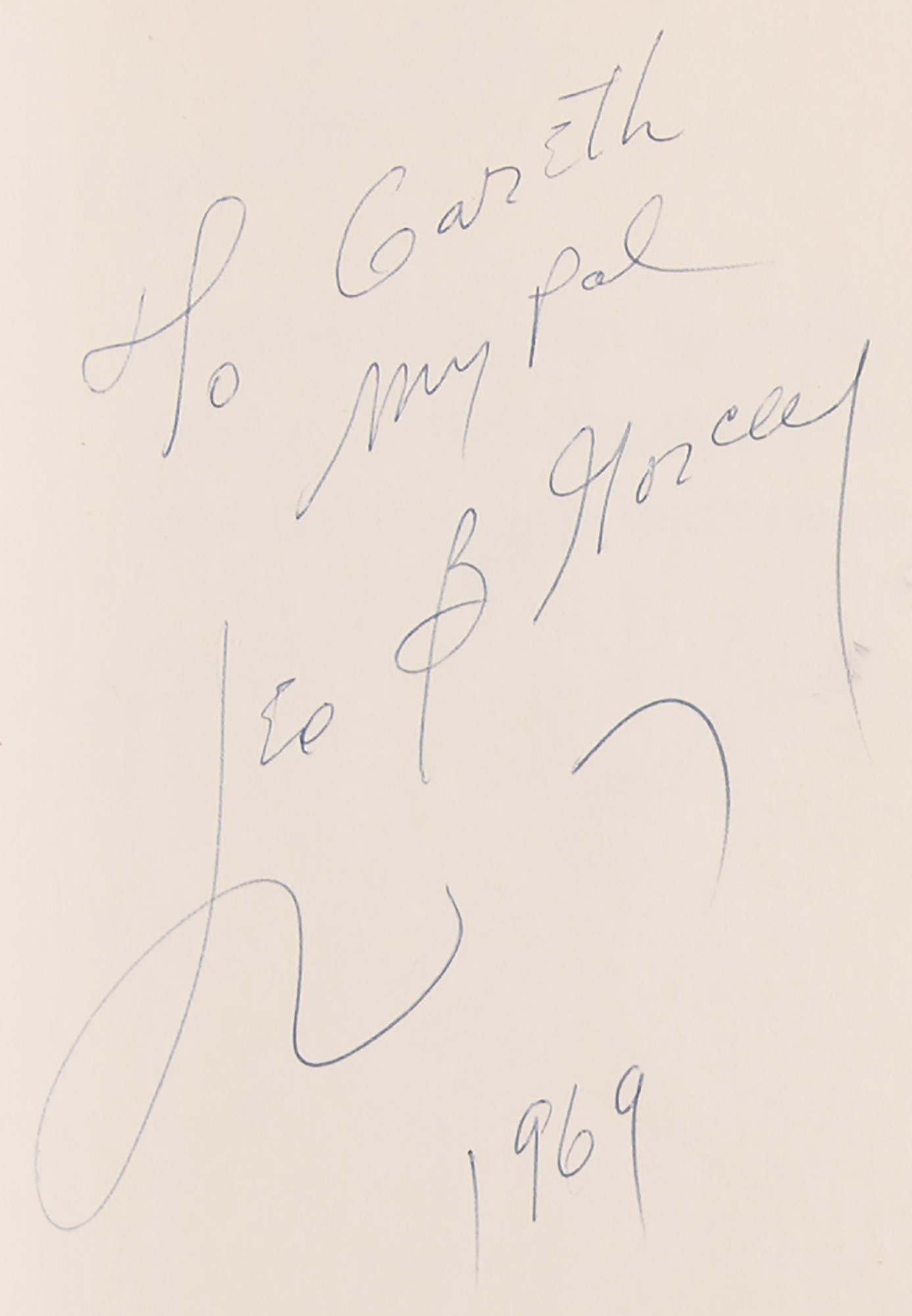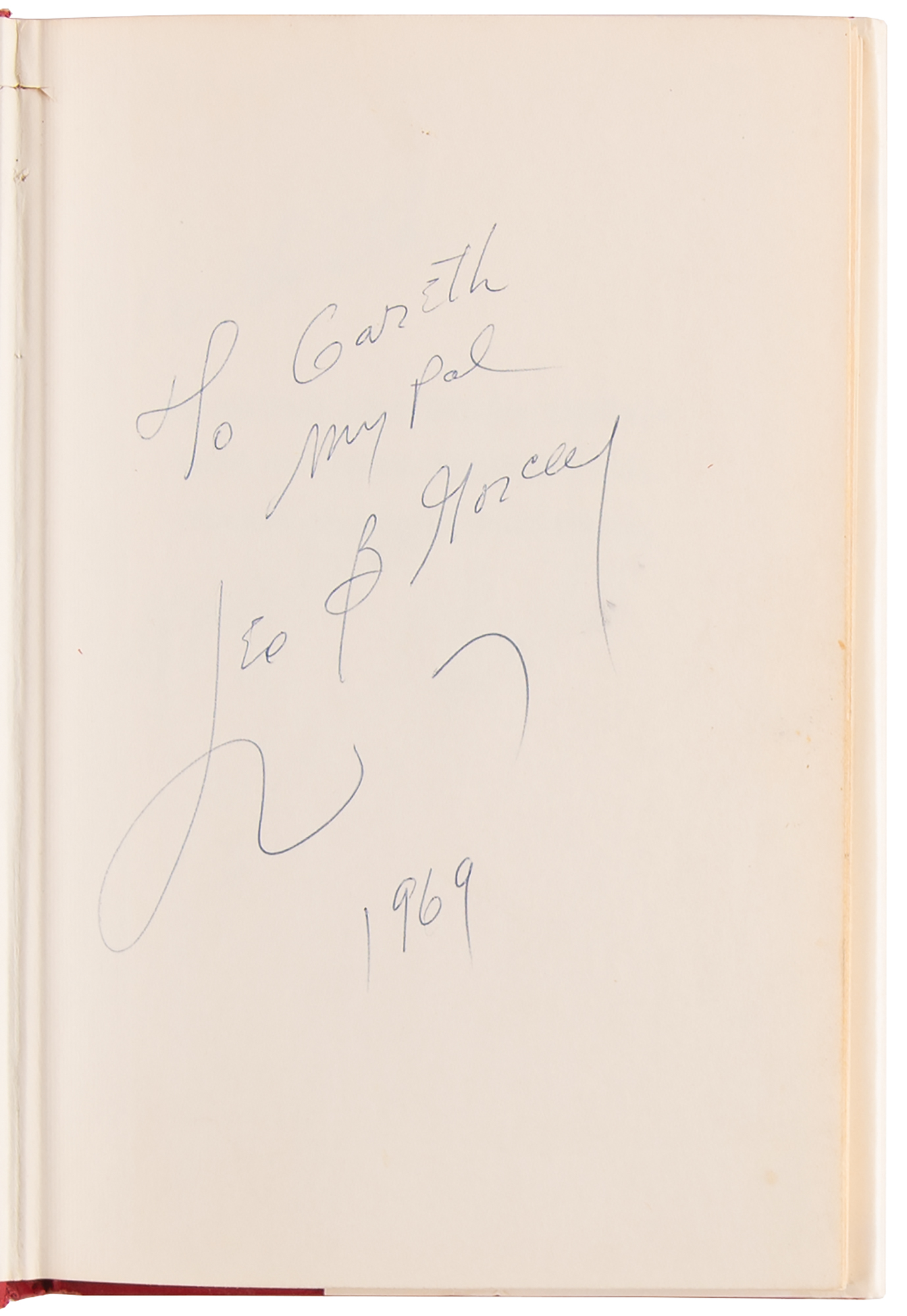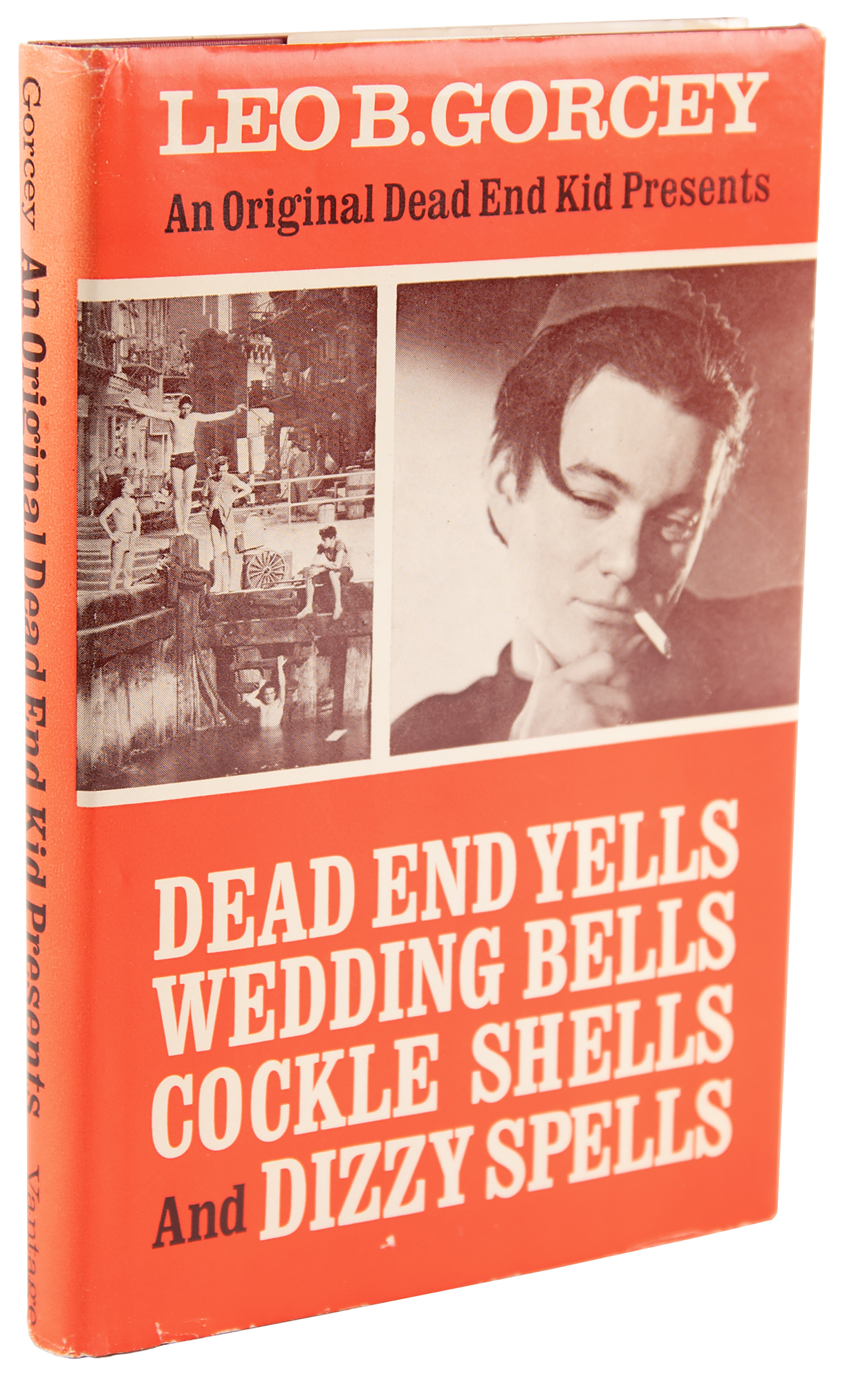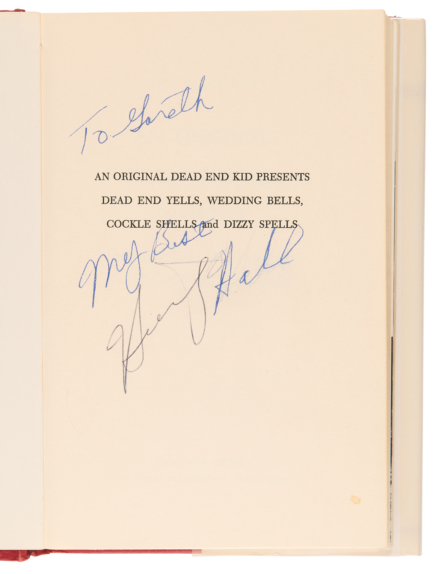 Stage and film actor (1917–1969) known for portraying the leader of a group of hooligans known variously as the Dead End Kids, The East Side Kids, and The Bowery Boys. Signed book: Dead End Yells, Wedding Bells, Cockle Shells and Dizzy Spells. First edition. NY: Wantage Press, 1967. Hardcover with dust jacket, 5.5 x 8.25, 111 pages. Signed and inscribed on the first free end page in blue ballpoint, "To Gareth, my pal, Leo B. Gorcey, 1969." Additionally signed and inscribed on the half-title page by Huntz Hall, and signed and inscribed again by Huntz Hall and Gabriel Dell on illustration plates. In fine condition, with pen troubles plaguing one of Hall's signatures.