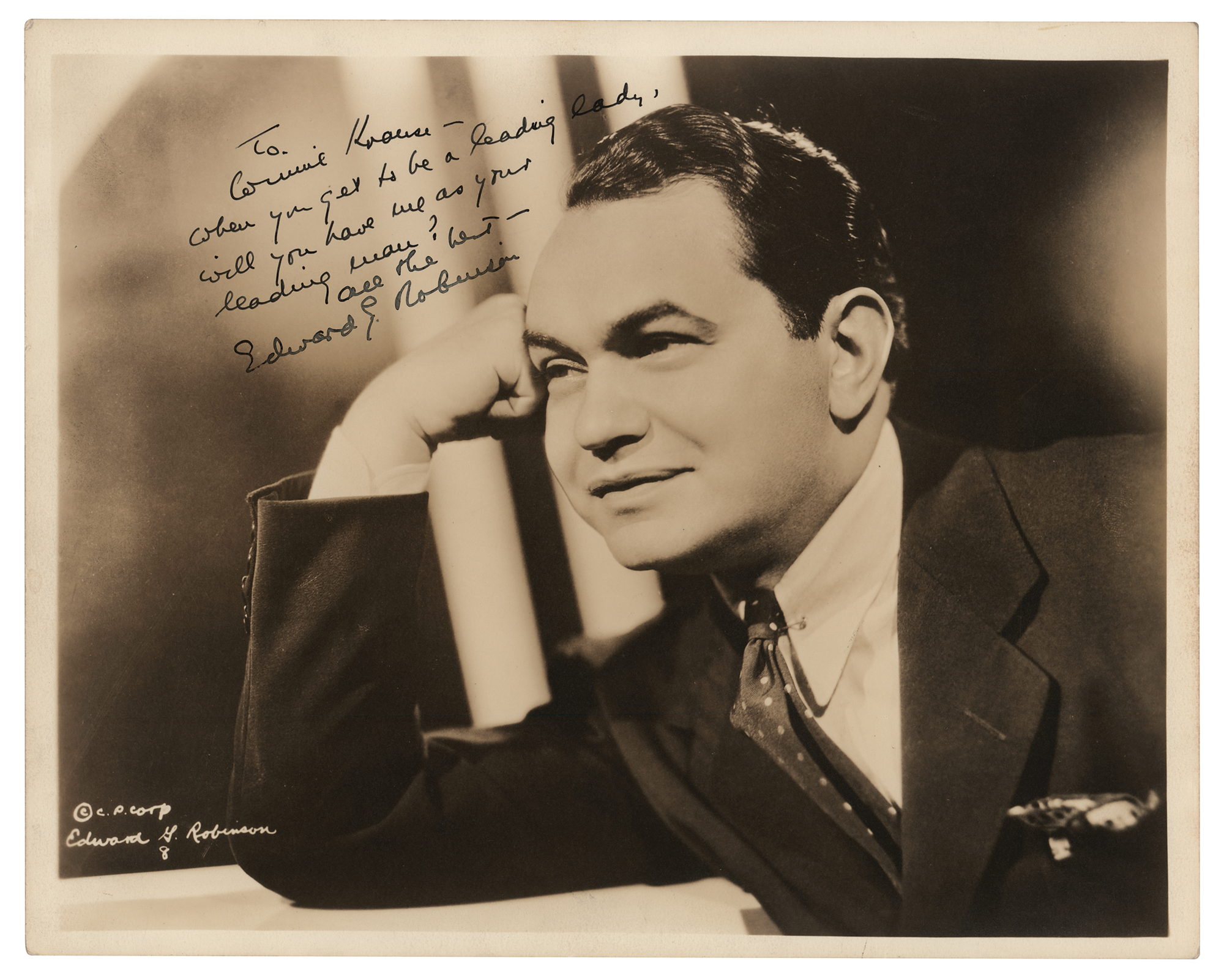 Fantastic vintage matte-finish 10 x 8 photo of the great tough-guy actor leaning on a closed fist, warmly signed and inscribed in fountain pen to an aspiring actress, "To Connie Krauss—when you get to be a leading lady, will you have me as your leading man? All the best—Edward G. Robinson.” In fine condition, with a couple of very light bends touching Robinson's shoulder.