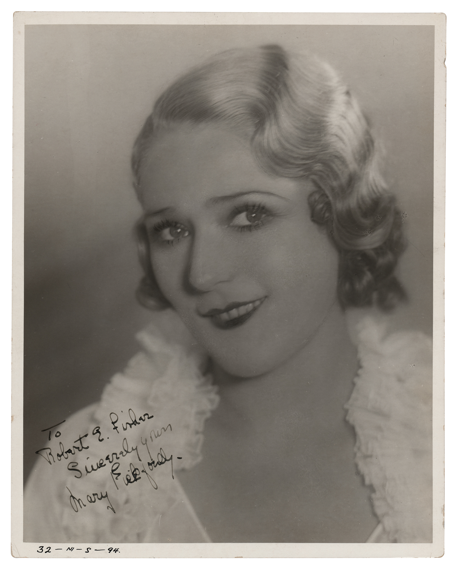 Attractive vintage glossy 8 x 10 photo of Pickford dressed in a frilly blouse, signed and inscribed in fountain pen, "To Robert E. Fisher, Sincerely Yours, Mary Pickford.” In fine condition.