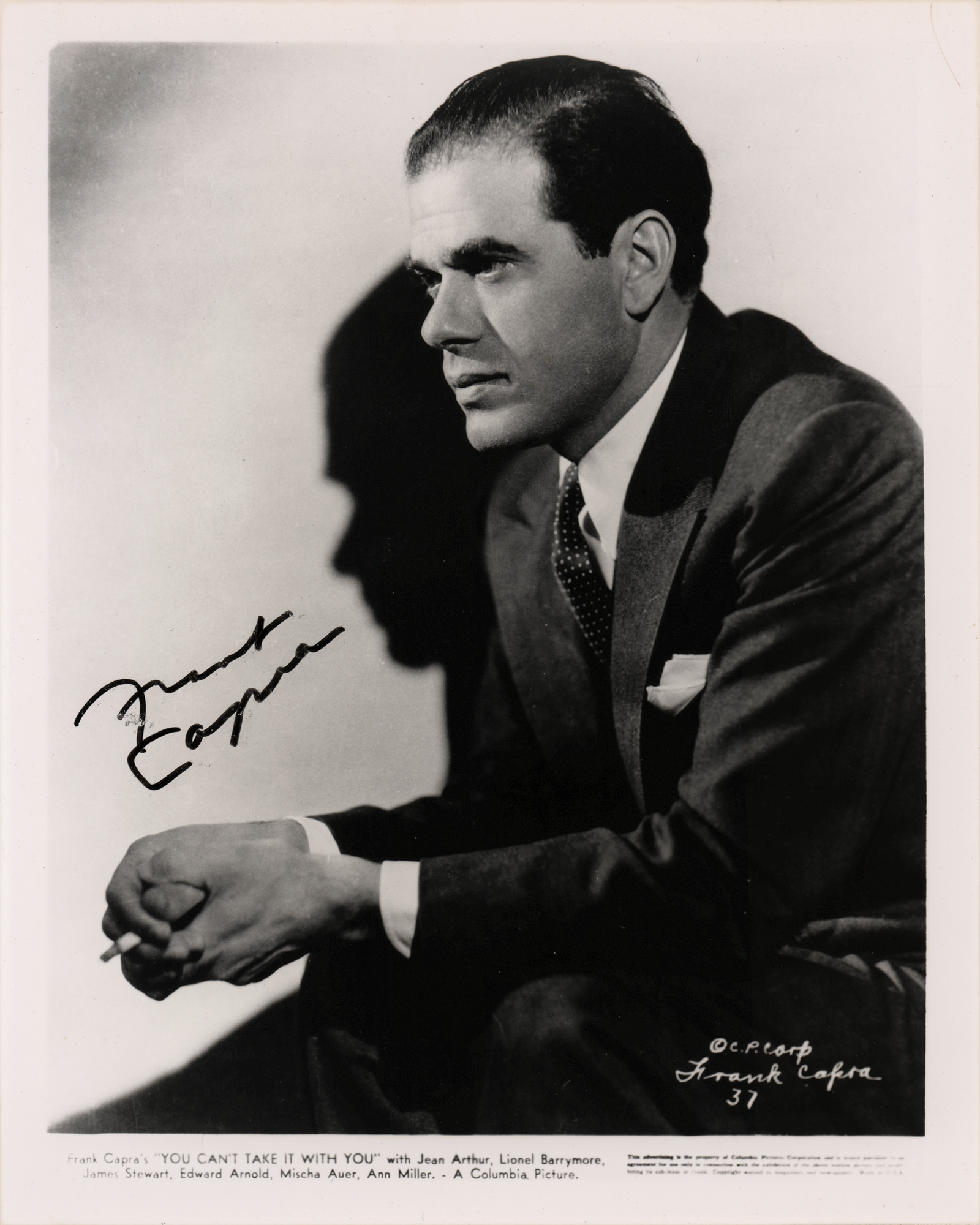 Glossy 8 x 10 photo of Frank Capra in a seated pose for his 1938 romantic comedy You Can't Take It With You, signed in black felt tip. In fine condition.