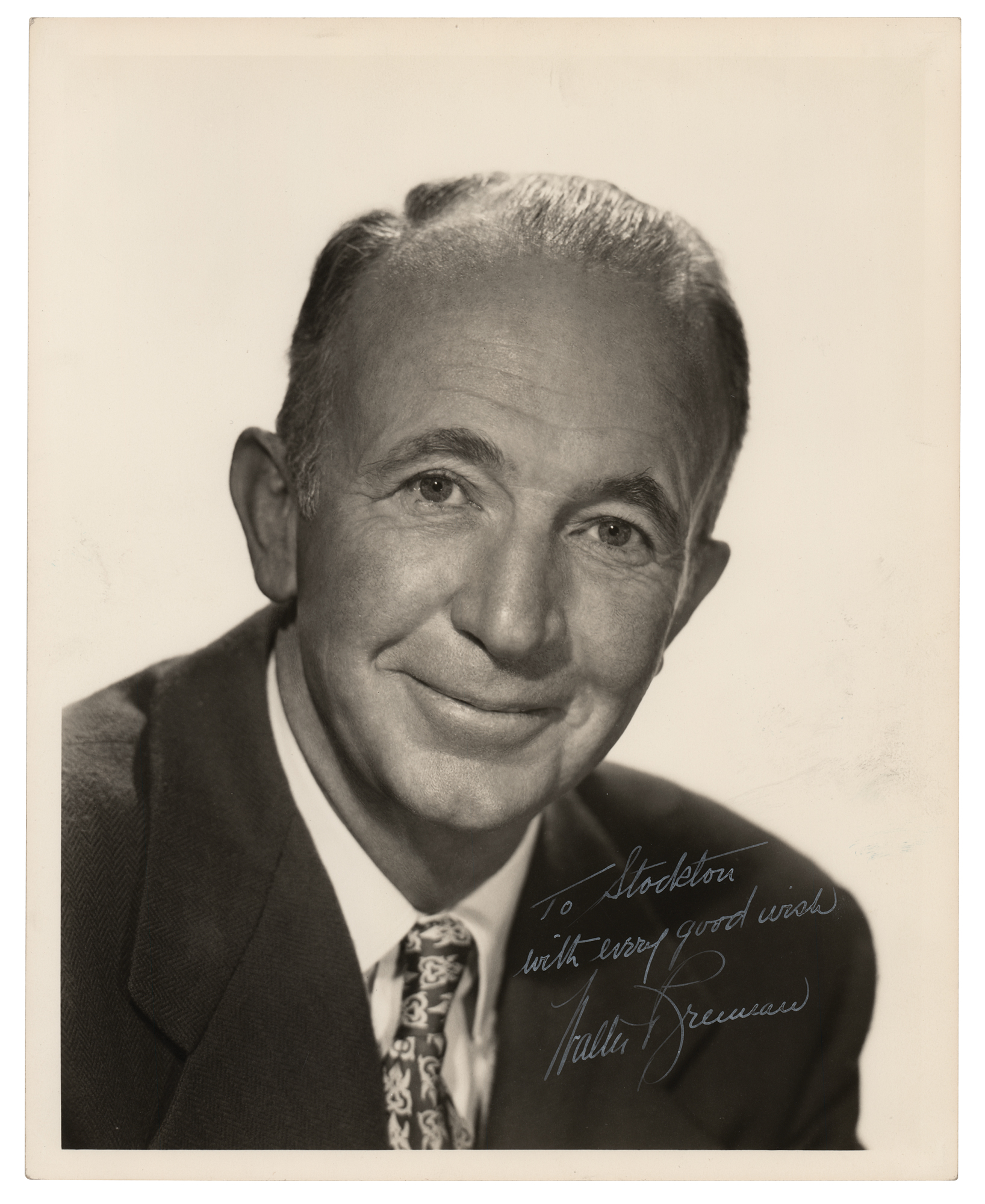 Vintage matte-finish 8 x 10 photo of the Oscar-winning actor in a suit and tie, neatly signed and inscribed in white ink, "To Stockton, with every good wish, Walter Brennan.” In very fine condition.