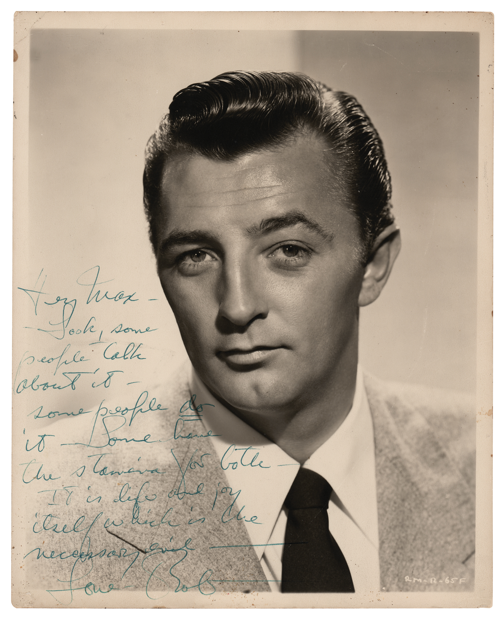 Sharp vintage matte-finish 8 x 10 photo of the popular actor in a suit and tie, signed and inscribed in blue ballpoint, "Hey Max—Look, some people talk about it—some people do it—some have the stamina for both—It is life and joy itself which is the necessary evil—Love—Bob.” In fine condition, with a small crease to the upper left corner tip.