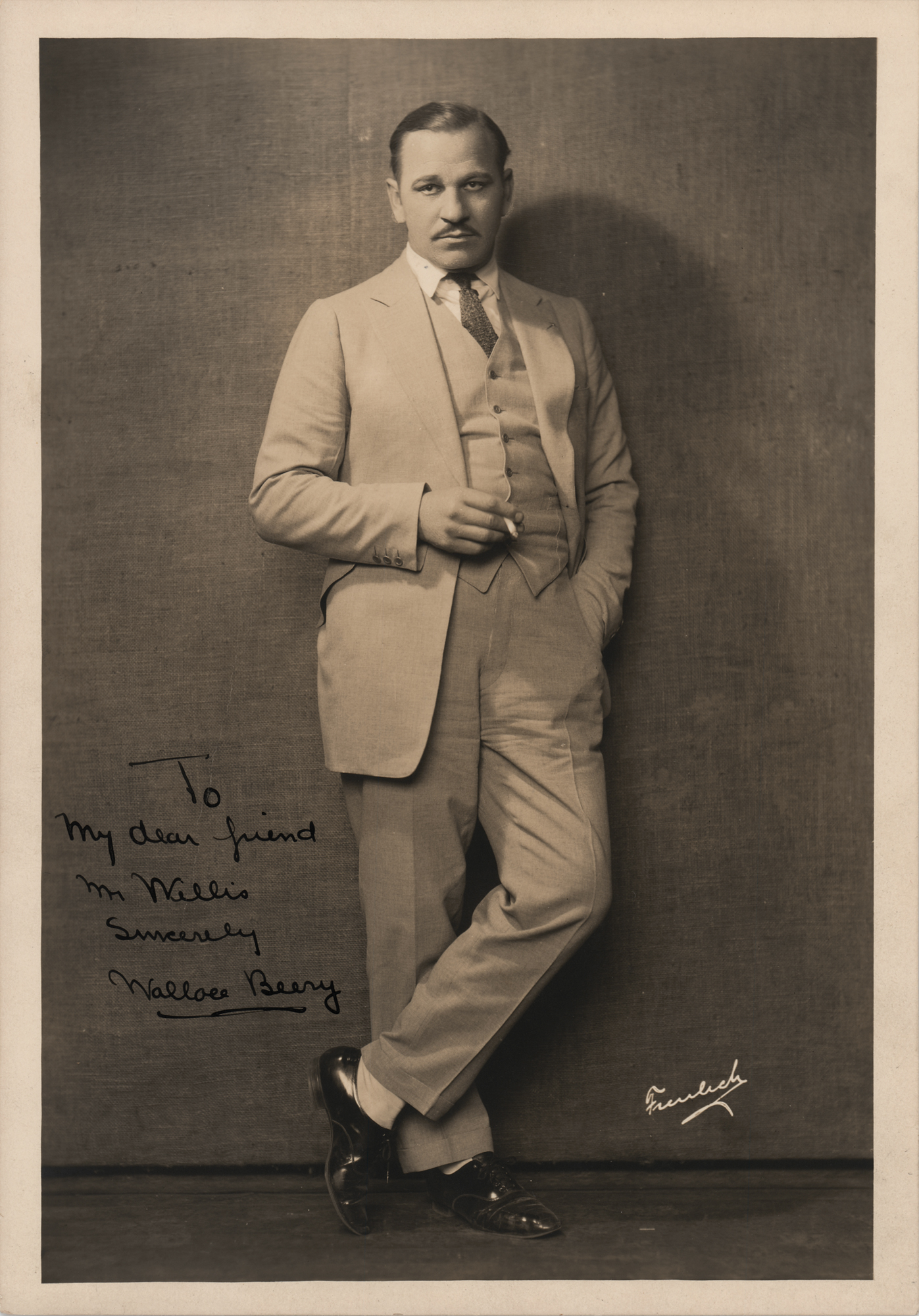 Handsome vintage matte-finish 7 x 10 full-length photo of the actor with a cigarette in hand, signed and inscribed in fountain pen, "To my dear friend, Mr. Willis, Sincerely, Wallace Beery.” In very fine condition.