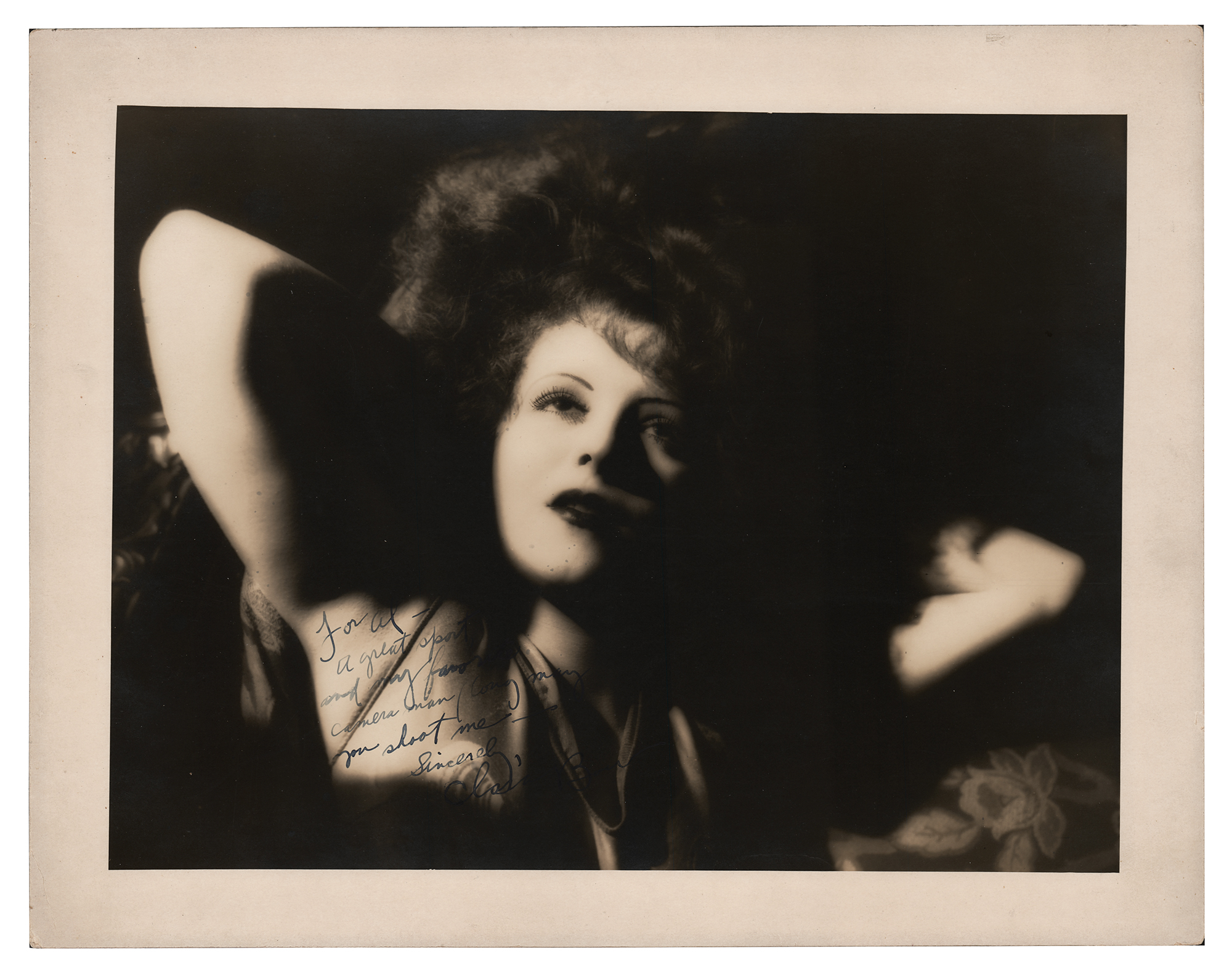 Marvelous vintage matte-finish 14 x 11 photo of the Hollywood icon striking a glamorous pose, signed and inscribed in fountain pen, "For Al—a great sport and my favorite camera man (long may you shoot me)—Sincerely, Clara Bow.” Affixed to a same-size mount and in very good to fine condition, with light silvering and a few surface creases. A superb presentation piece from Hollywood's original 'It Girl.'