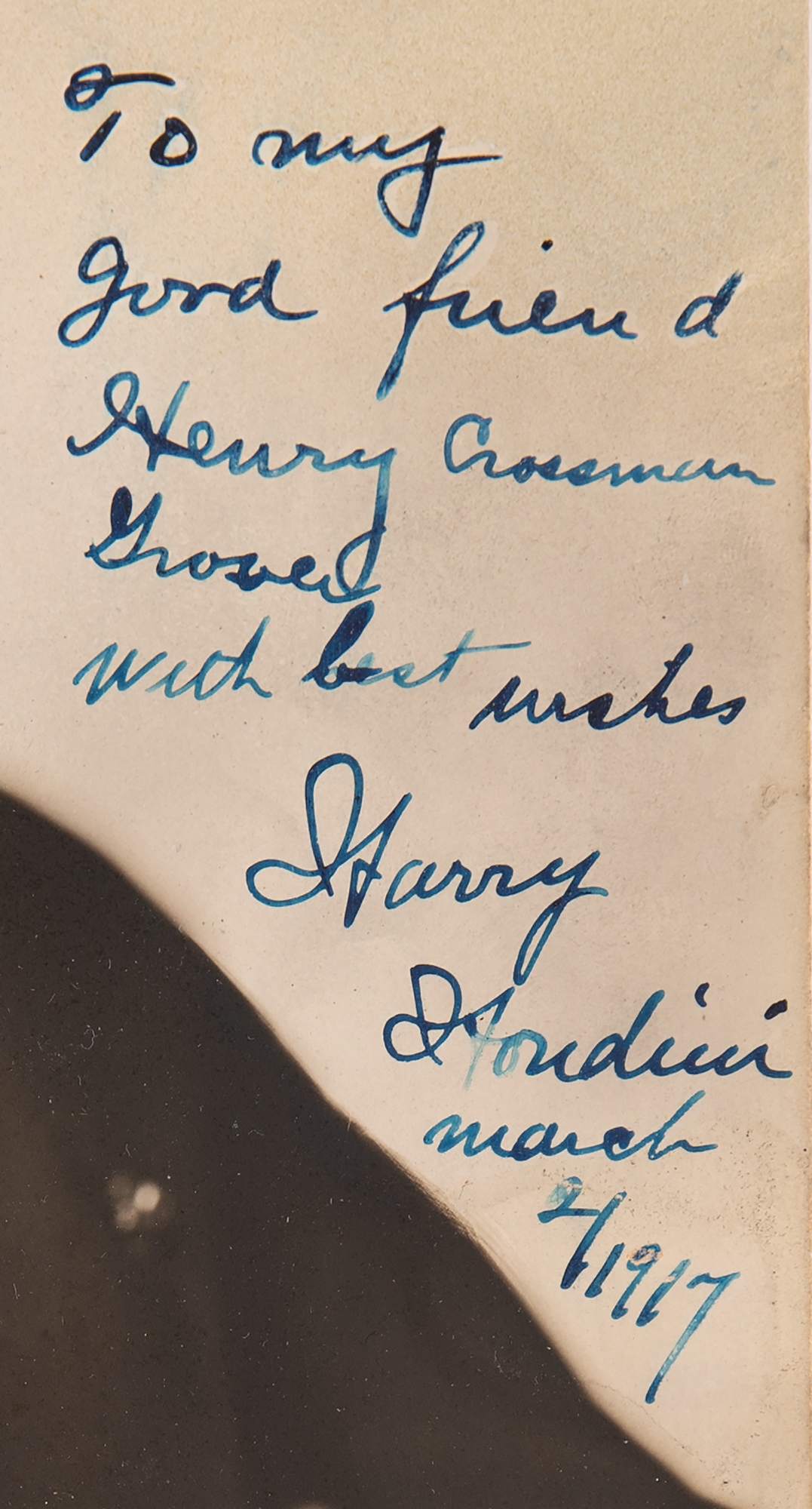Circa 1915 vintage matte-finish 7 x 9 portrait photo of Houdini by the LaPine Studios of Seattle, Washington, showing the master magician with folded arms in a confident half-length pose, signed and inscribed in blue fountain pen, “To my good friend Henry Crossman Grover, with best wishes, Harry Houdini, March 2/17.” Professionally cleaned and restored to near-fine condition. An exceptional signed photo of Houdini in his prime, presented to Henry Crossman Grover, the illustrator of Houdini’s 1906 book The Right Way to Do Wrong: An Exposé of Successful Criminals.